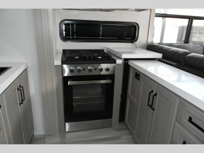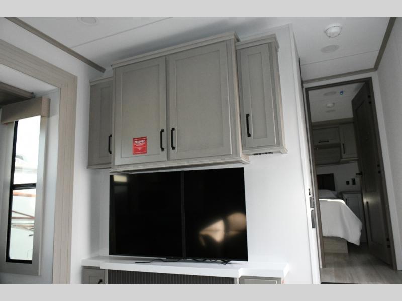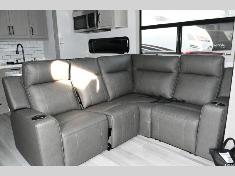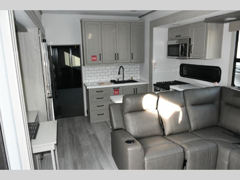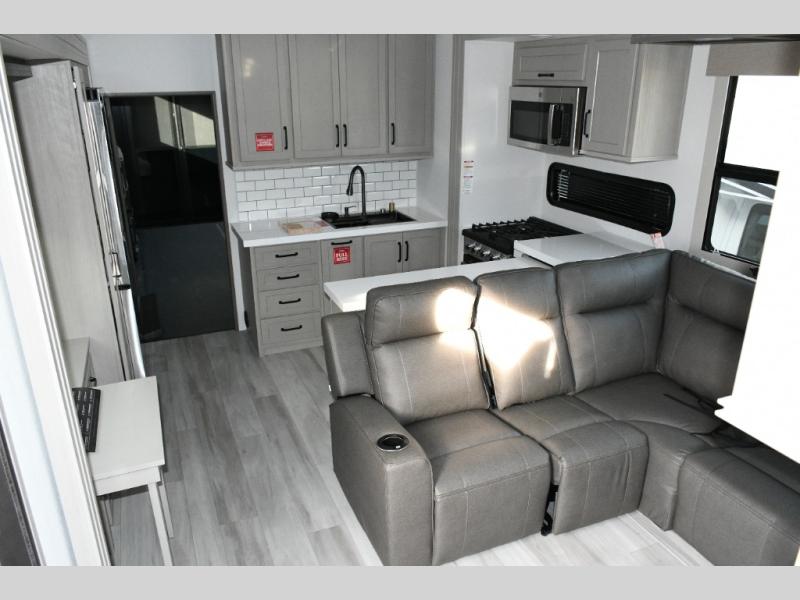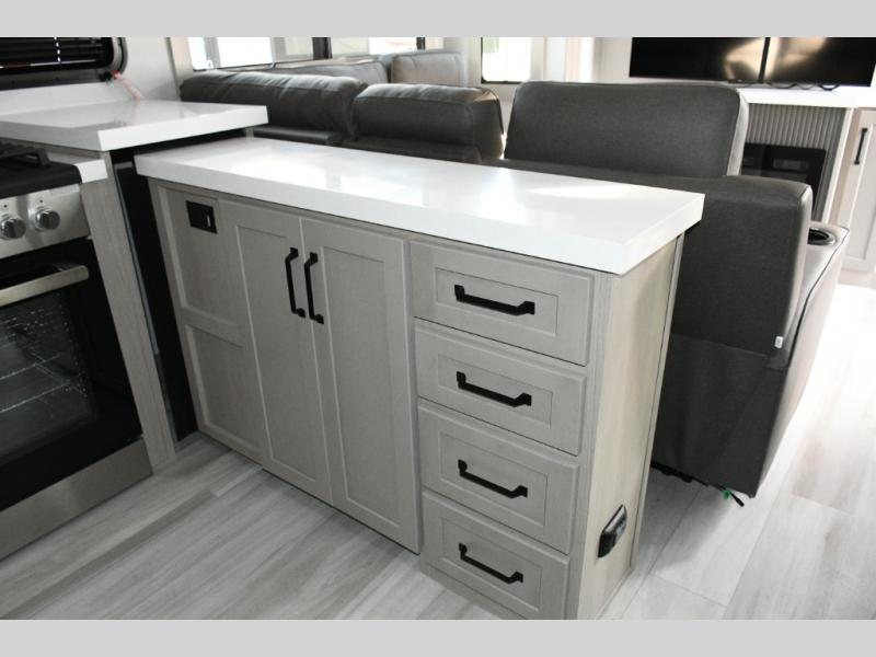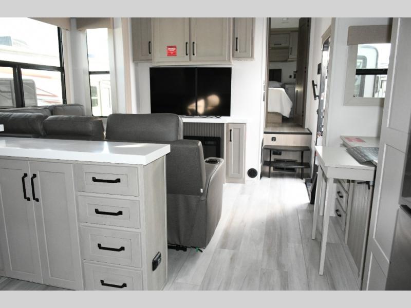 Inside the main living area, dual opposing slides create an open, residential feel. Relax on the L-shaped reclining sofa across from the 50" TV, or take advantage of the hybrid desk/dinette for working on the road. The spacious kitchen is a standout, featuring expansive countertops, a 20 cu. ft. refrigerator, and a large pantry—perfect for extended trips or full-time use.