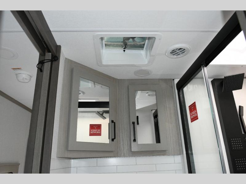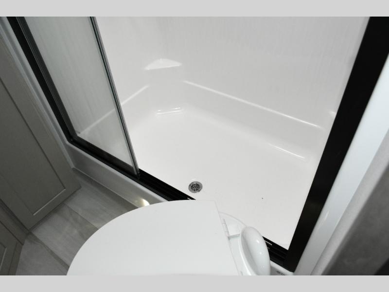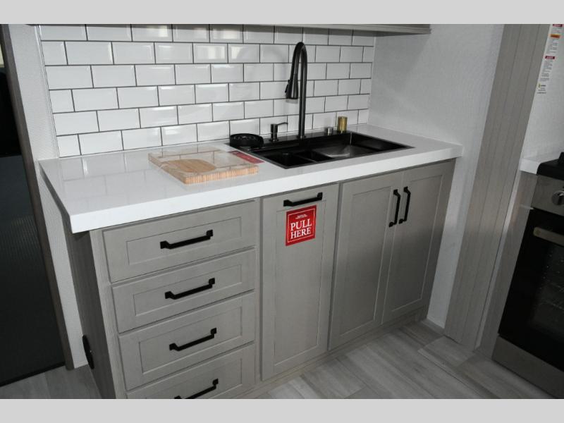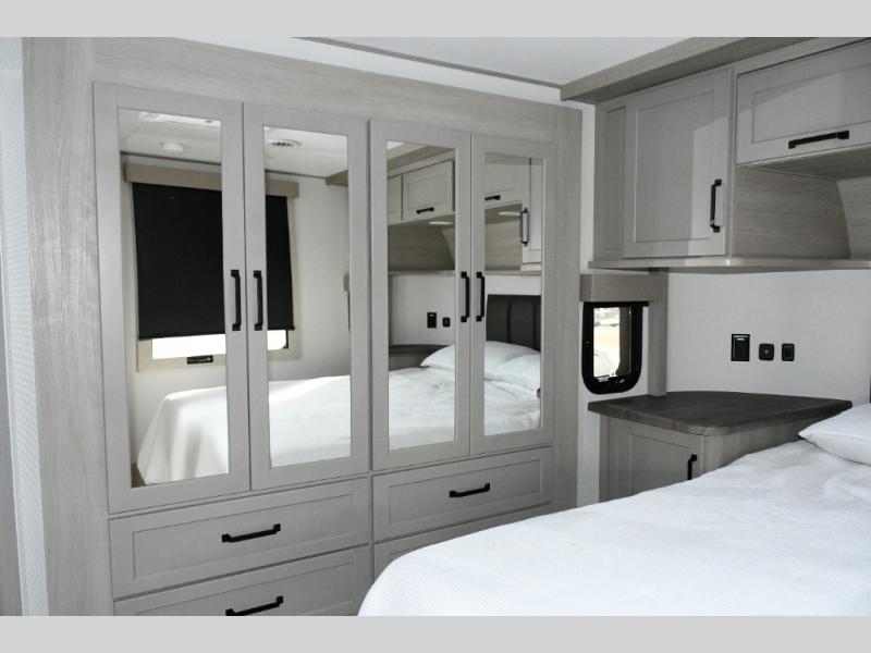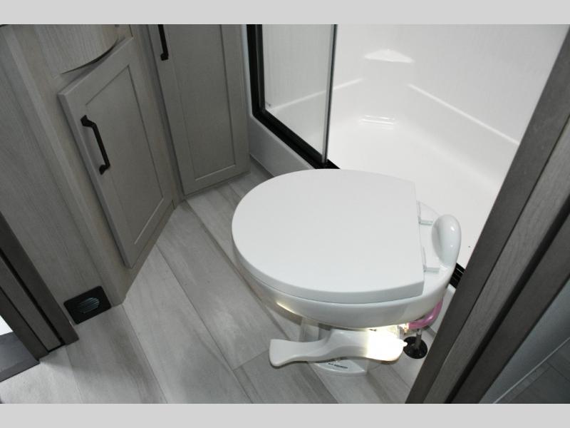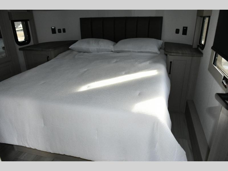 Up front, the private master bedroom offers a peaceful retreat with a queen bed (with optional king upgrade), a slide-out for added floor space, and ample drawers and storage to keep everything organized.