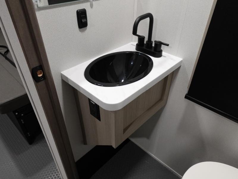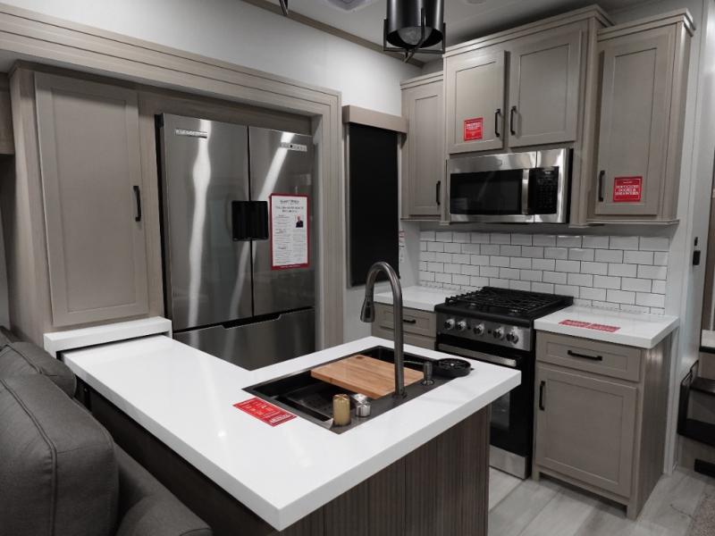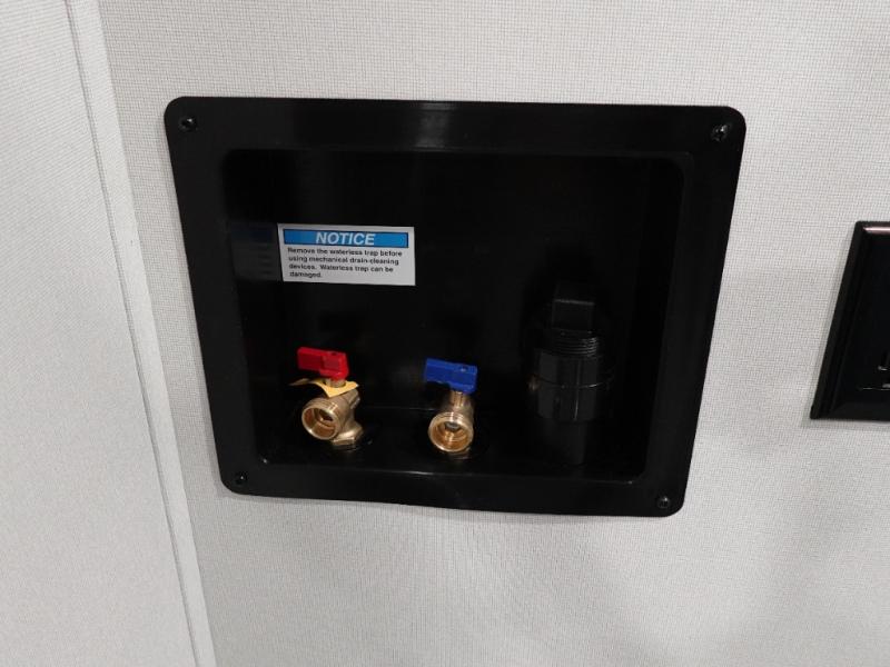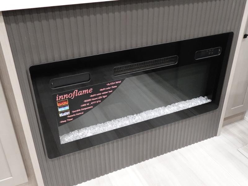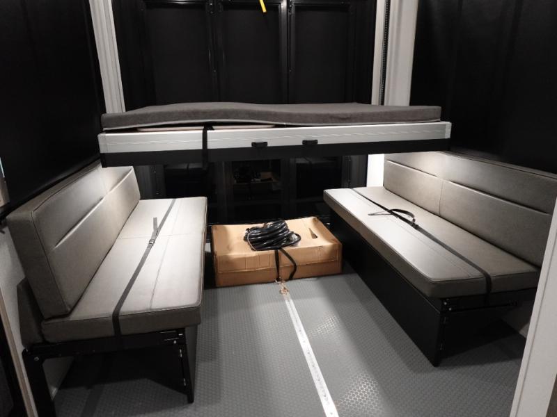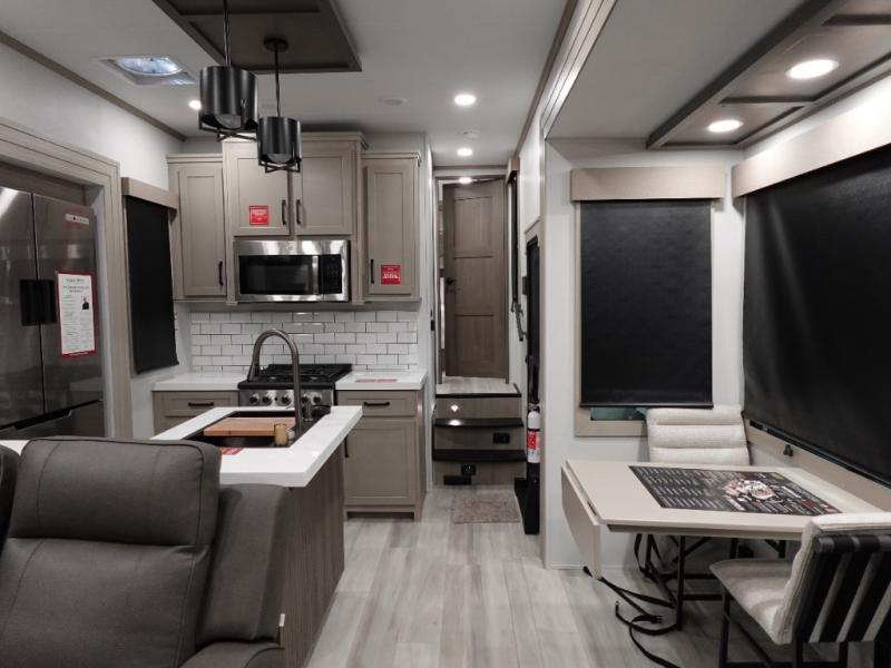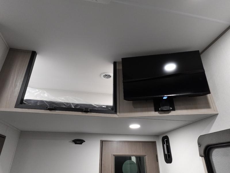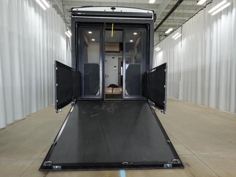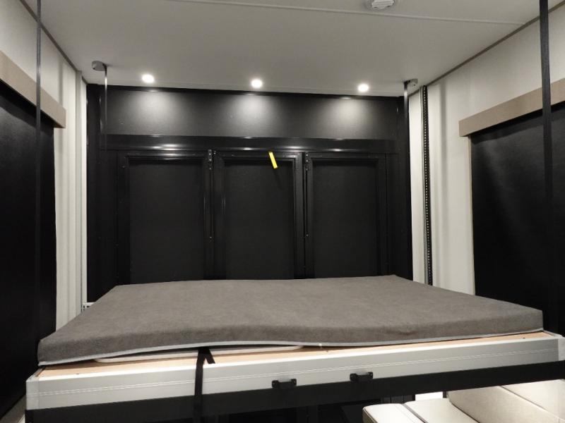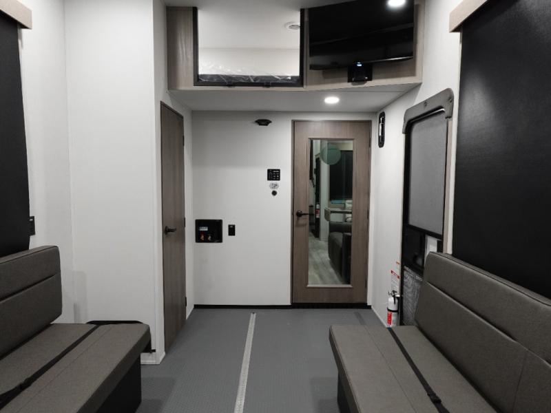 You want a toy hauler to carry your toys to the trails, and include many at-home comforts, and that's just what this unit delivers. A 14' separate garage includes an adjustable tie-down system, an optional Lifesuite System for more sleeping space, an optional half bath, plus washer and dryer prep. There is an overhead loft bed and an L-shaped sofa with recline in the main living area that offers sleeping space as well. Everyone can watch a movie on the LED TV with a fireplace below while sitting on the sofa, in the theatre seats, or while at the free standing dinette with four chairs. The chef will have upgraded appliances to make meals for everyone, an L-shaped countertop with a kitchen sink, and a USB charging outlet. You will love the shower with seat in the full bathroom with two space savings sliding doors that lead into the hallway, and into the front bedroom where you will have a walk-around queen bed, a slide out wardrobe and more USB charging outlets.