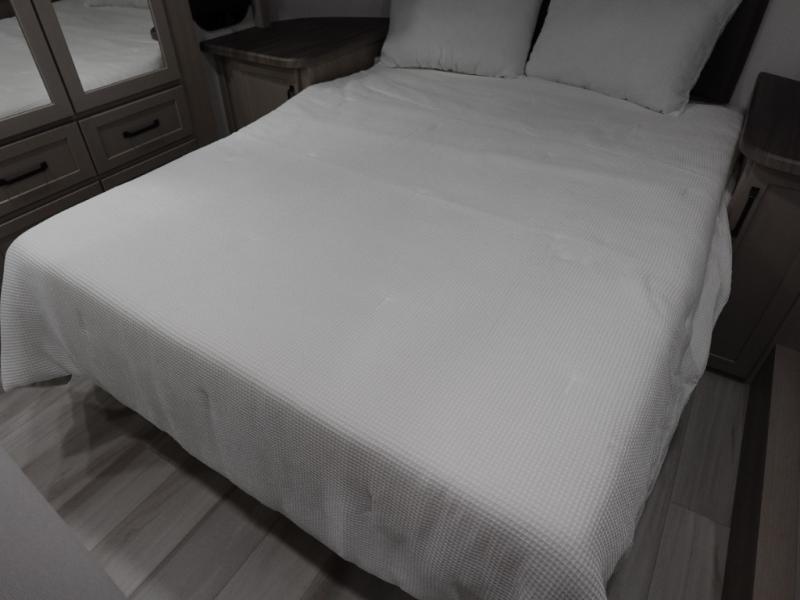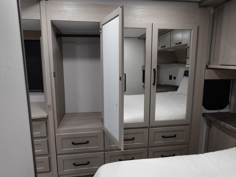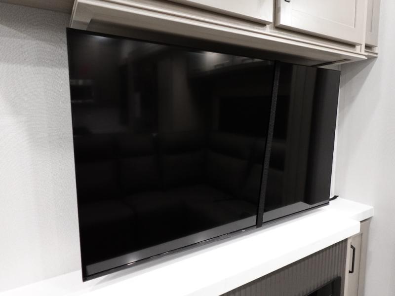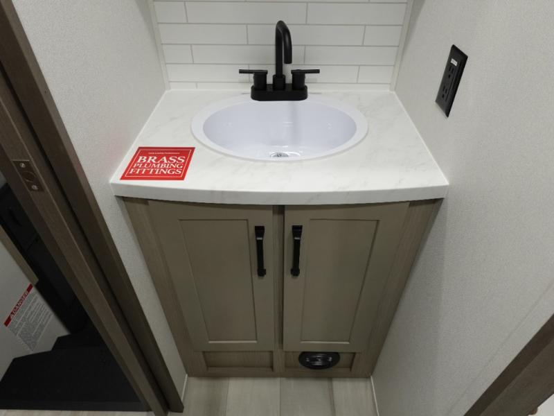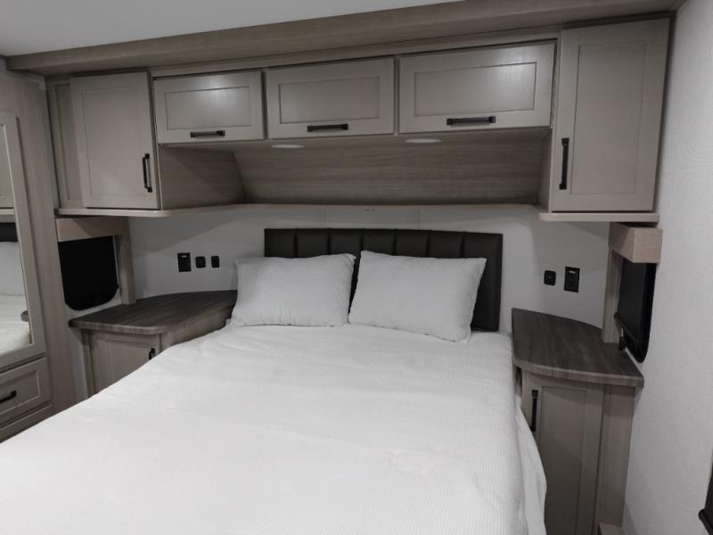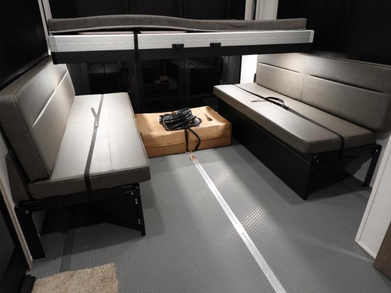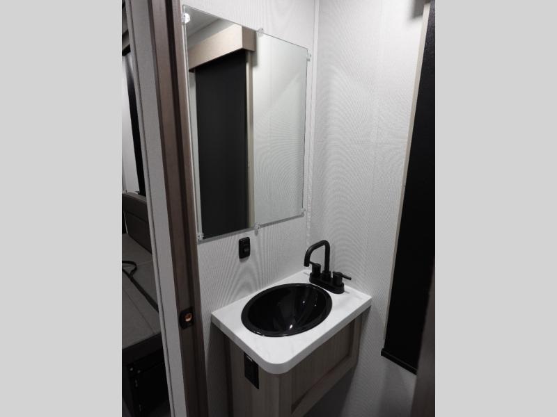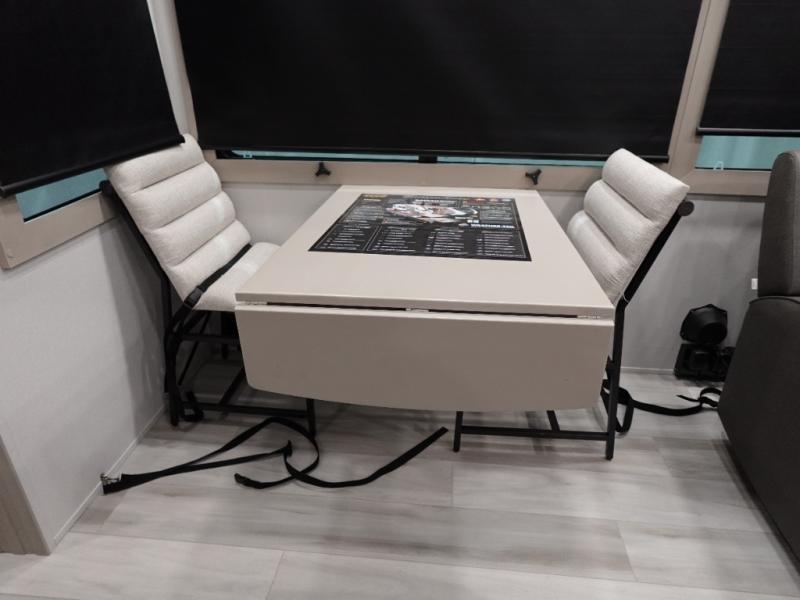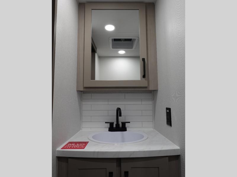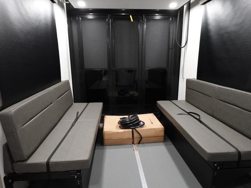 You want a toy hauler to carry your toys to the trails, and include many at-home comforts, and that's just what this unit delivers. A 14' separate garage includes an adjustable tie-down system, an optional Lifesuite System for more sleeping space, an optional half bath, plus washer and dryer prep. There is an overhead loft bed and an L-shaped sofa with recline in the main living area that offers sleeping space as well. Everyone can watch a movie on the LED TV with a fireplace below while sitting on the sofa, in the theatre seats, or while at the free standing dinette with four chairs. The chef will have upgraded appliances to make meals for everyone, an L-shaped countertop with a kitchen sink, and a USB charging outlet. You will love the shower with seat in the full bathroom with two space savings sliding doors that lead into the hallway, and into the front bedroom where you will have a walk-around queen bed, a slide out wardrobe and more USB charging outlets.