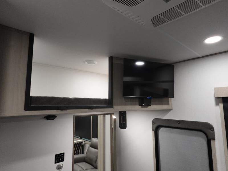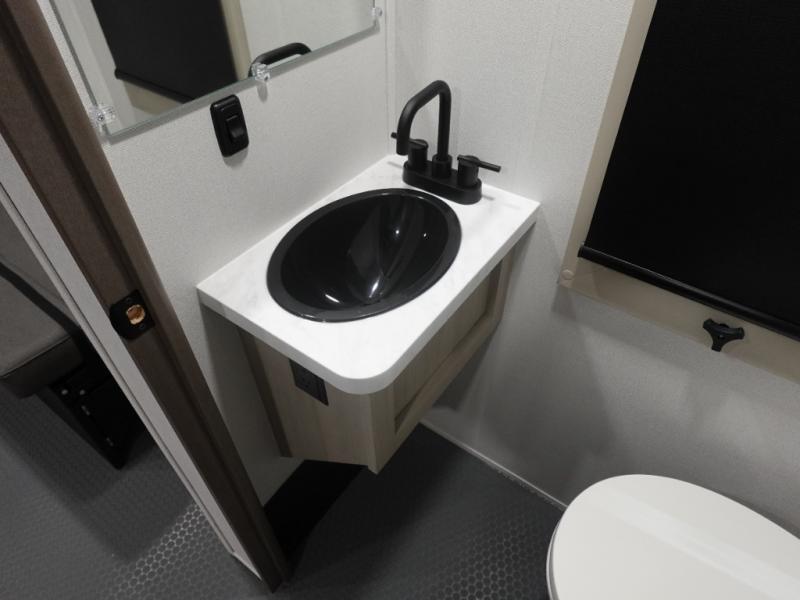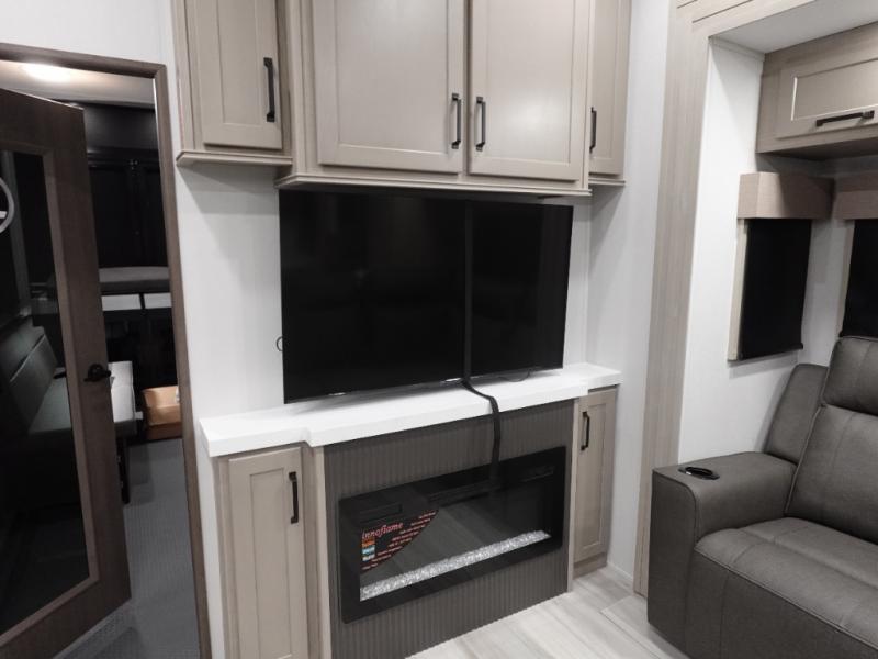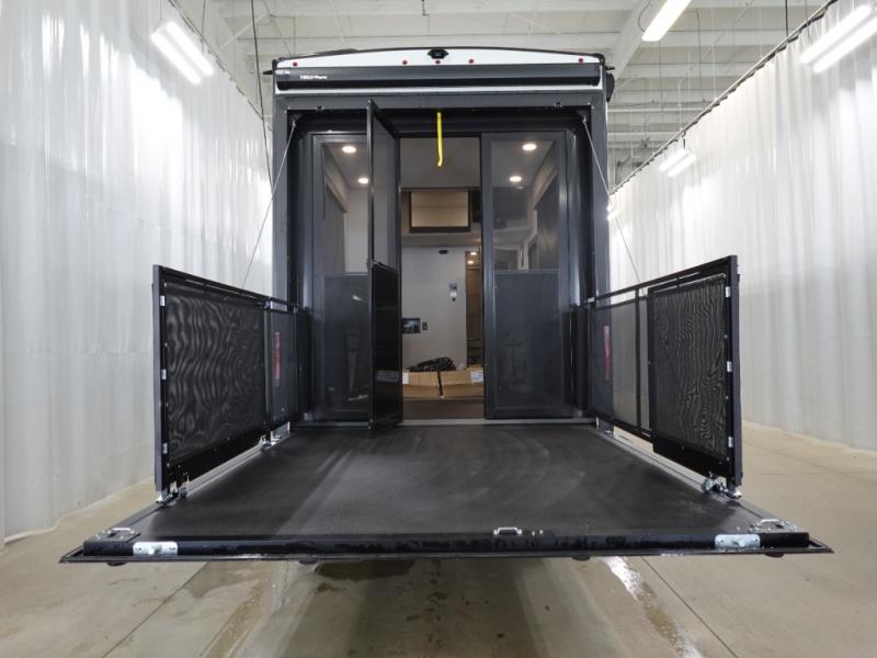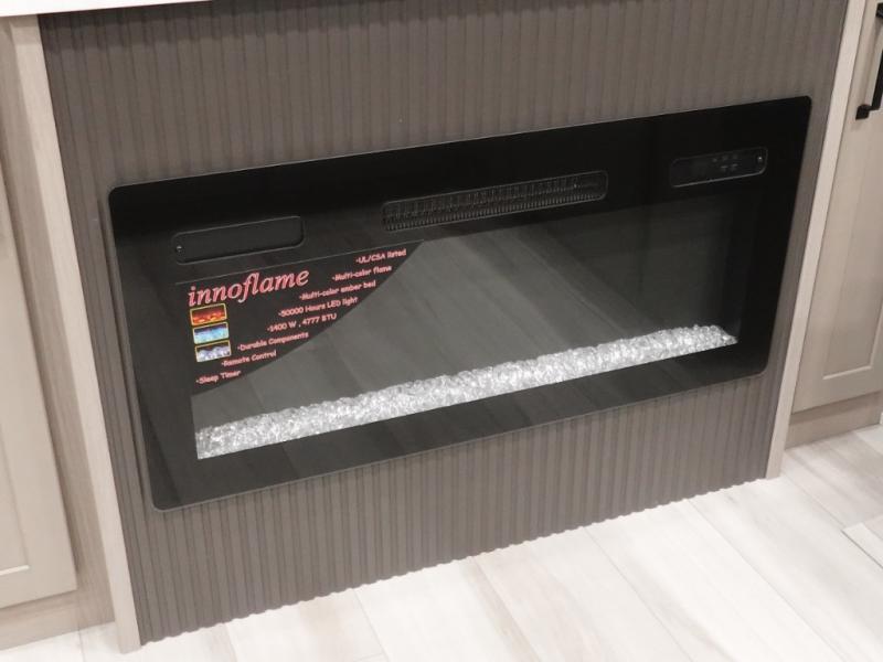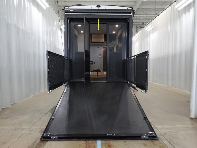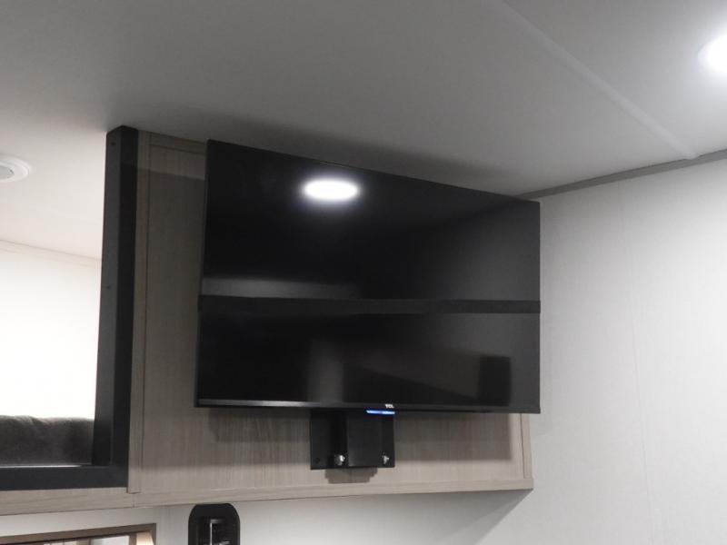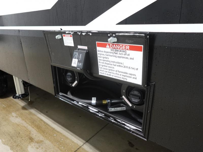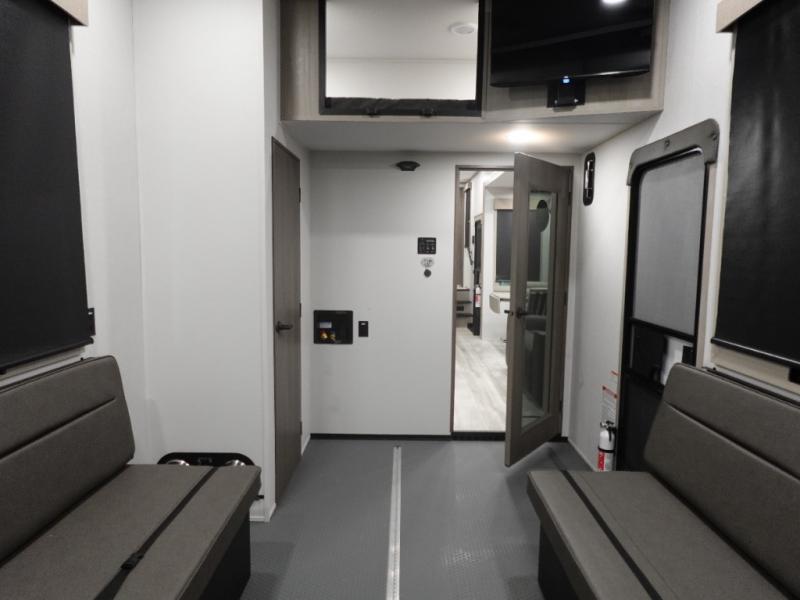 You want a toy hauler to carry your toys to the trails, and include many at-home comforts, and that's just what this unit delivers. A 14' separate garage includes an adjustable tie-down system, an optional Lifesuite System for more sleeping space, an optional half bath, plus washer and dryer prep. There is an overhead loft bed and an L-shaped sofa with recline in the main living area that offers sleeping space as well. Everyone can watch a movie on the LED TV with a fireplace below while sitting on the sofa, in the theatre seats, or while at the free standing dinette with four chairs. The chef will have upgraded appliances to make meals for everyone, an L-shaped countertop with a kitchen sink, and a USB charging outlet. You will love the shower with seat in the full bathroom with two space savings sliding doors that lead into the hallway, and into the front bedroom where you will have a walk-around queen bed, a slide out wardrobe and more USB charging outlets.