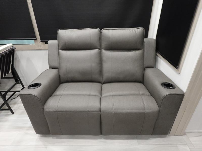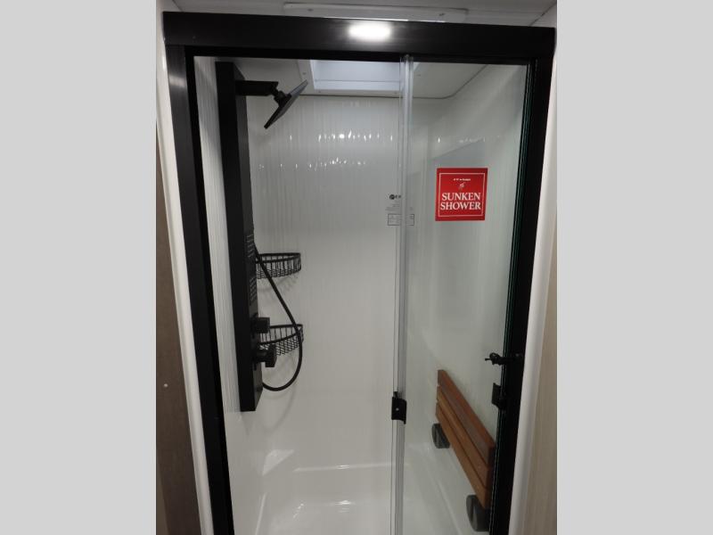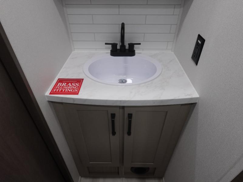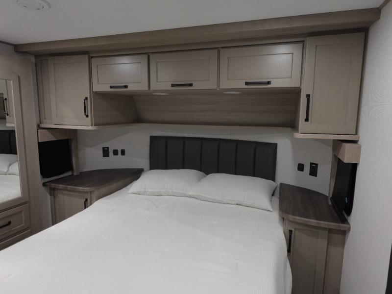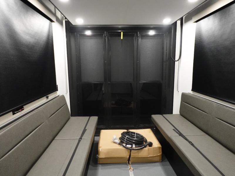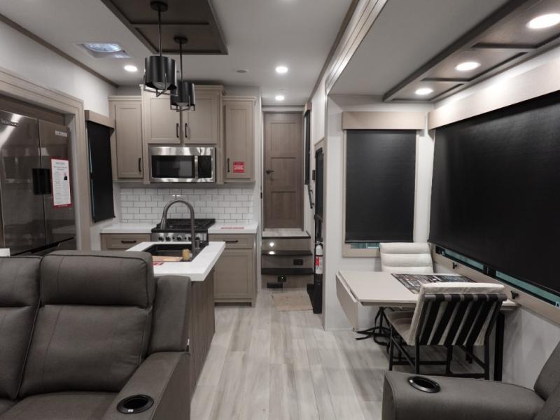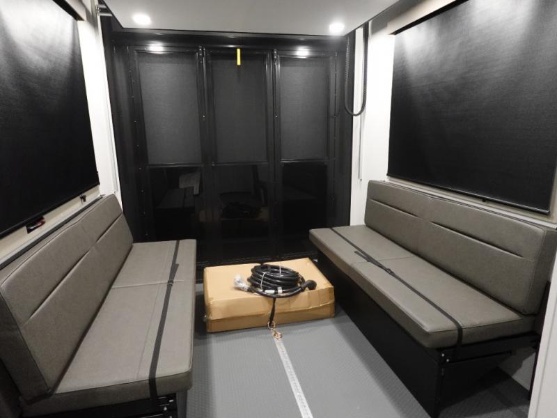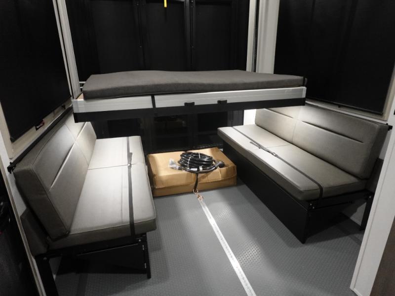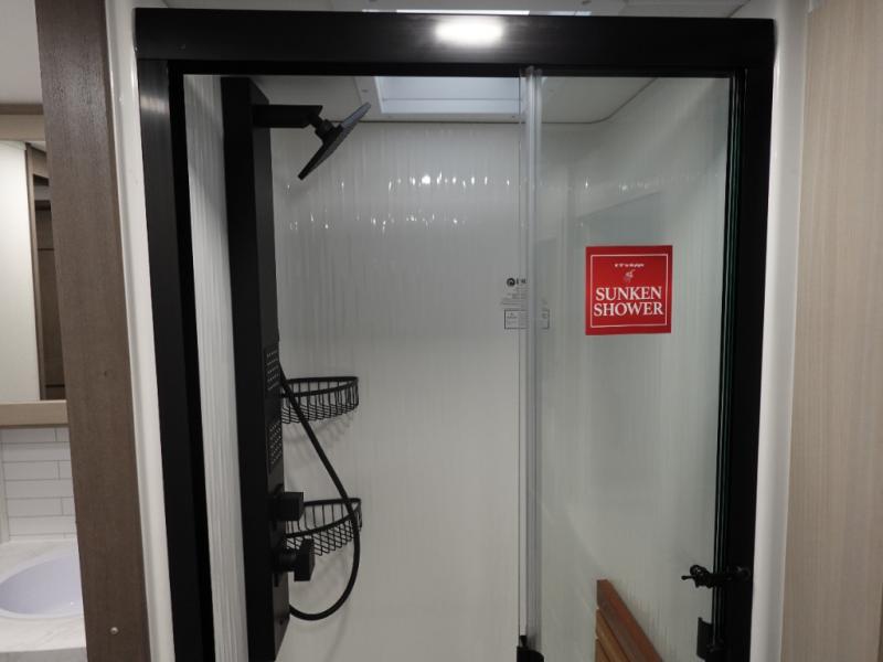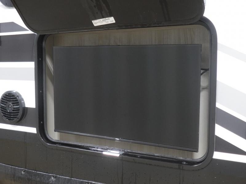 You want a toy hauler to carry your toys to the trails, and include many at-home comforts, and that's just what this unit delivers. A 14' separate garage includes an adjustable tie-down system, an optional Lifesuite System for more sleeping space, an optional half bath, plus washer and dryer prep. There is an overhead loft bed and an L-shaped sofa with recline in the main living area that offers sleeping space as well. Everyone can watch a movie on the LED TV with a fireplace below while sitting on the sofa, in the theatre seats, or while at the free standing dinette with four chairs. The chef will have upgraded appliances to make meals for everyone, an L-shaped countertop with a kitchen sink, and a USB charging outlet. You will love the shower with seat in the full bathroom with two space savings sliding doors that lead into the hallway, and into the front bedroom where you will have a walk-around queen bed, a slide out wardrobe and more USB charging outlets.
