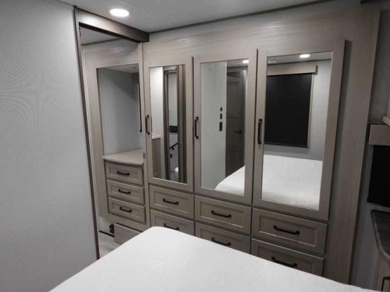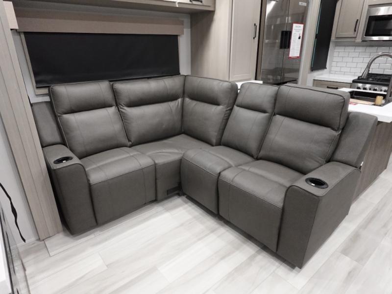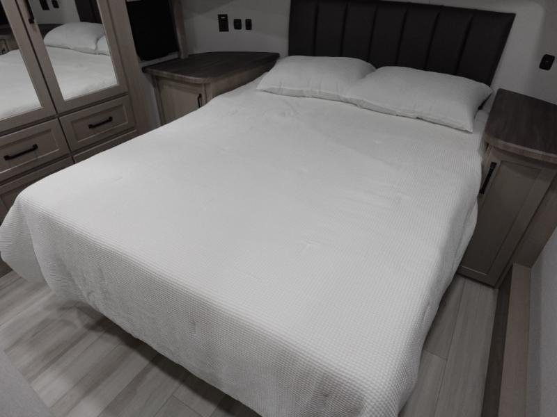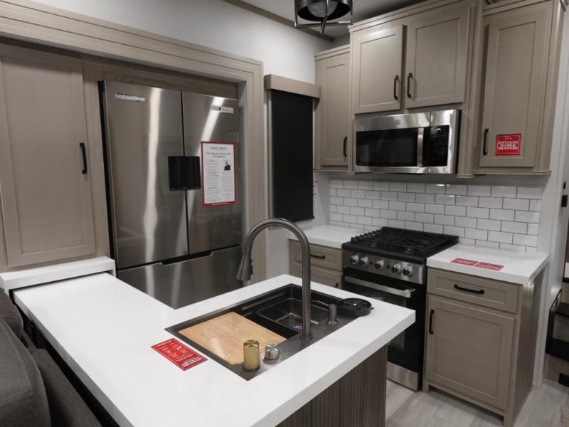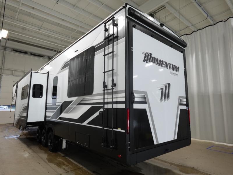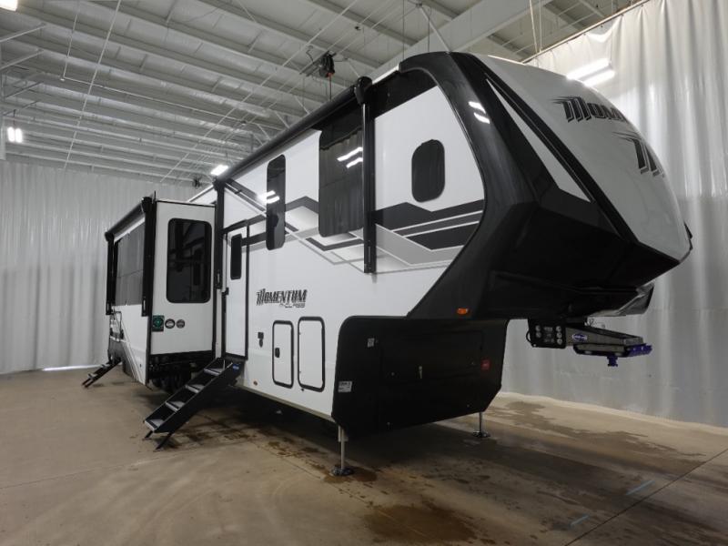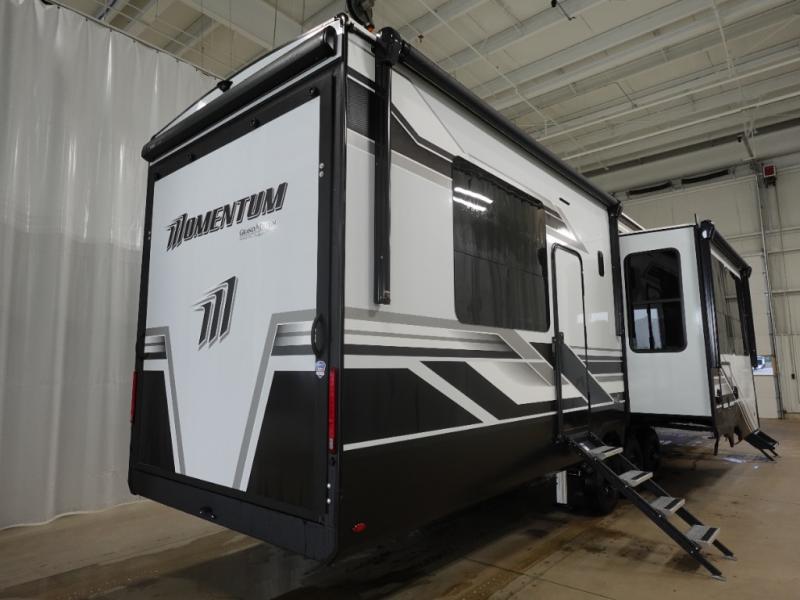 With any Momentum M-Class toy hauler by Grand Design, you will enjoy luxury at every turn! They have been constructed to a superior standard with a thermal roof design, triple insulated main floor and garage floor, and a Rail-Tite underbelly seal that will allow you to camp in all elements. Each model also features an 8' 5" wide body chassis with a wide rail design, no wheel wheels, and a dovetail entry for easier loading. The Stealth A/C system provides maximum cooling power, and the CRE3000 suspension system means you can enjoy a smooth tow each time. You will love the luxurious interior with a professional grade stainless steel cooktop, interior color changing LED accent lighting, a fiberglass shower with a glass door, and solid surface countertops.