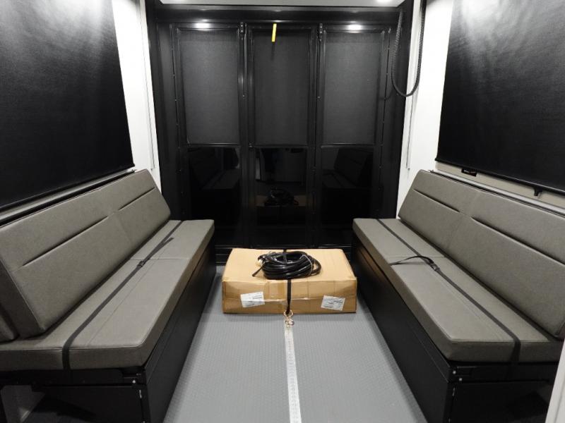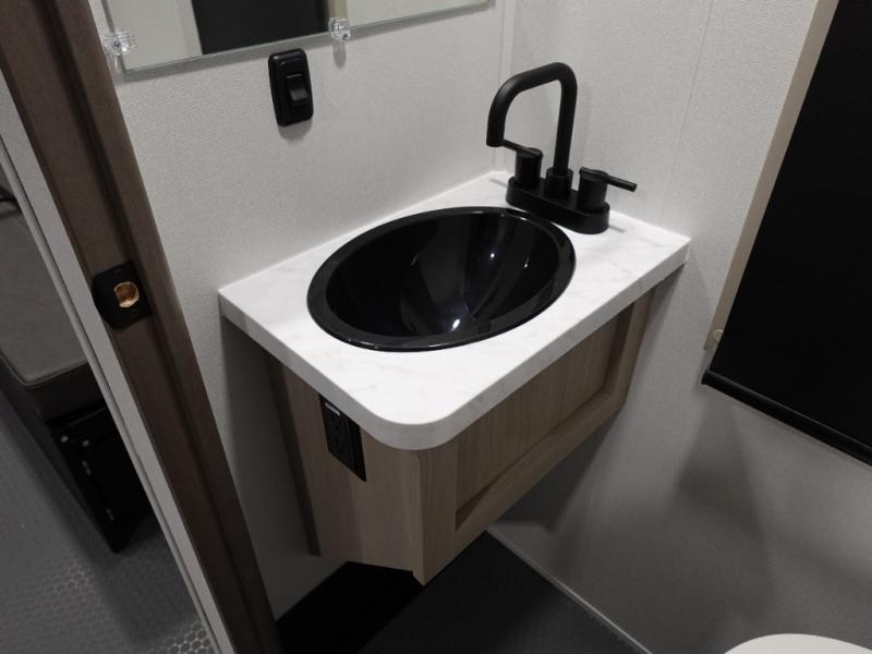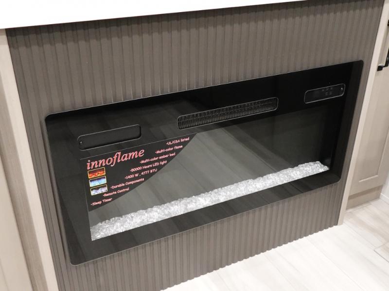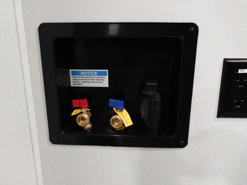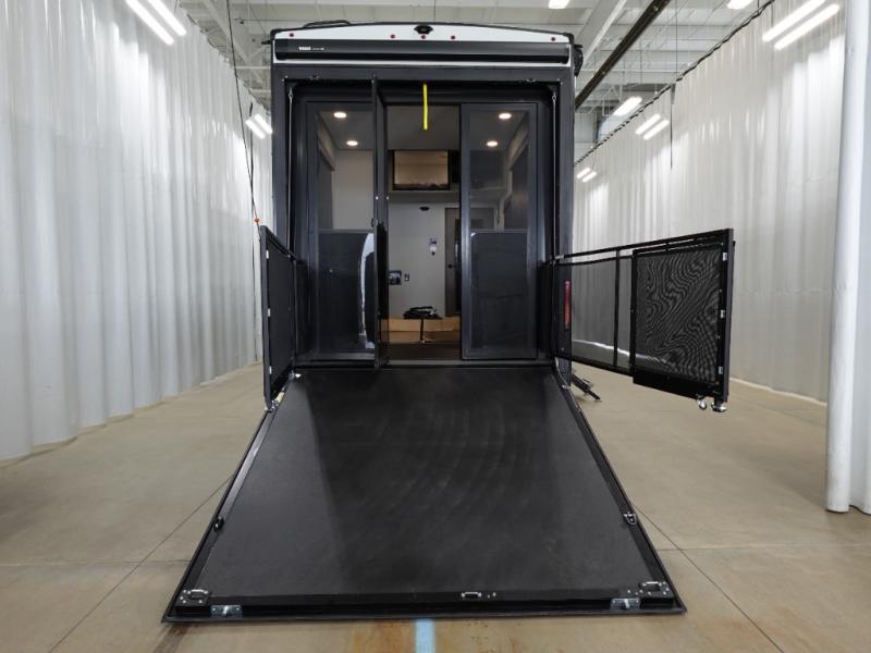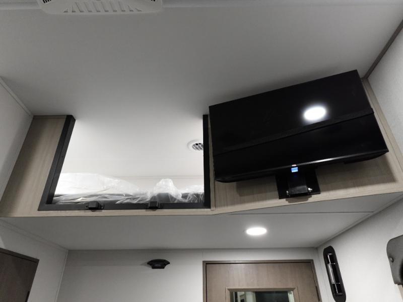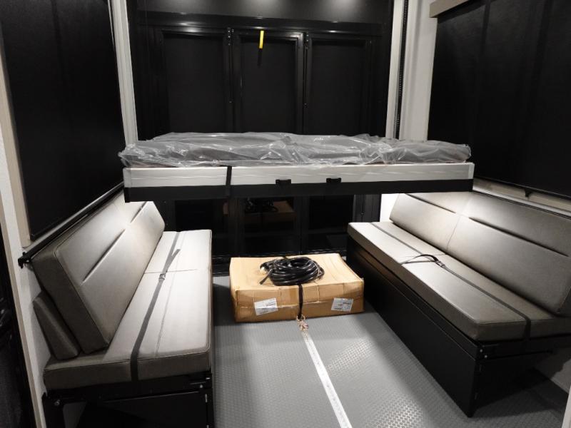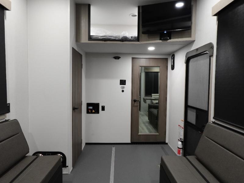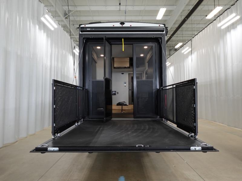 You want a toy hauler to carry your toys to the trails, and include many at-home comforts, and that's just what this unit delivers. A 14' separate garage includes an adjustable tie-down system, a half bath, plus washer and dryer prep. There is an overhead loft bed and an L-shaped sofa with recline in the main living area that offers sleeping space as well. Everyone can watch a movie on the LED TV with a fireplace below while sitting on the sofa, in the theatre seats, or while at the free standing dinette with four chairs. The chef will have upgraded appliances to make meals for everyone, an L-shaped countertop with a kitchen sink, and a USB charging outlet. You will love the shower with seat in the full bathroom with two space savings sliding doors that lead into the hallway, and into the front bedroom where you will have a walk-around queen bed, a slide out wardrobe and more USB charging outlets.