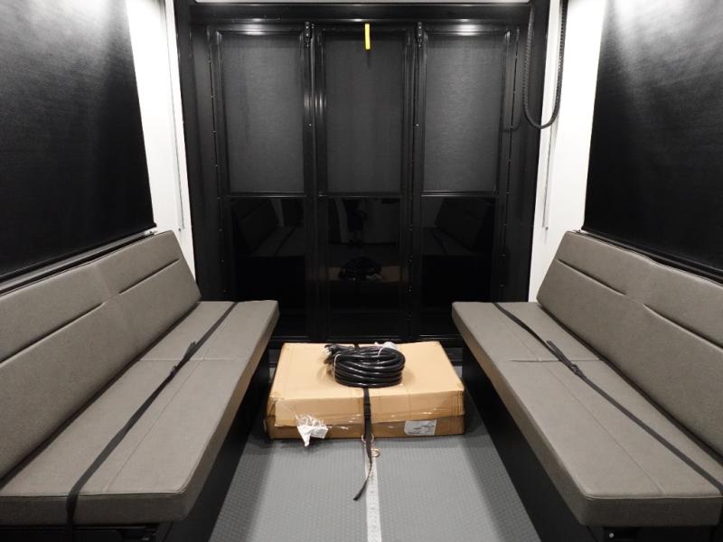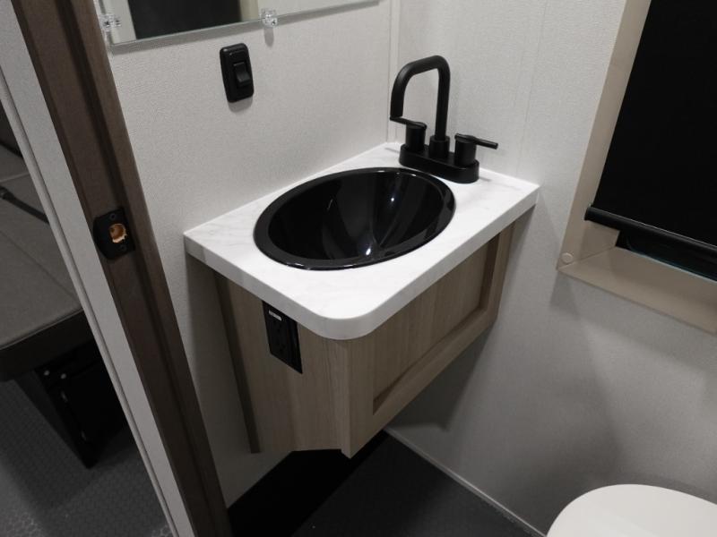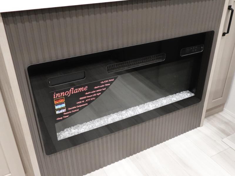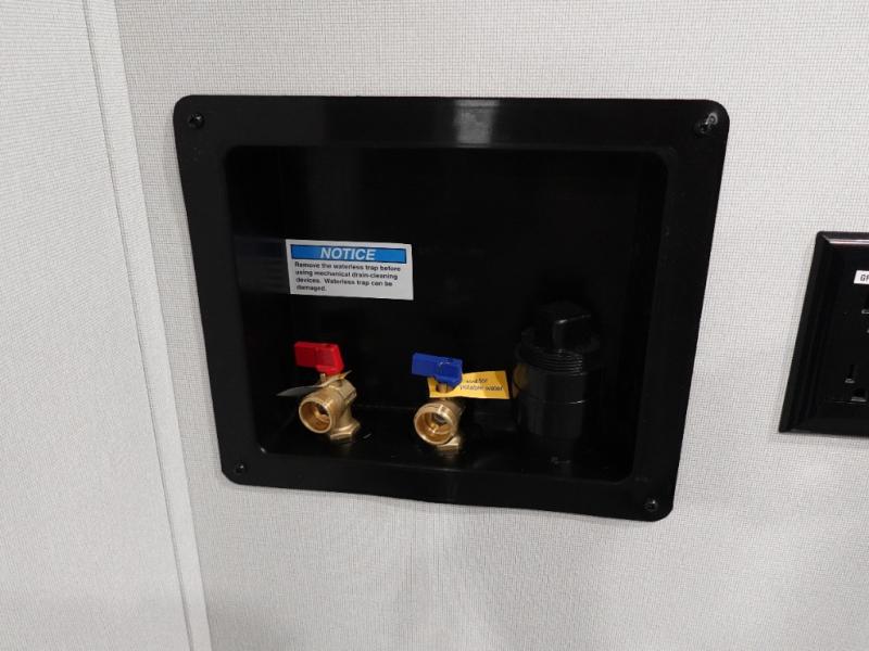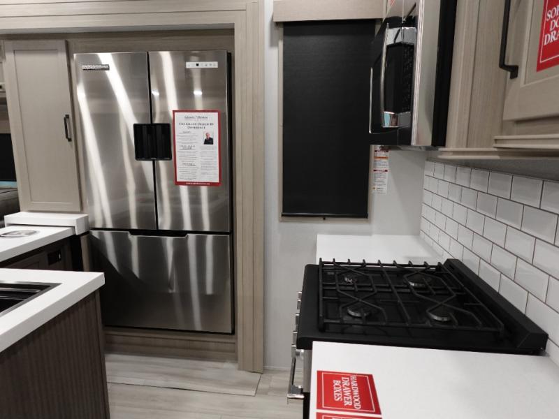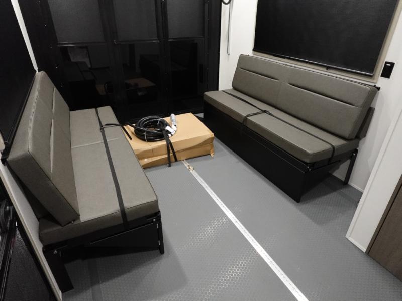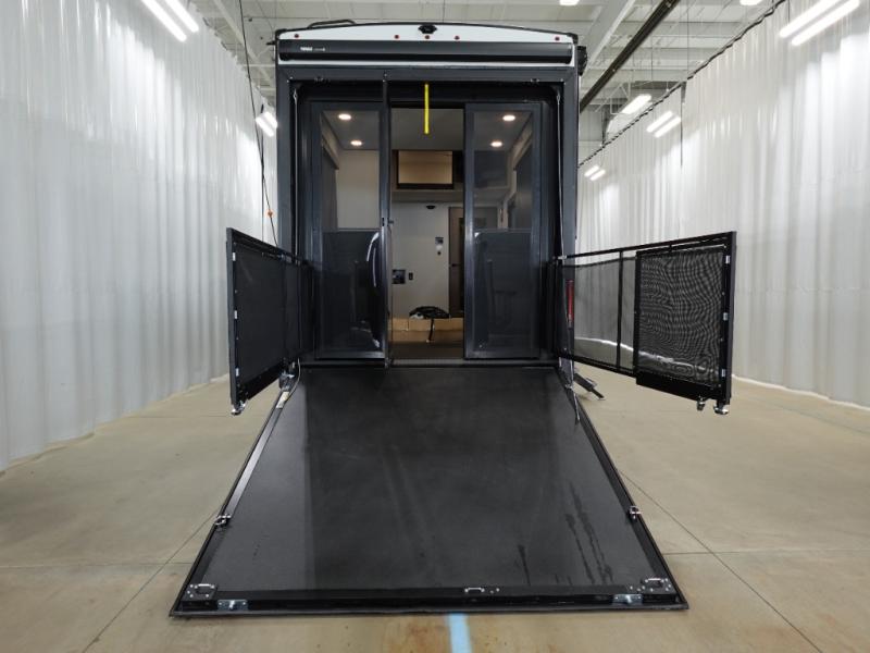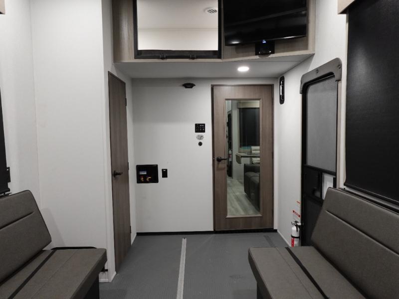 You want a toy hauler to carry your toys to the trails, and include many at-home comforts, and that's just what this unit delivers. A 14' separate garage includes an adjustable tie-down system, an optional Lifesuite System for more sleeping space, an optional half bath, plus washer and dryer prep. There is an overhead loft bed and an L-shaped sofa with recline in the main living area that offers sleeping space as well. Everyone can watch a movie on the LED TV with a fireplace below while sitting on the sofa, in the theatre seats, or while at the free standing dinette with four chairs. The chef will have upgraded appliances to make meals for everyone, an L-shaped countertop with a kitchen sink, and a USB charging outlet. You will love the shower with seat in the full bathroom with two space savings sliding doors that lead into the hallway, and into the front bedroom where you will have a walk-around queen bed, a slide out wardrobe and more USB charging outlets.