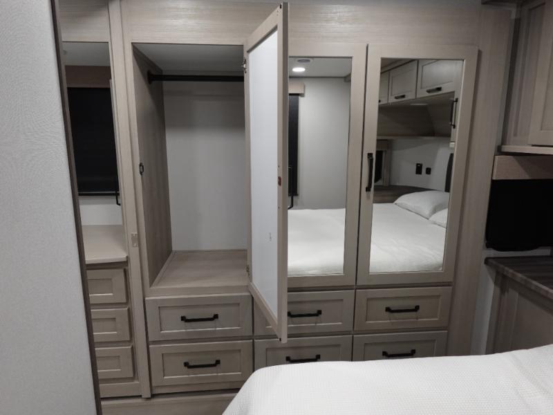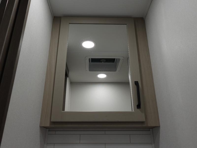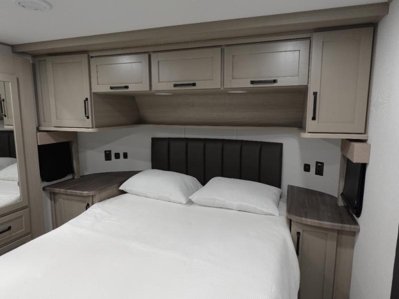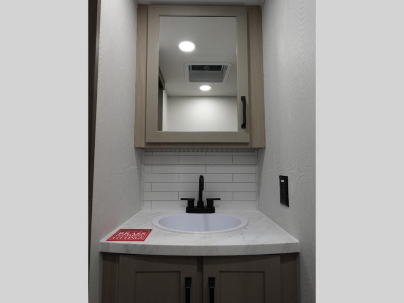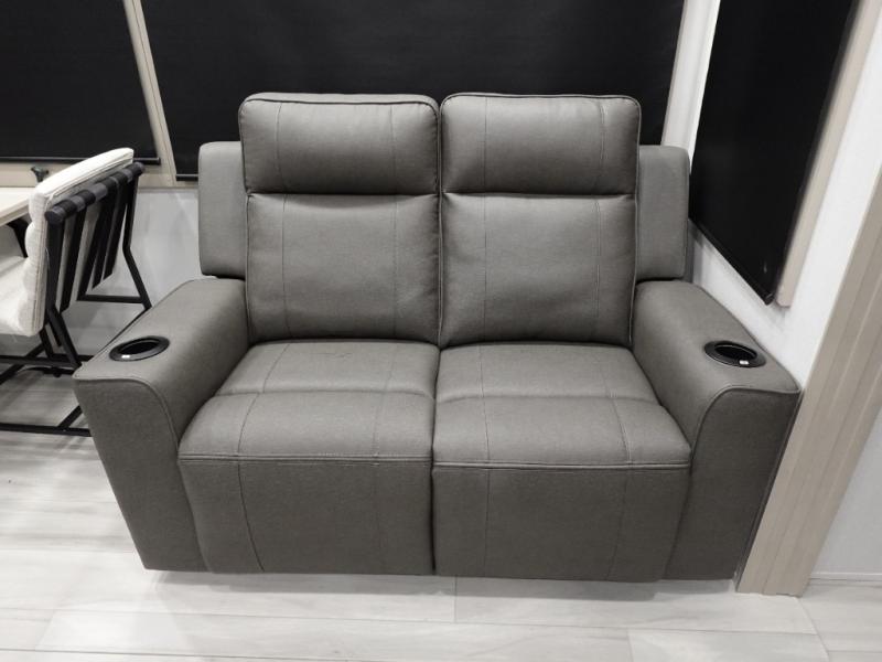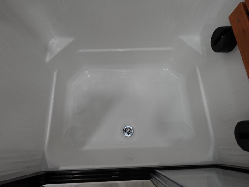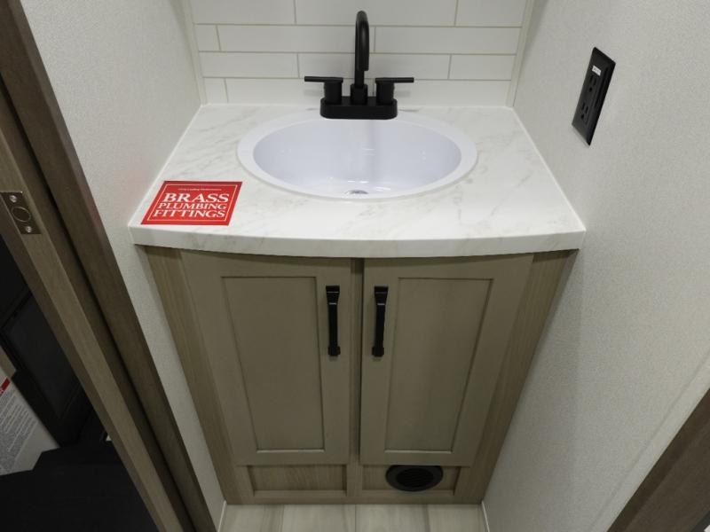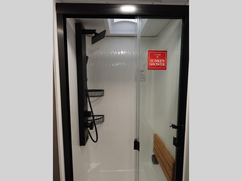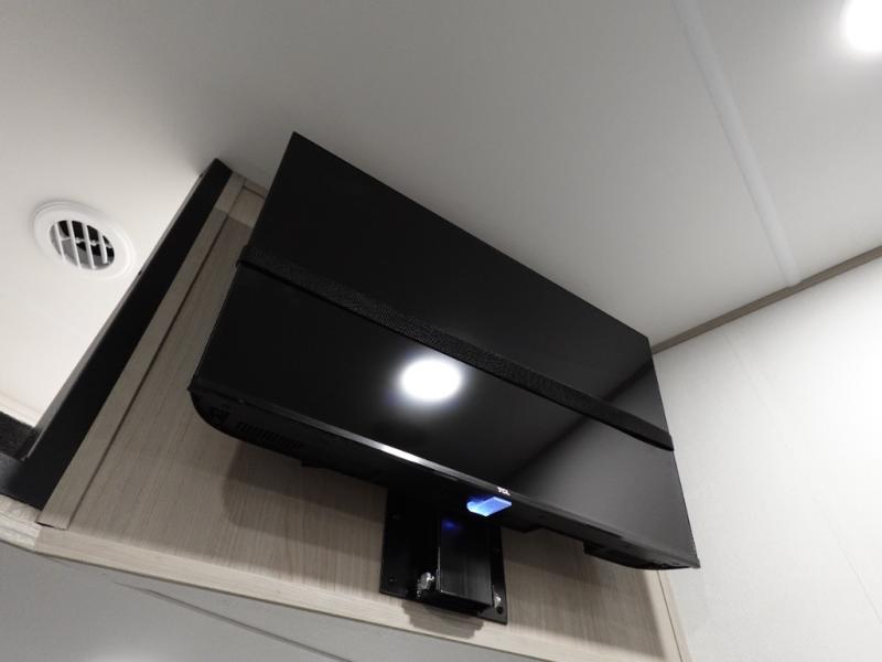 You want a toy hauler to carry your toys to the trails, and include many at-home comforts, and that's just what this unit delivers. A 14' separate garage includes an adjustable tie-down system, an optional Lifesuite System for more sleeping space, an optional half bath, plus washer and dryer prep. There is an overhead loft bed and an L-shaped sofa with recline in the main living area that offers sleeping space as well. Everyone can watch a movie on the LED TV with a fireplace below while sitting on the sofa, in the theatre seats, or while at the free standing dinette with four chairs. The chef will have upgraded appliances to make meals for everyone, an L-shaped countertop with a kitchen sink, and a USB charging outlet. You will love the shower with seat in the full bathroom with two space savings sliding doors that lead into the hallway, and into the front bedroom where you will have a walk-around queen bed, a slide out wardrobe and more USB charging outlets.
