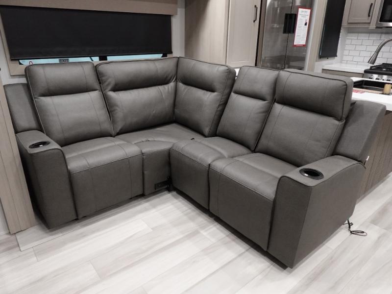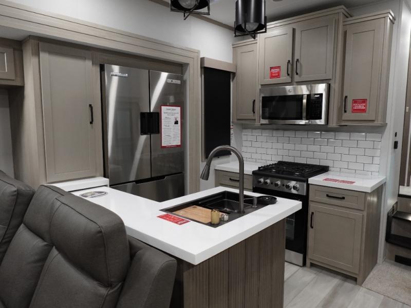 With any Momentum M-Class toy hauler by Grand Design, you will enjoy luxury at every turn! They have been constructed to a superior standard with a thermal roof design, triple insulated main floor and garage floor, and a Rail-Tite underbelly seal that will allow you to camp in all elements. Each model also features an 8' 5" wide body chassis with a wide rail design, no wheel wheels, and a dovetail entry for easier loading. The Stealth A/C system provides maximum cooling power, and the CRE3000 suspension system means you can enjoy a smooth tow each time. You will love the luxurious interior with a professional grade stainless steel cooktop, interior color changing LED accent lighting, a fiberglass shower with a glass door, and solid surface countertops.