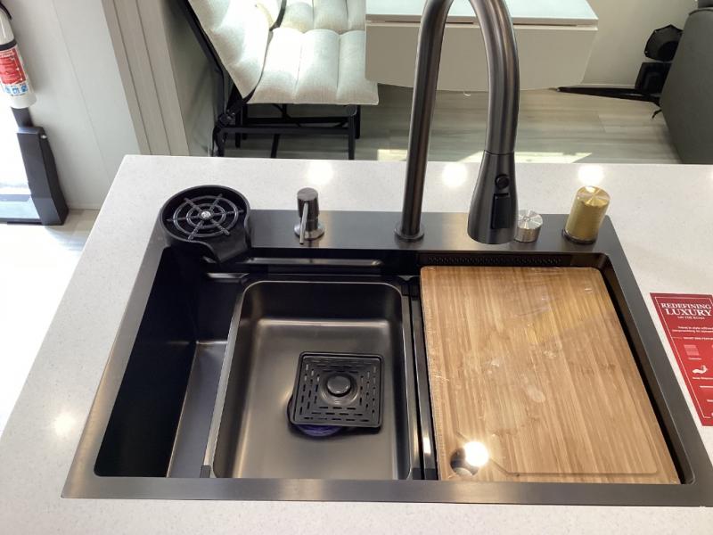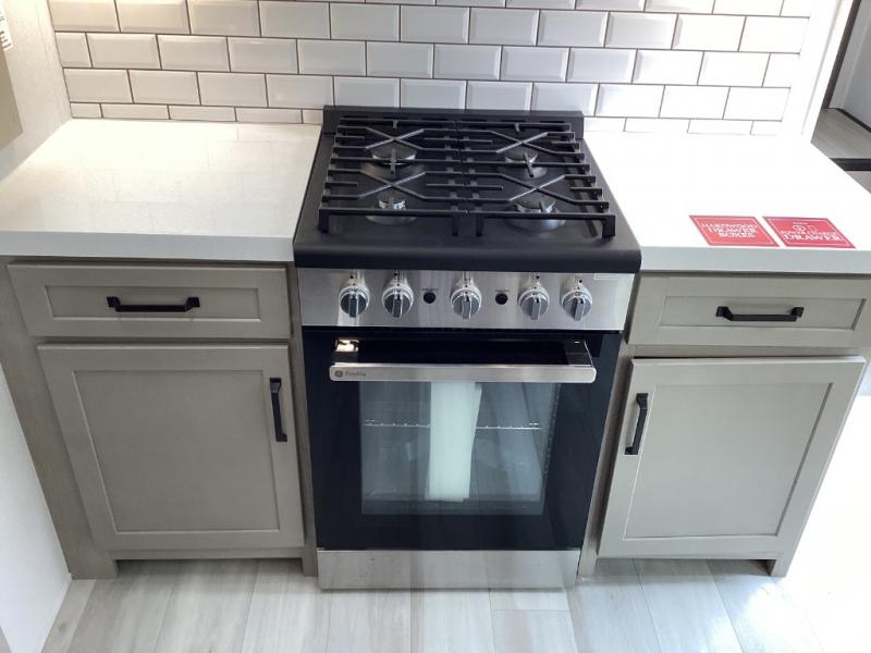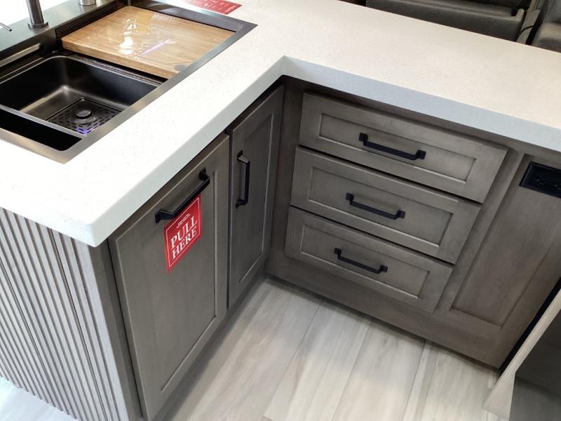 Featuring professional-grade stainless appliances, solid surface countertops, an L-shaped counter with deep kitchen sink, and USB charging—designed for quick meals or gourmet nights. -