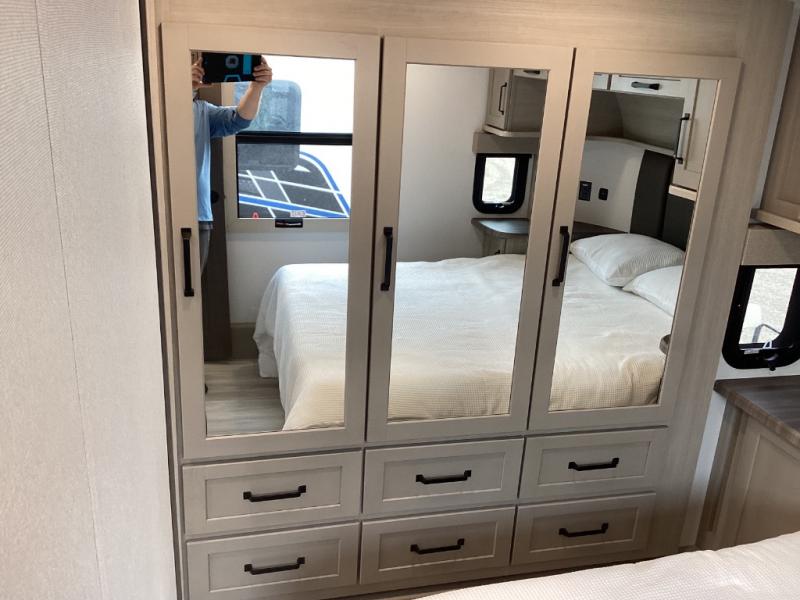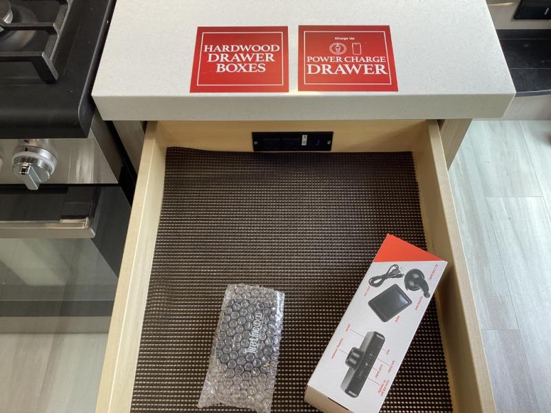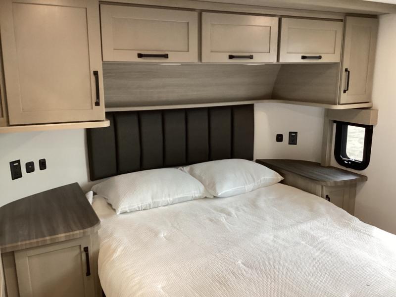 Recharge in the queen walk-around bed with a slide-out wardrobe, dual nightstands, and built-in USB outlets for charging your devices.