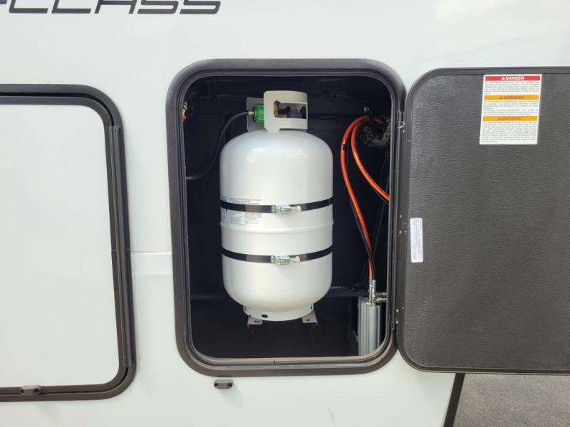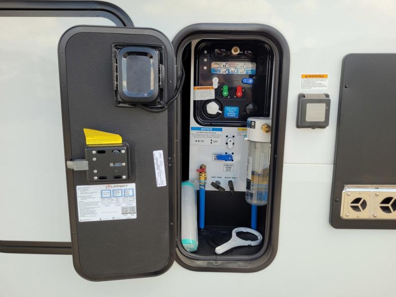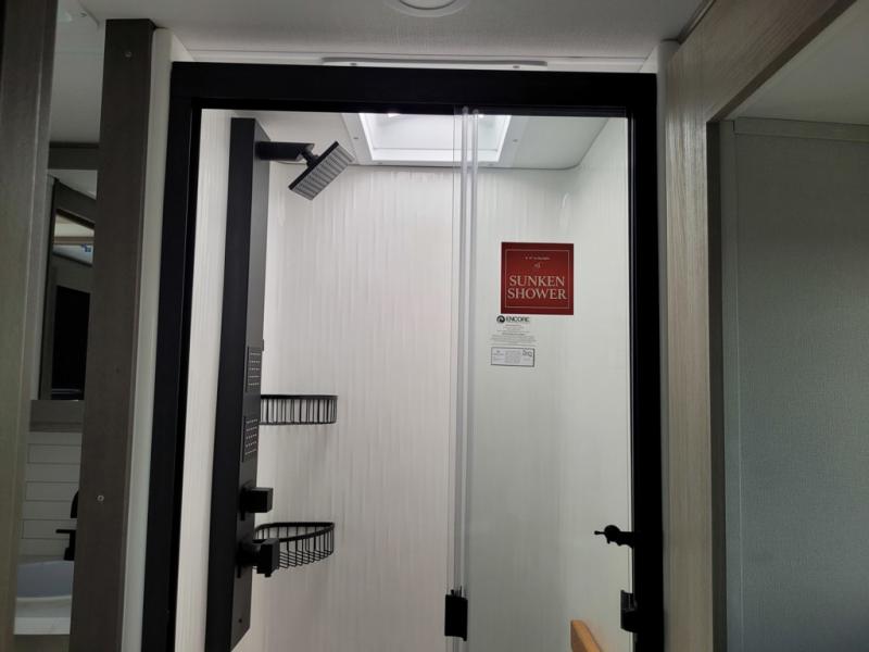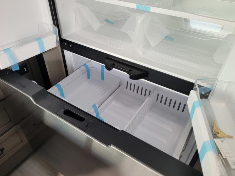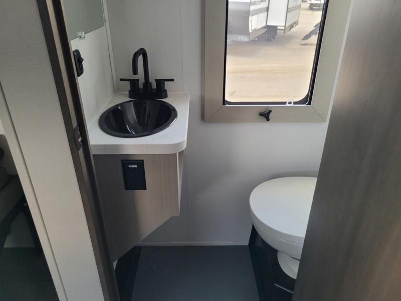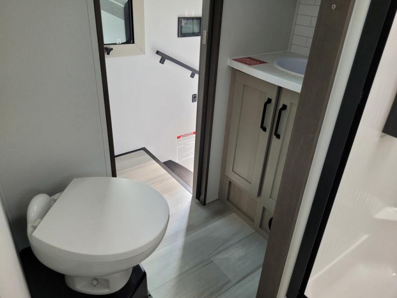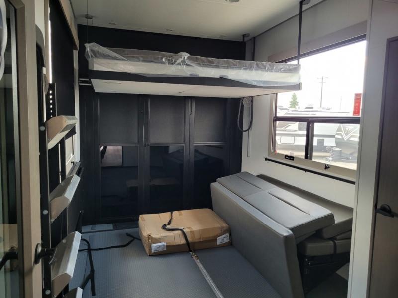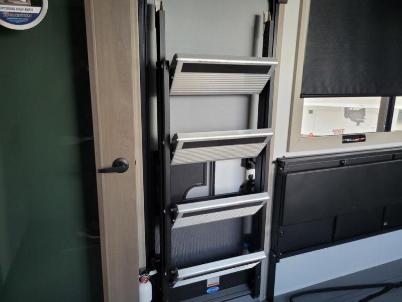 You want a toy hauler to carry your toys to the trails, and include many at-home comforts, and that's just what this unit delivers. A 14' separate garage includes an adjustable tie-down system, an optional Lifesuite System for more sleeping space, an optional half bath, plus washer and dryer prep. There is an overhead loft bed and an L-shaped sofa with recline in the main living area that offers sleeping space as well. Everyone can watch a movie on the LED TV with a fireplace below while sitting on the sofa, in the theatre seats, or while at the free standing dinette with four chairs. The chef will have upgraded appliances to make meals for everyone, an L-shaped countertop with a kitchen sink, and a USB charging outlet. You will love the shower with seat in the full bathroom with two space savings sliding doors that lead into the hallway, and into the front bedroom where you will have a walk-around queen bed, a slide out wardrobe and more USB charging outlets.
