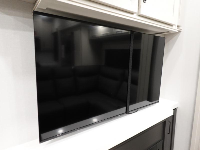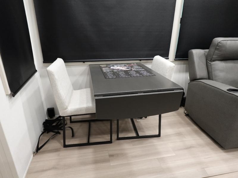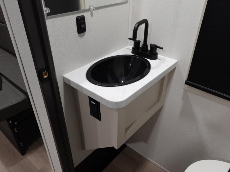 You want a toy hauler to carry your toys to the trails, and include many at-home comforts, and that's just what this unit delivers. A 14' separate garage includes an adjustable tie-down system, and more. There is an overhead loft bed and an L-shaped sofa with recline in the main living area that offers sleeping space as well. Everyone can watch a movie on the LED TV with a fireplace below while sitting on the sofa, in the theatre seats, or while at the free standing dinette with four chairs. The chef will have upgraded appliances to make meals for everyone, an L-shaped countertop with a kitchen sink, and a USB charging outlet. You will love the shower with seat in the full bathroom with two space savings sliding doors that lead into the hallway, and into the front bedroom where you will have a walk-around queen bed, a slide out wardrobe and more USB charging outlets.
