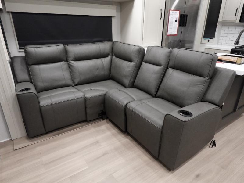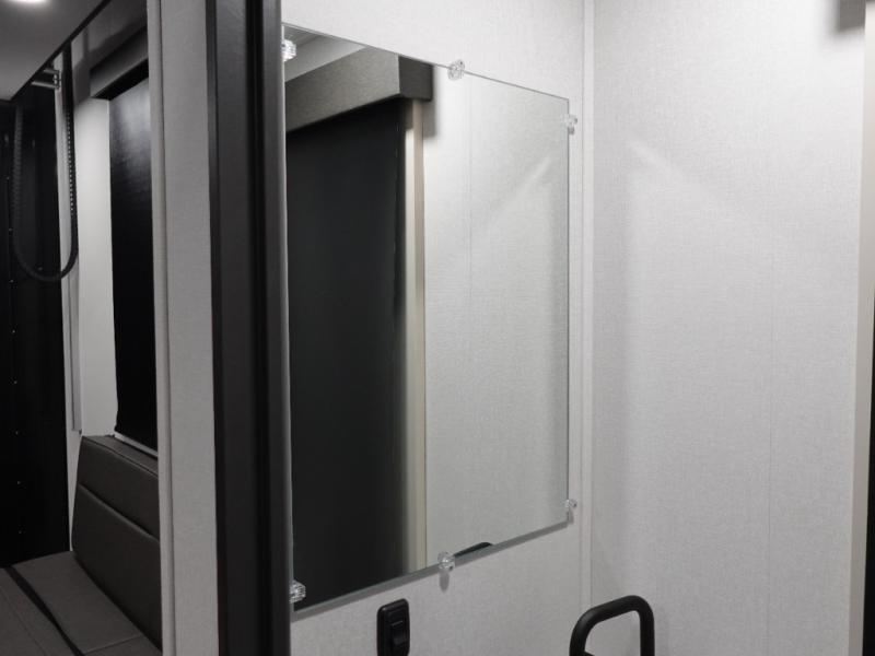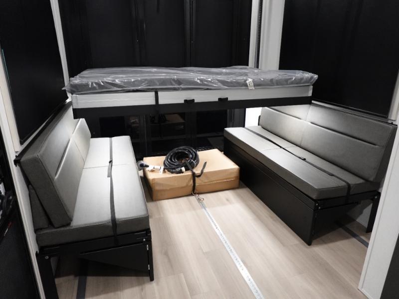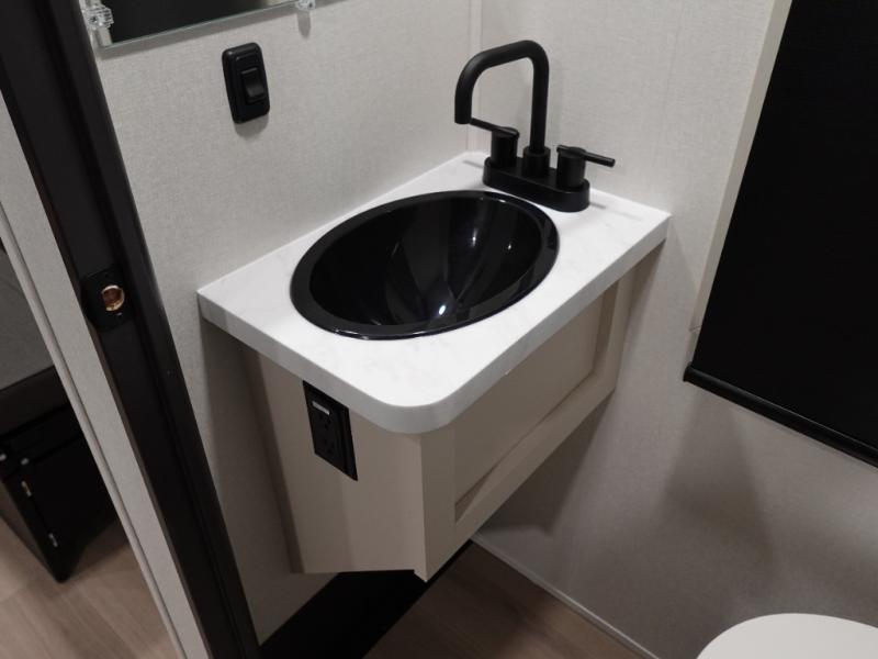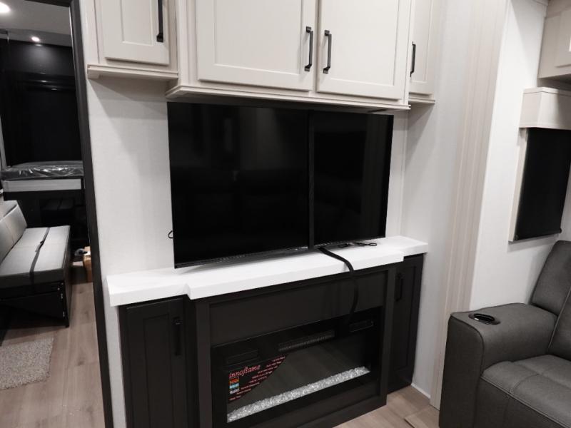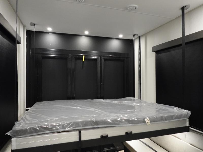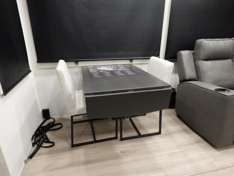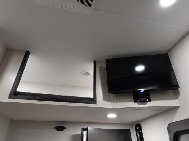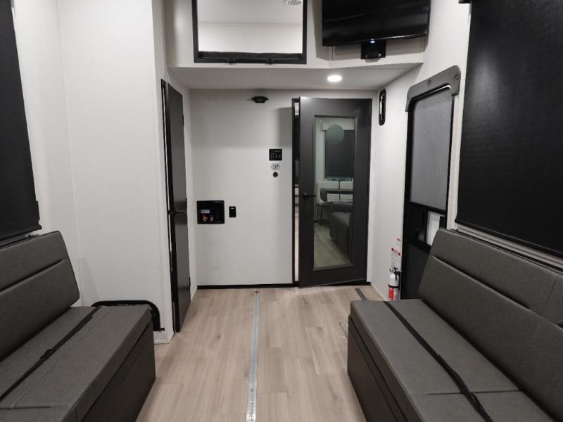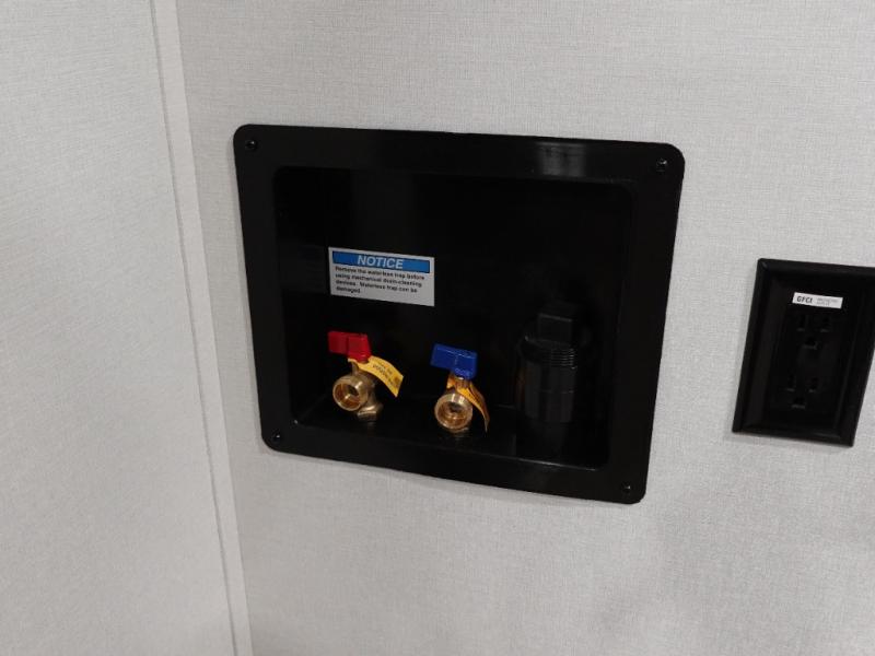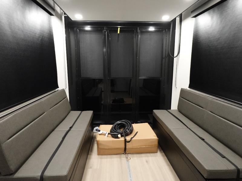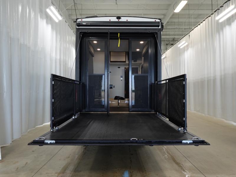 You want a toy hauler to carry your toys to the trails, and include many at-home comforts, and that's just what this unit delivers. Everyone can watch a movie on the LED TV with a fireplace below while sitting on the sofa, in the theatre seats, or while at the free standing dinette with four chairs. The chef will have upgraded appliances to make meals for everyone, an L-shaped countertop with a kitchen sink, and a USB charging outlet. You will love the shower with seat in the full bathroom with two space savings sliding doors that lead into the hallway, and into the front bedroom where you will have a walk-around bed, a slide out wardrobe and more USB charging outlets.