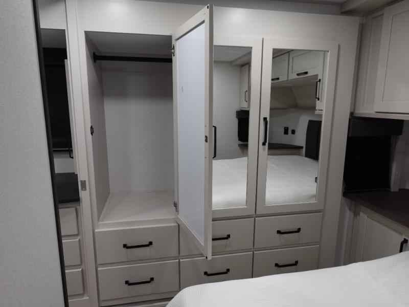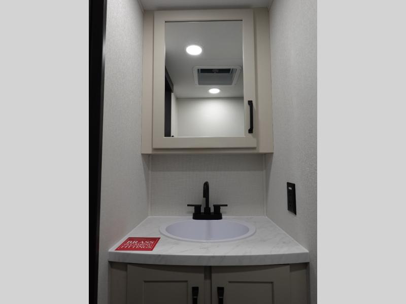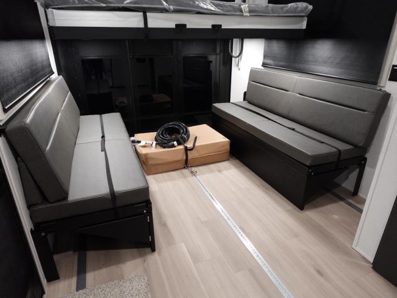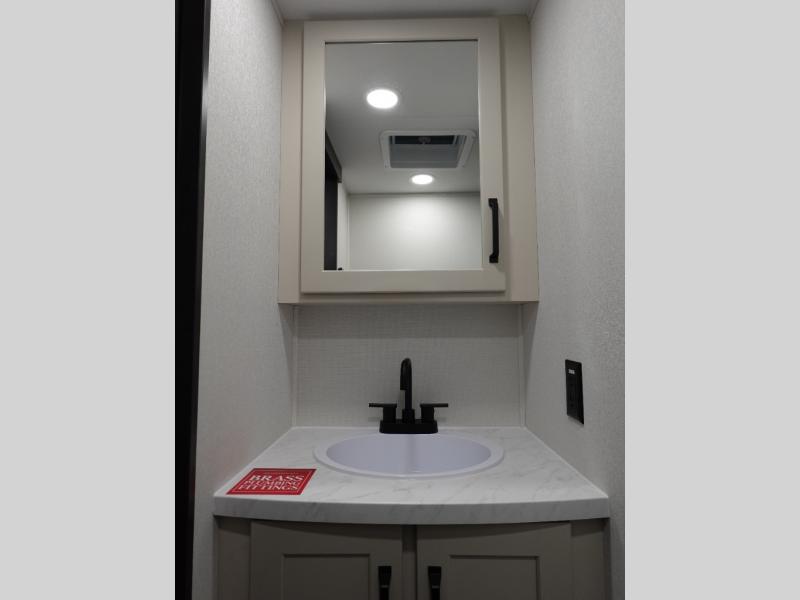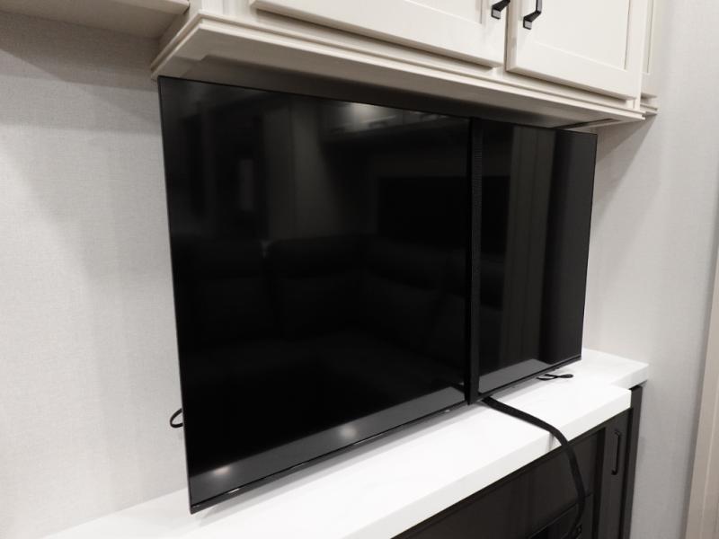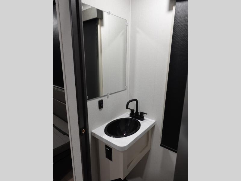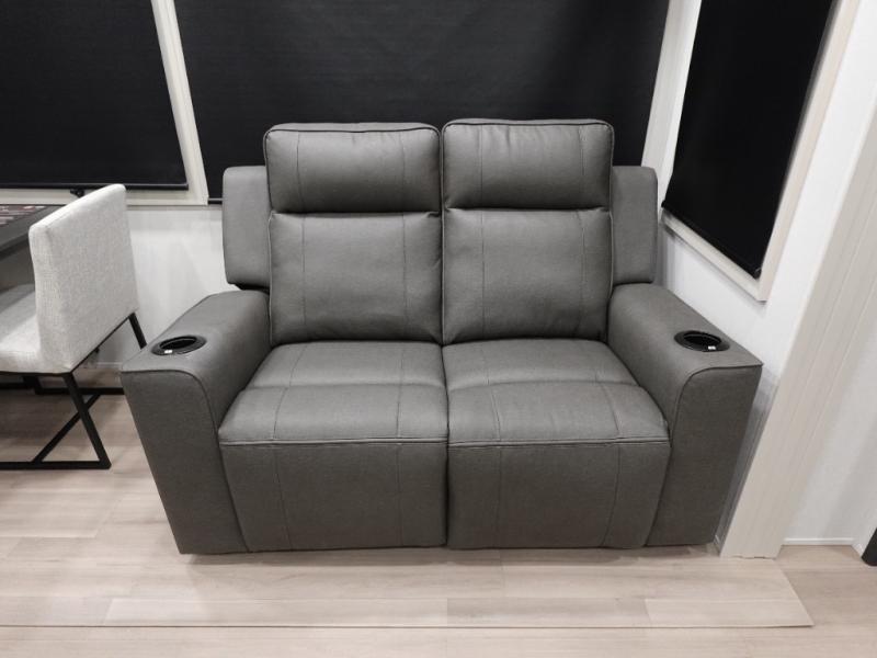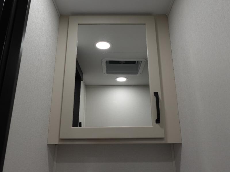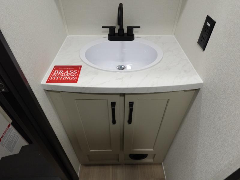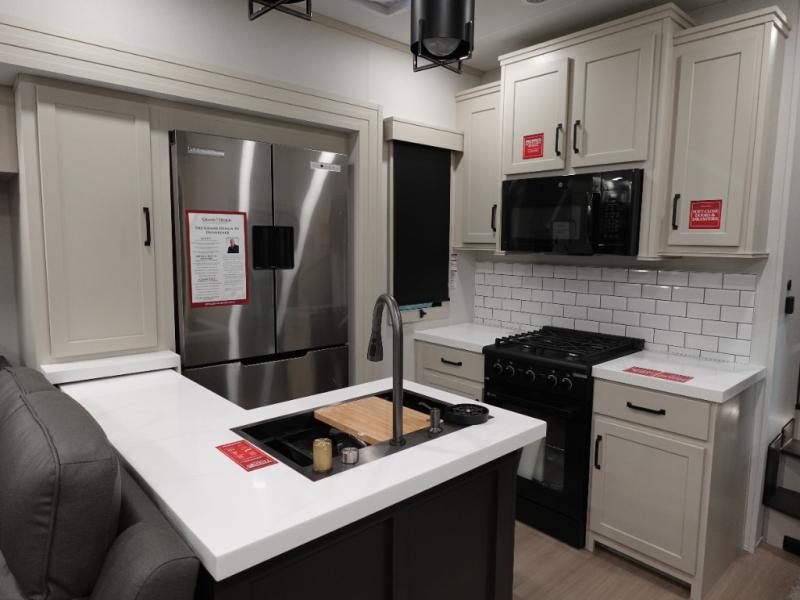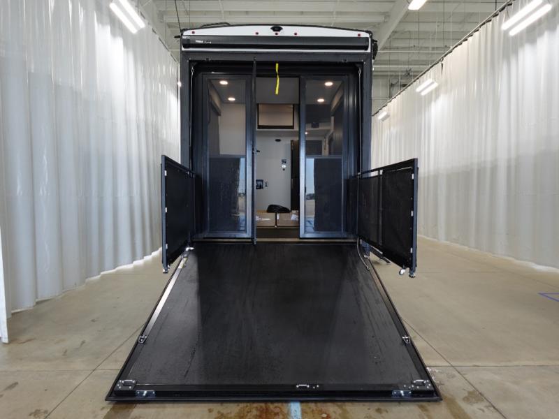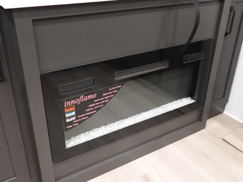 You want a toy hauler to carry your toys to the trails, and include many at-home comforts, and that's just what this unit delivers. Everyone can watch a movie on the LED TV with a fireplace below while sitting on the sofa, in the theatre seats, or while at the free standing dinette with four chairs. The chef will have upgraded appliances to make meals for everyone, an L-shaped countertop with a kitchen sink, and a USB charging outlet. You will love the shower with seat in the full bathroom with two space savings sliding doors that lead into the hallway, and into the front bedroom where you will have a walk-around bed, a slide out wardrobe and more USB charging outlets.