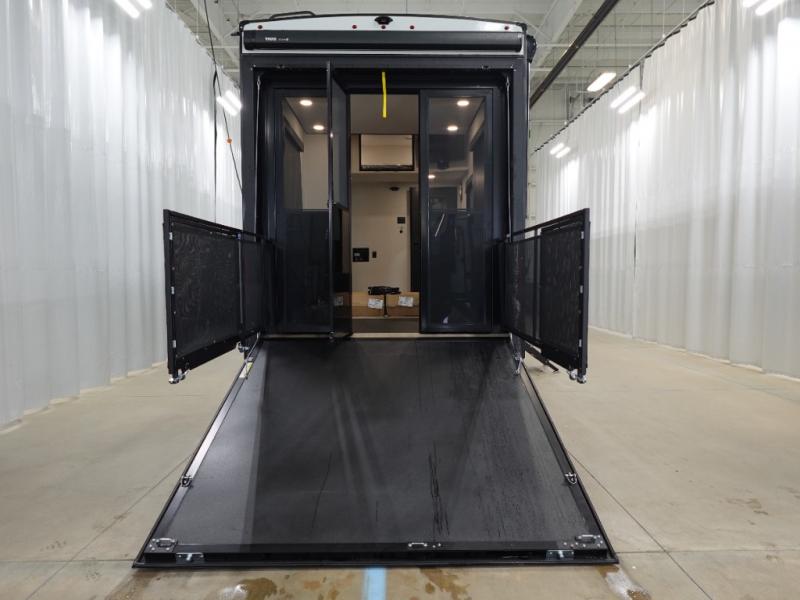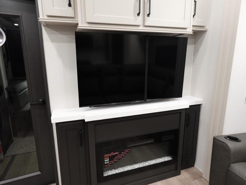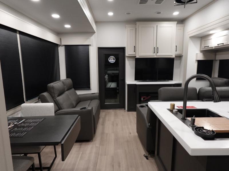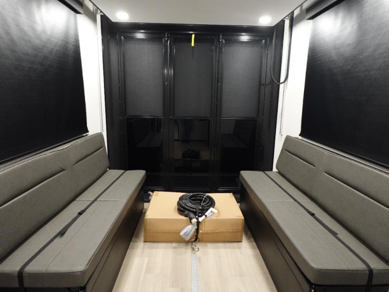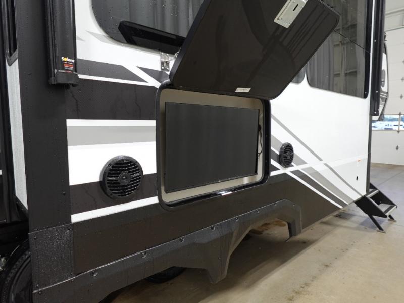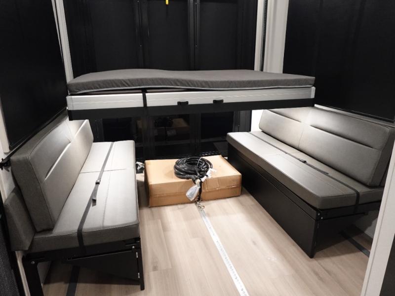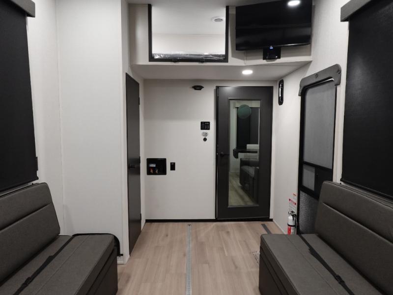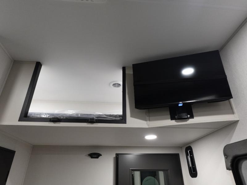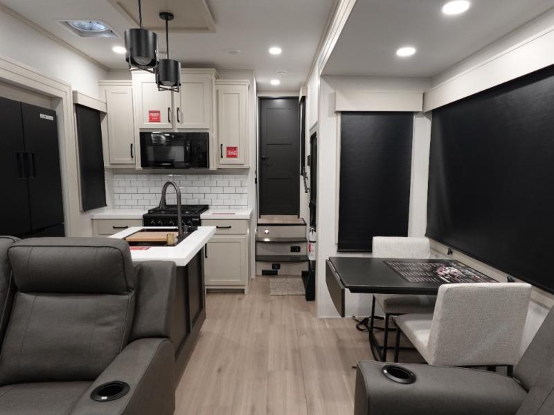 You want a toy hauler to carry your toys to the trails, and include many at-home comforts, and that's just what this unit delivers. A 14' separate garage includes an adjustable tie-down system, an optional Lifesuite System for more sleeping space, an optional half bath, plus washer and dryer prep. There is an overhead loft bed and an L-shaped sofa with recline in the main living area that offers sleeping space as well. Everyone can watch a movie on the LED TV with a fireplace below while sitting on the sofa, in the theatre seats, or while at the free standing dinette with four chairs. The chef will have upgraded appliances to make meals for everyone, an L-shaped countertop with a kitchen sink, and a USB charging outlet. You will love the shower with seat in the full bathroom with two space savings sliding doors that lead into the hallway, and into the front bedroom where you will have a walk-around queen bed, a slide out wardrobe and more USB charging outlets.