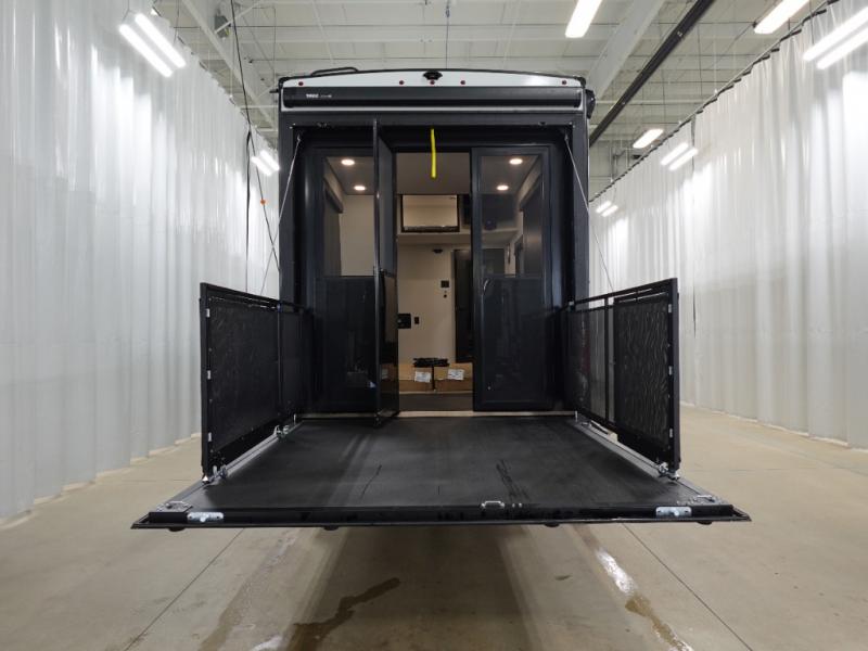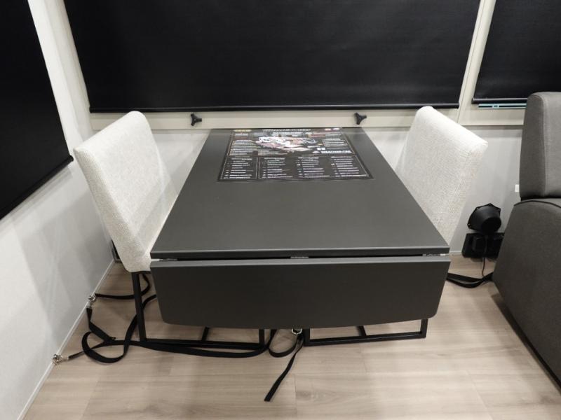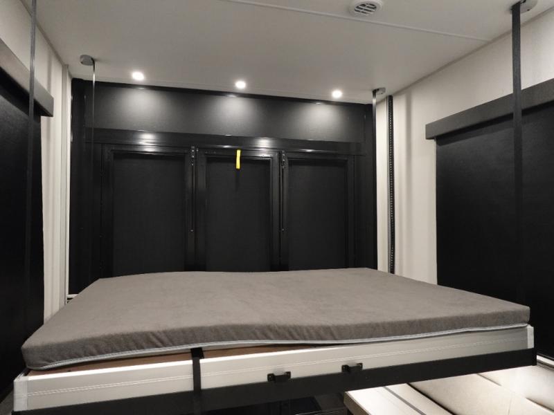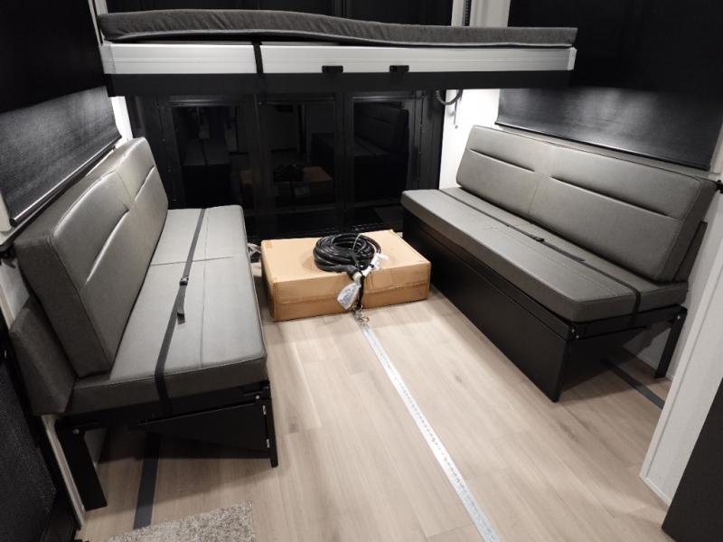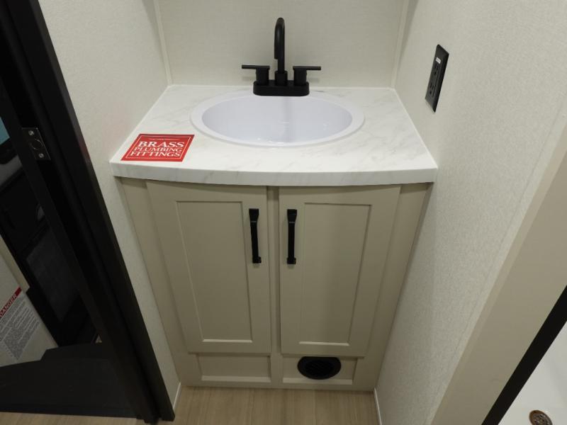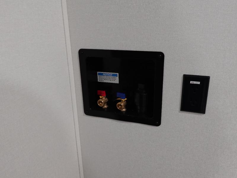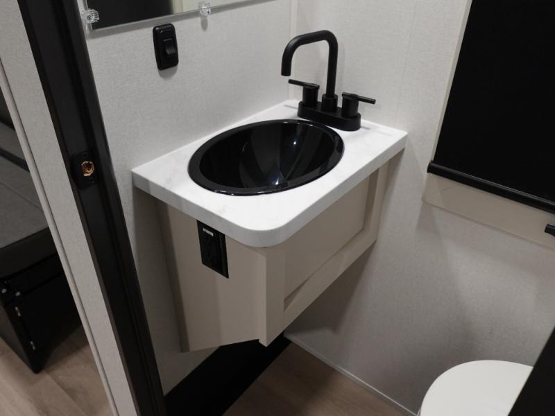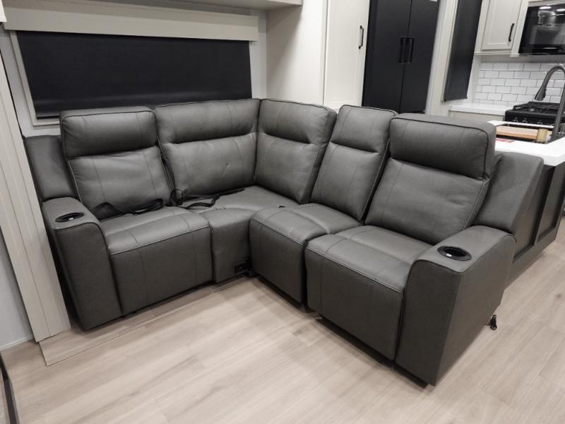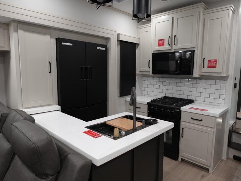 You want a toy hauler to carry your toys to the trails, and include many at-home comforts, and that's just what this unit delivers. A 14' separate garage includes an adjustable tie-down system, an optional Lifesuite System for more sleeping space, an optional half bath, plus washer and dryer prep. There is an overhead loft bed and an L-shaped sofa with recline in the main living area that offers sleeping space as well. Everyone can watch a movie on the LED TV with a fireplace below while sitting on the sofa, in the theatre seats, or while at the free standing dinette with four chairs. The chef will have upgraded appliances to make meals for everyone, an L-shaped countertop with a kitchen sink, and a USB charging outlet. You will love the shower with seat in the full bathroom with two space savings sliding doors that lead into the hallway, and into the front bedroom where you will have a walk-around queen bed, a slide out wardrobe and more USB charging outlets.