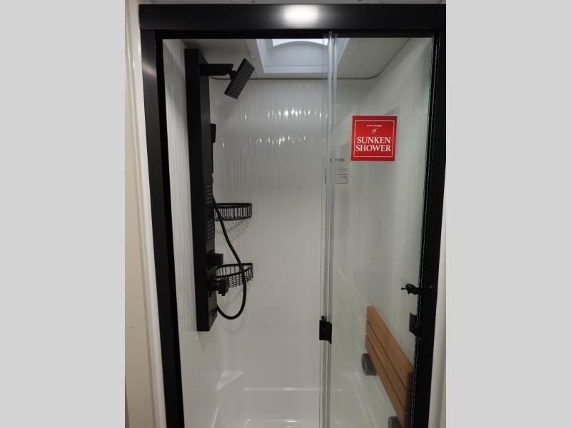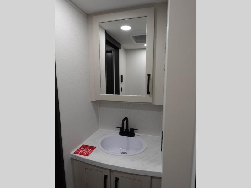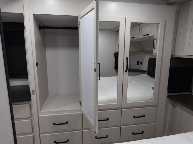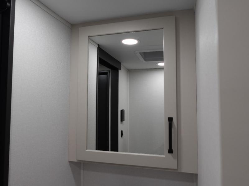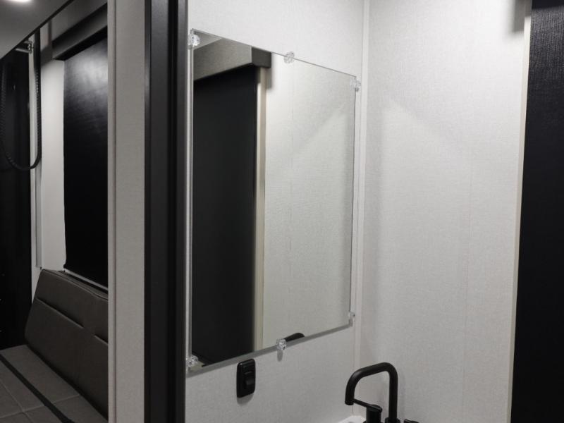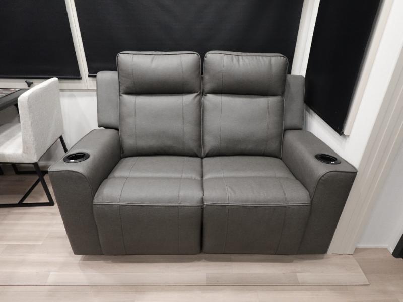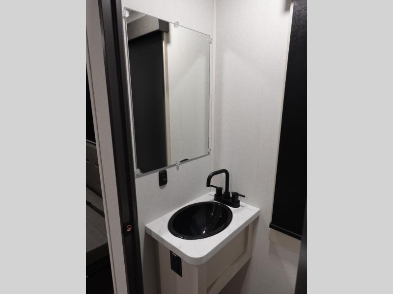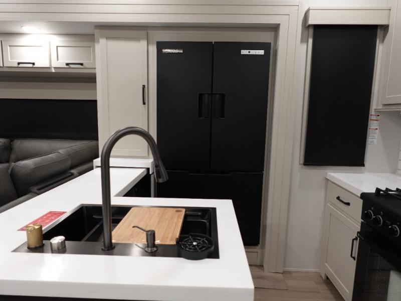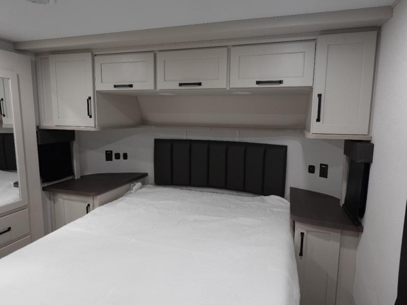 You want a toy hauler to carry your toys to the trails, and include many at-home comforts, and that's just what this unit delivers. A 14' separate garage includes an adjustable tie-down system, an optional Lifesuite System for more sleeping space, an optional half bath, plus washer and dryer prep. There is an overhead loft bed and an L-shaped sofa with recline in the main living area that offers sleeping space as well. Everyone can watch a movie on the LED TV with a fireplace below while sitting on the sofa, in the theatre seats, or while at the free standing dinette with four chairs. The chef will have upgraded appliances to make meals for everyone, an L-shaped countertop with a kitchen sink, and a USB charging outlet. You will love the shower with seat in the full bathroom with two space savings sliding doors that lead into the hallway, and into the front bedroom where you will have a walk-around queen bed, a slide out wardrobe and more USB charging outlets.