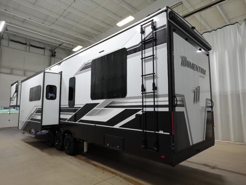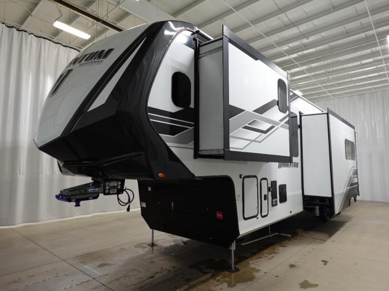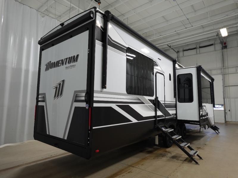 With any Momentum M-Class toy hauler by Grand Design, you will enjoy luxury at every turn! They have been constructed to a superior standard with a thermal roof design, triple insulated main floor and garage floor, and a Rail-Tite underbelly seal that will allow you to camp in all elements. Each model also features an 8' 5" wide body chassis with a wide rail design, no wheel wheels, and a dovetail entry for easier loading. The Stealth A/C system provides maximum cooling power, and the CRE3000 suspension system means you can enjoy a smooth tow each time. You will love the luxurious interior with a professional grade stainless steel cooktop, interior color changing LED accent lighting, a fiberglass shower with a glass door, and solid surface countertops.