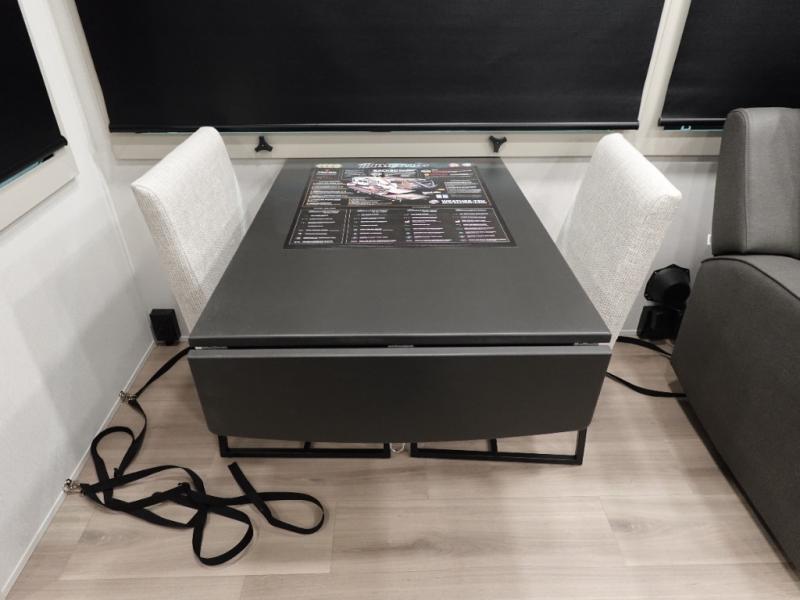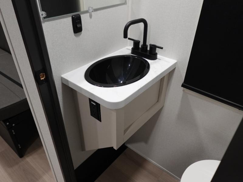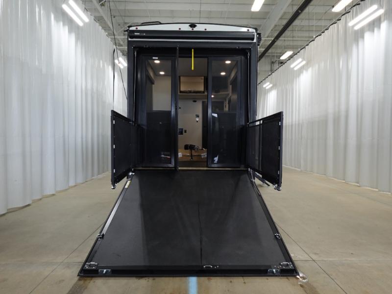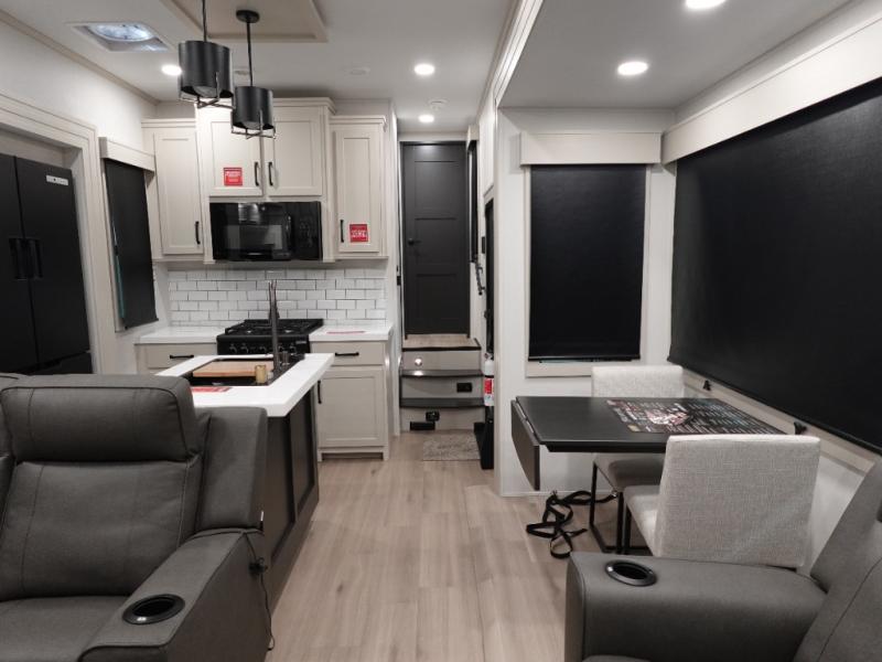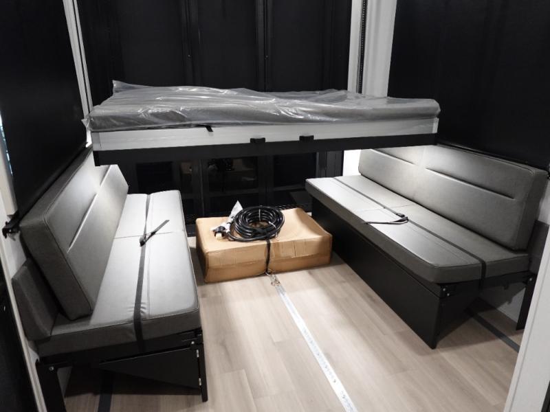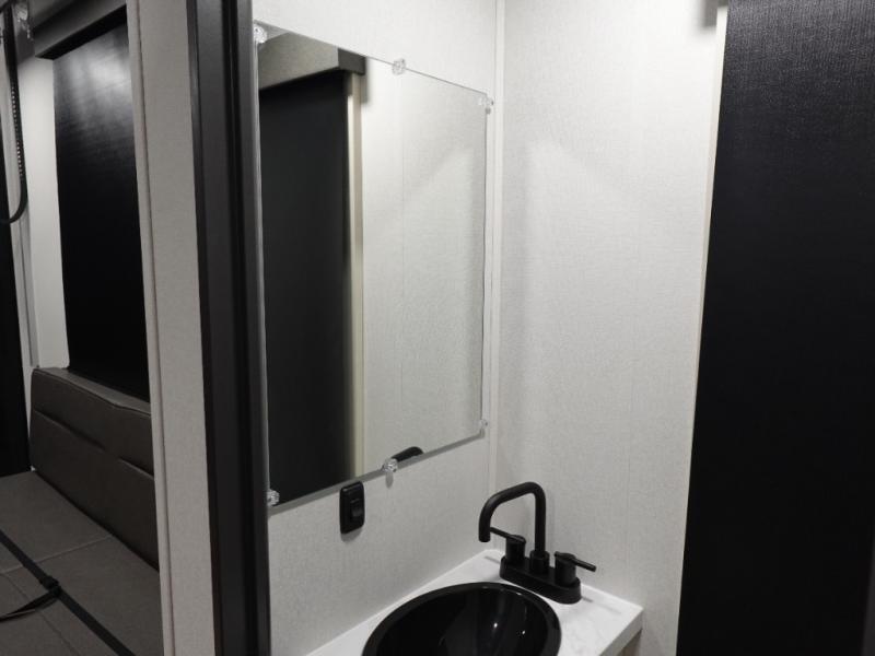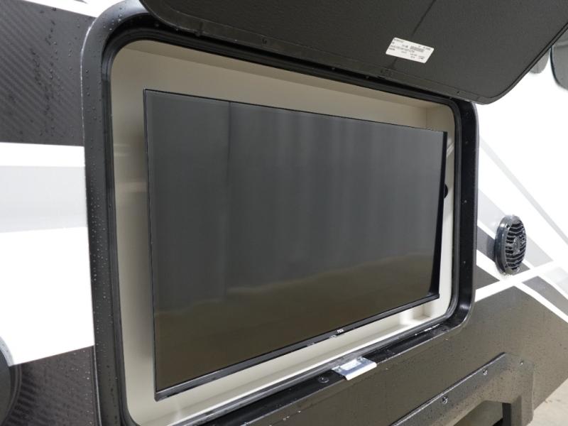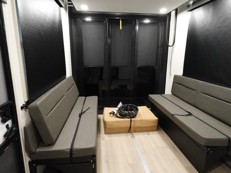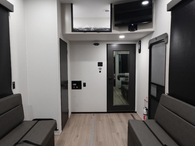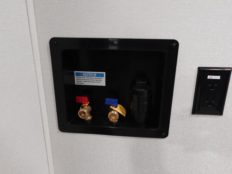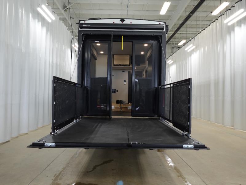 You want a toy hauler to carry your toys to the trails, and include many at-home comforts, and that's just what this unit delivers. A 14' separate garage includes an adjustable tie-down system, plus washer and dryer prep. There is an overhead loft bed and an L-shaped sofa with recline in the main living area that offers sleeping space as well. Everyone can watch a movie on the LED TV with a fireplace below while sitting on the sofa, in the theatre seats, or while at the free standing dinette with four chairs. The chef will have upgraded appliances to make meals for everyone, an L-shaped countertop with a kitchen sink, and a USB charging outlet. You will love the shower with seat in the full bathroom with two space savings sliding doors that lead into the hallway, and into the front bedroom where you will have a walk-around queen bed, a slide out wardrobe and more USB charging outlets.