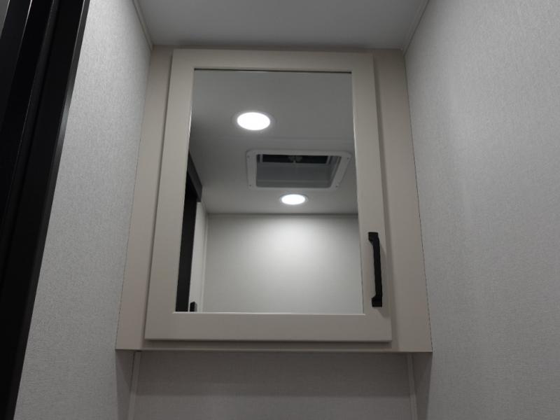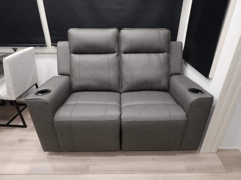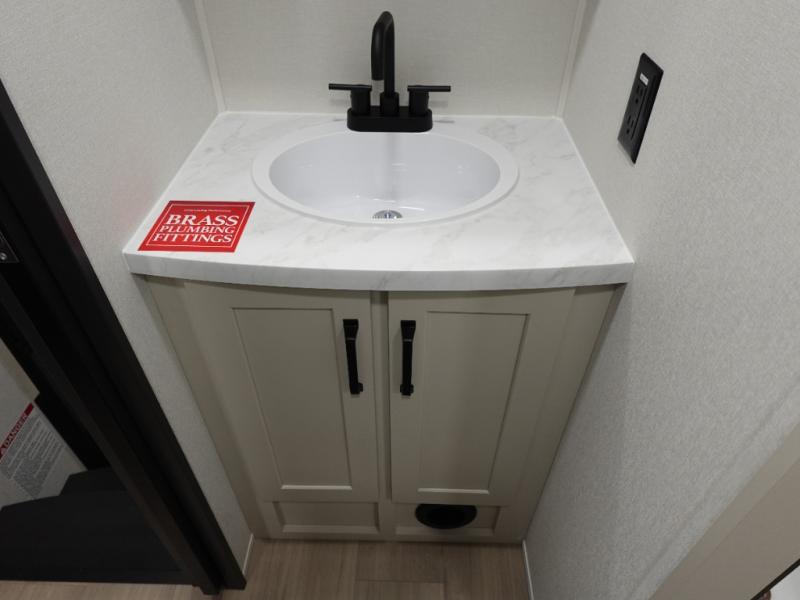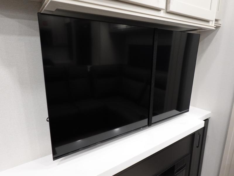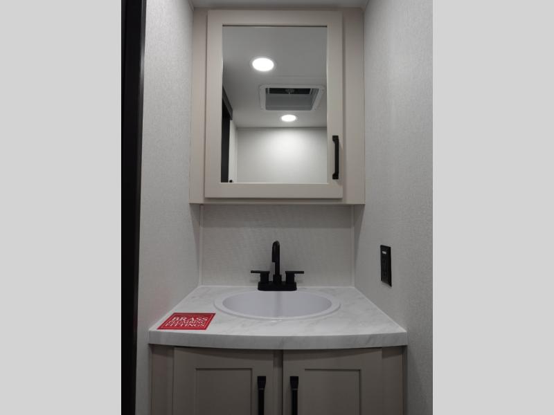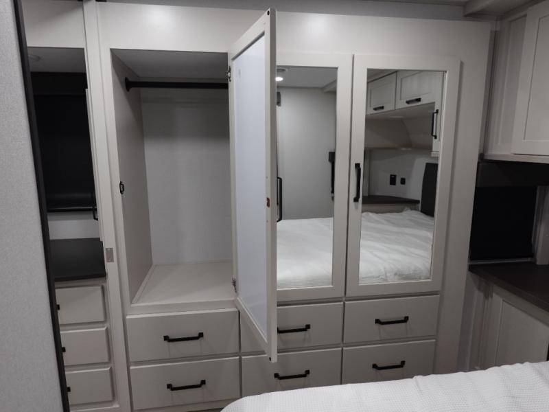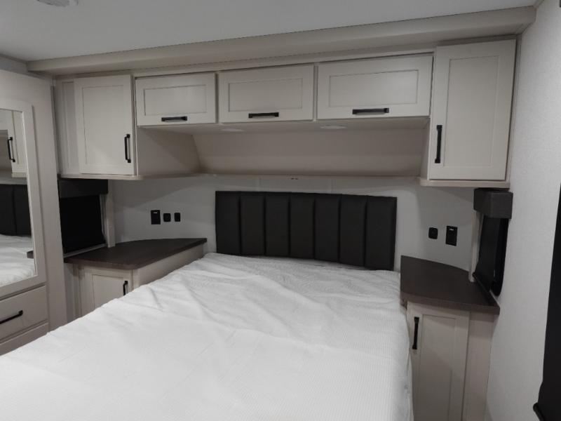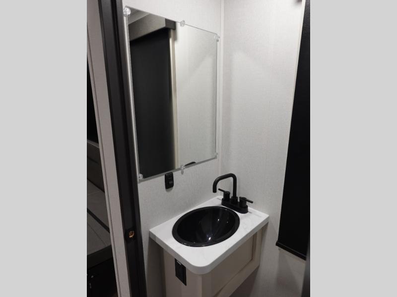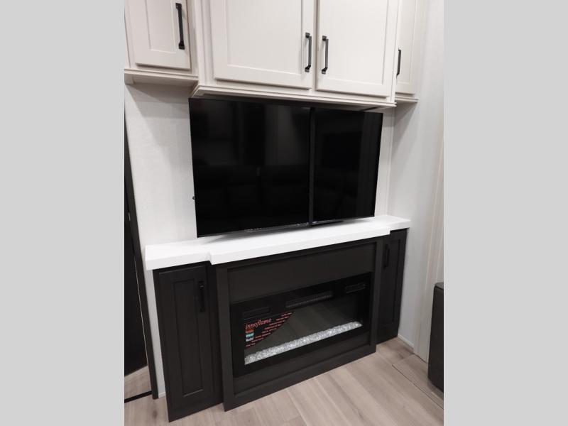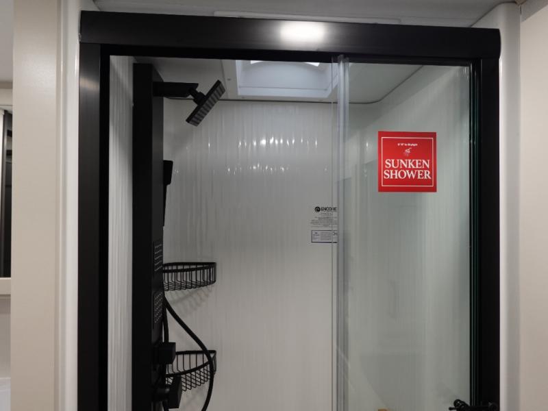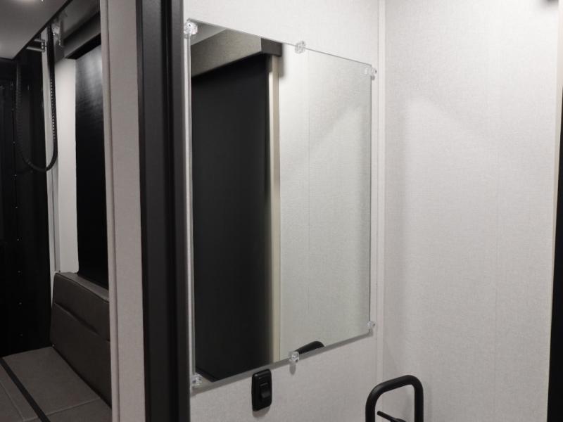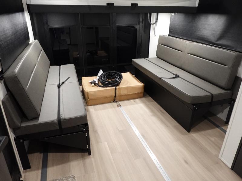 You want a toy hauler to carry your toys to the trails, and include many at-home comforts, and that's just what this unit delivers. A 14' separate garage includes an adjustable tie-down system, plus washer and dryer prep. There is an overhead loft bed and an L-shaped sofa with recline in the main living area that offers sleeping space as well. Everyone can watch a movie on the LED TV with a fireplace below while sitting on the sofa, in the theatre seats, or while at the free standing dinette with four chairs. The chef will have upgraded appliances to make meals for everyone, an L-shaped countertop with a kitchen sink, and a USB charging outlet. You will love the shower with seat in the full bathroom with two space savings sliding doors that lead into the hallway, and into the front bedroom where you will have a walk-around queen bed, a slide out wardrobe and more USB charging outlets.