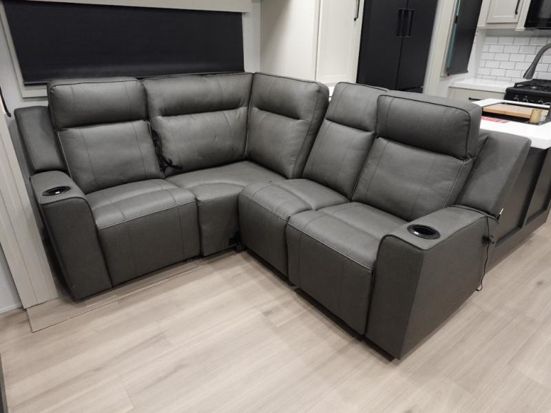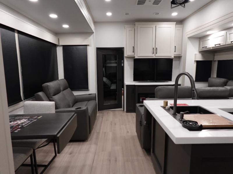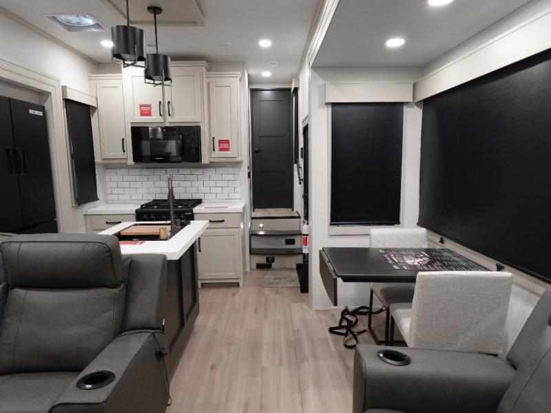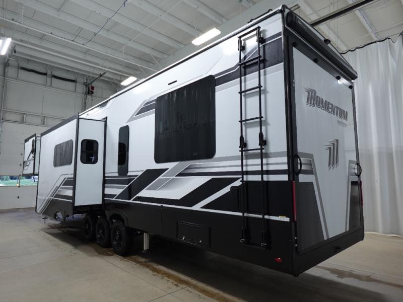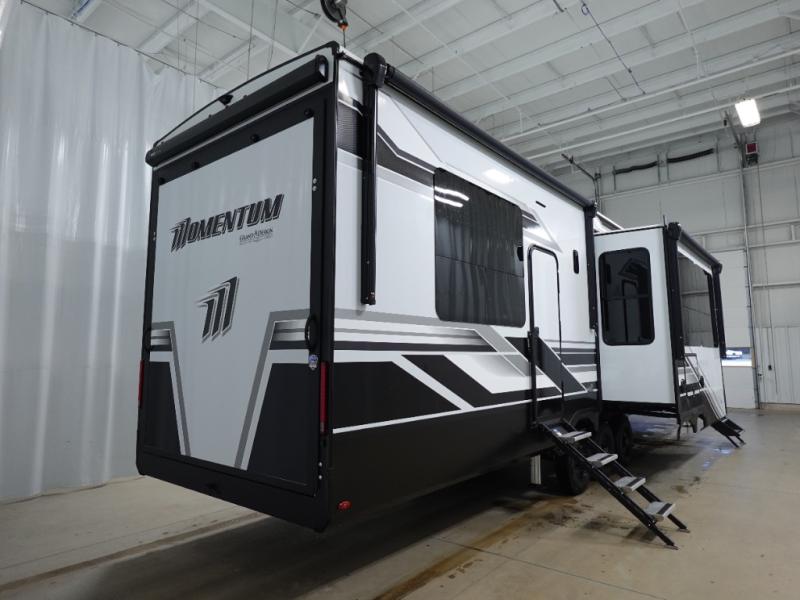 With any Momentum M-Class toy hauler by Grand Design, you will enjoy luxury at every turn! They have been constructed to a superior standard with a thermal roof design, triple insulated main floor and garage floor, and a Rail-Tite underbelly seal that will allow you to camp in all elements. Each model also features an 8' 5" wide body chassis with a wide rail design, no wheel wheels, and a dovetail entry for easier loading. The Stealth A/C system provides maximum cooling power, and the CRE3000 suspension system means you can enjoy a smooth tow each time. You will love the luxurious interior with a professional grade stainless steel cooktop, interior color changing LED accent lighting, a fiberglass shower with a glass door, and solid surface countertops.