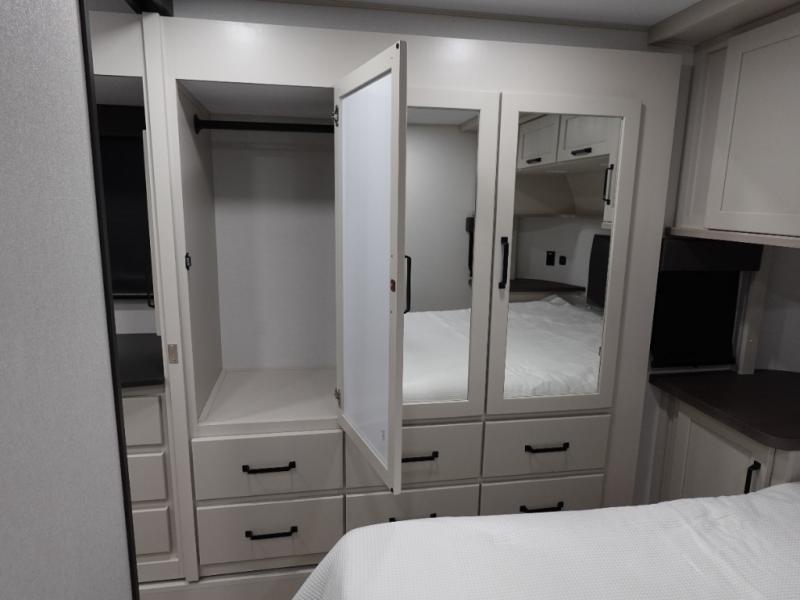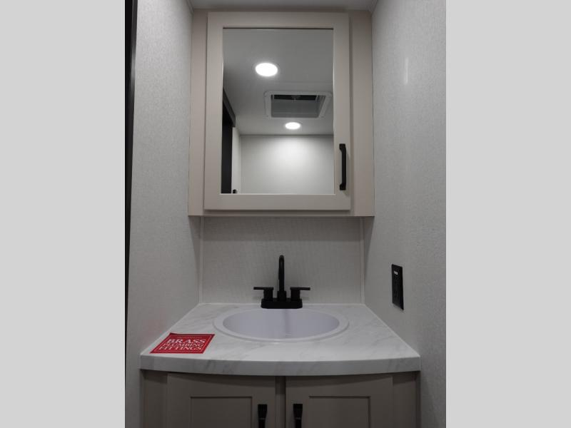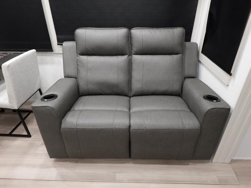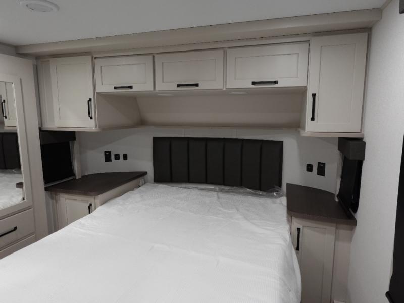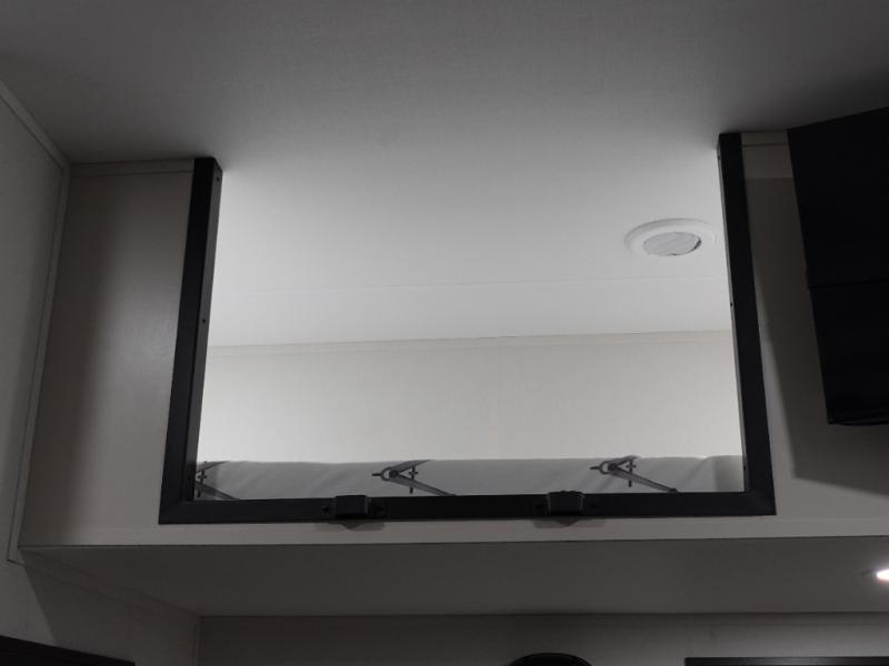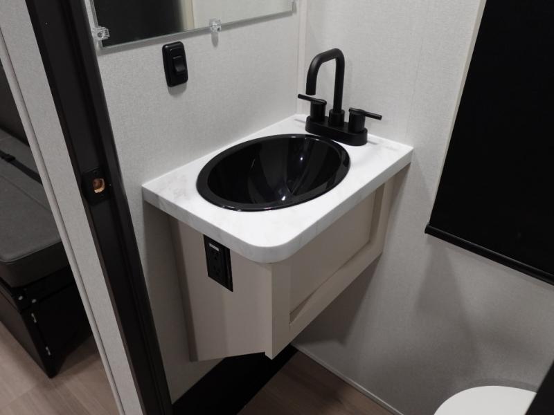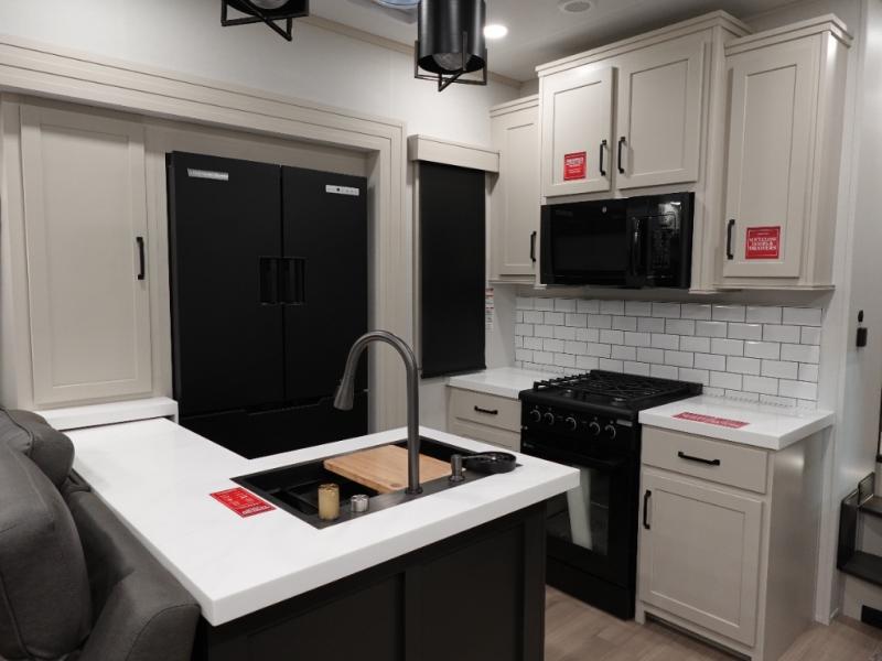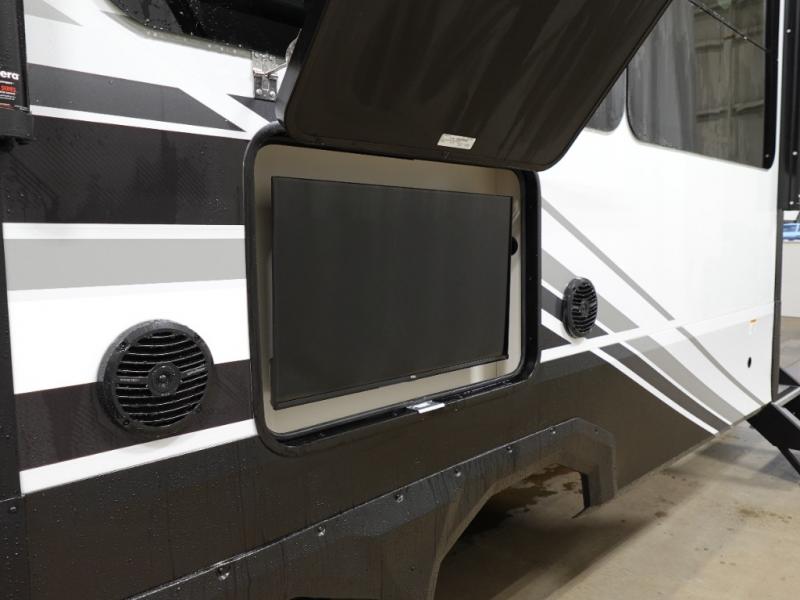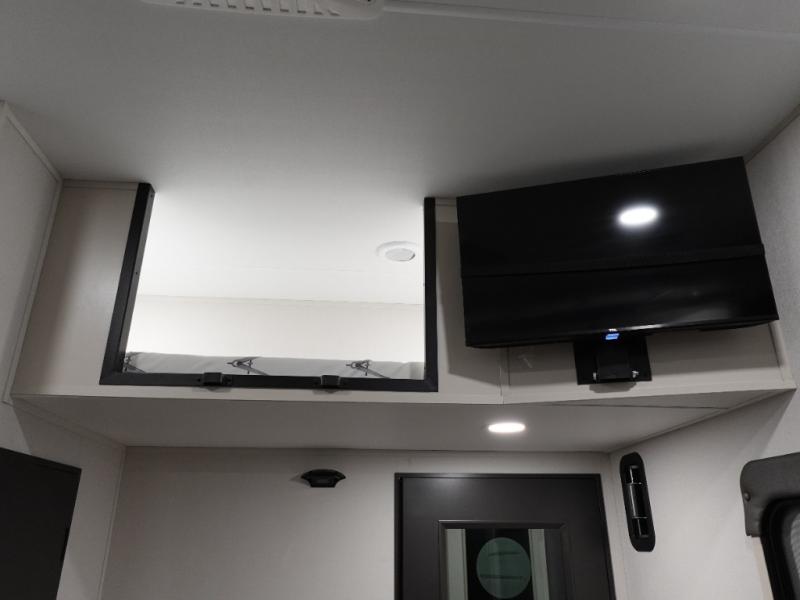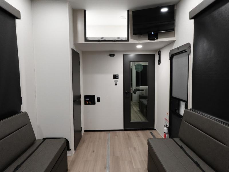 You want a toy hauler to carry your toys to the trails, and include many at-home comforts, and that's just what this unit delivers. A 14' separate garage includes an adjustable tie-down system, an optional Lifesuite System for more sleeping space, an optional half bath, plus washer and dryer prep. There is an overhead loft bed and an L-shaped sofa with recline in the main living area that offers sleeping space as well. Everyone can watch a movie on the LED TV with a fireplace below while sitting on the sofa, in the theatre seats, or while at the free standing dinette with four chairs. The chef will have upgraded appliances to make meals for everyone, an L-shaped countertop with a kitchen sink, and a USB charging outlet. You will love the shower with seat in the full bathroom with two space savings sliding doors that lead into the hallway, and into the front bedroom where you will have a walk-around queen bed, a slide out wardrobe and more USB charging outlets.