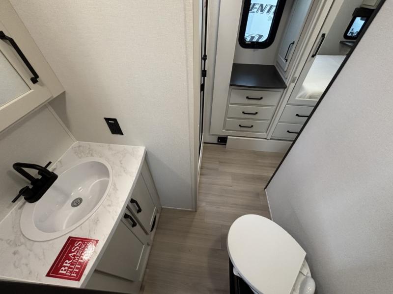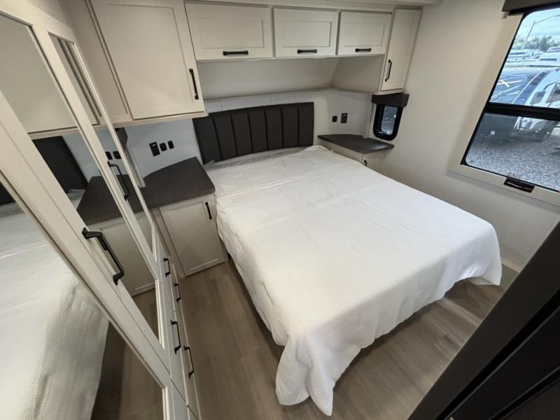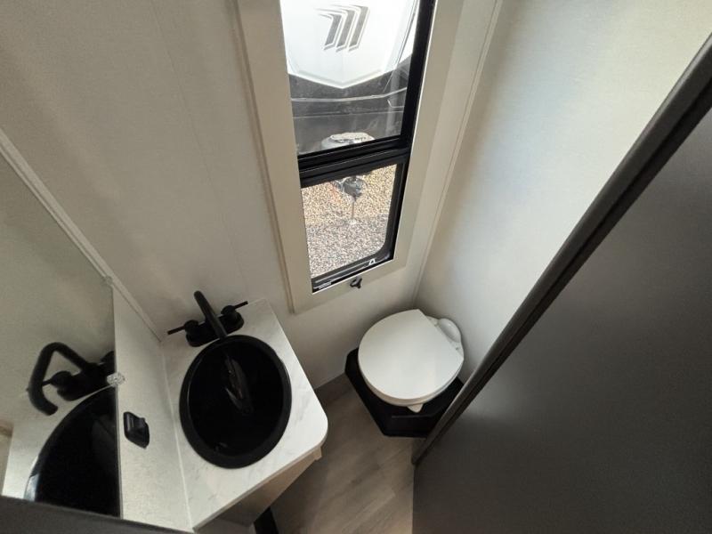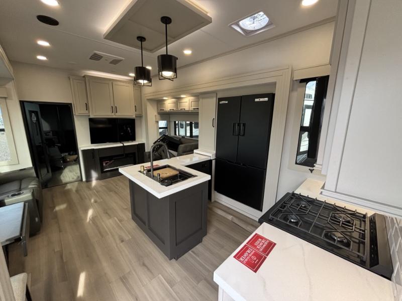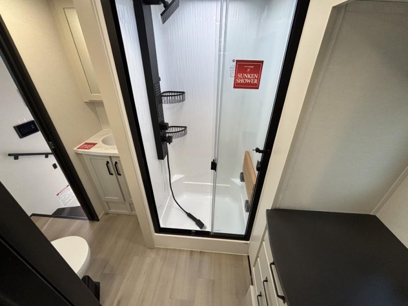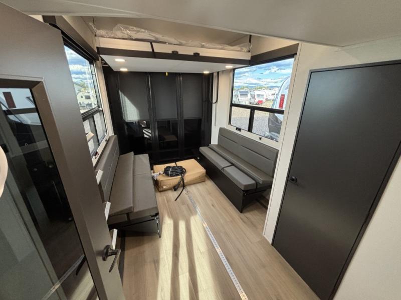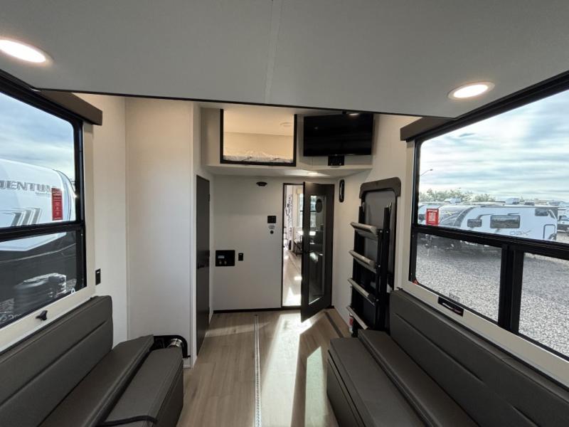 You want a toy hauler to carry your toys to the trails, and include many at-home comforts, and that's just what this unit delivers. A 14' separate garage includes an adjustable tie-down system, an optional Lifesuite System for more sleeping space, an optional half bath, plus washer and dryer prep. There is an overhead loft bed and an L-shaped sofa with recline in the main living area that offers sleeping space as well. Everyone can watch a movie on the LED TV with a fireplace below while sitting on the sofa, in the theatre seats, or while at the free standing dinette with four chairs. The chef will have upgraded appliances to make meals for everyone, an L-shaped countertop with a kitchen sink, and a USB charging outlet. You will love the shower with seat in the full bathroom with two space savings sliding doors that lead into the hallway, and into the front bedroom where you will have a walk-around queen bed, a slide out wardrobe and more USB charging outlets.