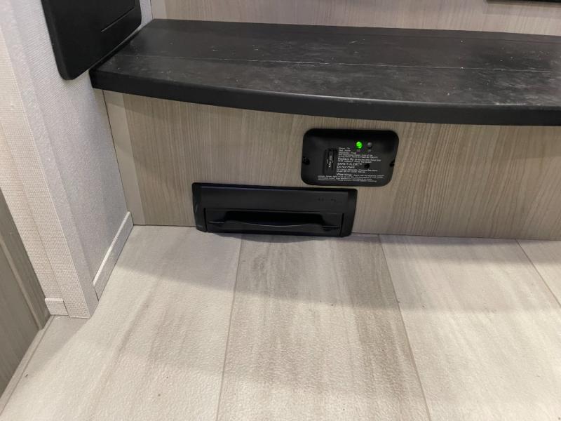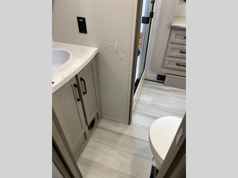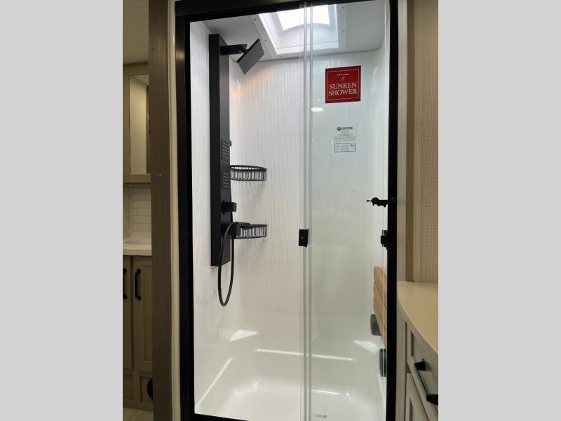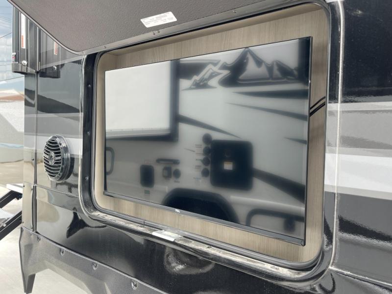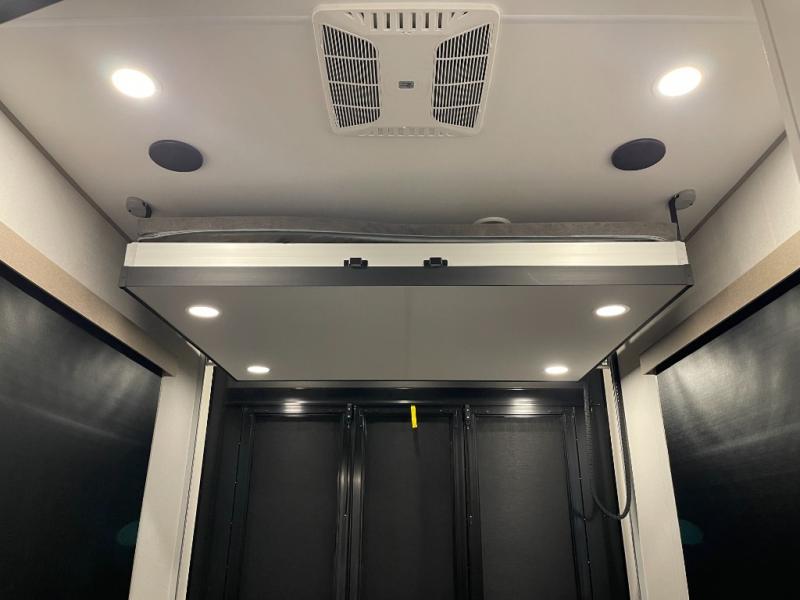 You want a toy hauler to carry your toys to the trails, and include many at-home comforts, and that's just what this unit delivers. A 14' separate garage includes an adjustable tie-down system, an optional Lifesuite System for more sleeping space, an optional half bath, plus washer and dryer prep. There is an overhead loft bed and an L-shaped sofa with recline in the main living area that offers sleeping space as well. Everyone can watch a movie on the LED TV with a fireplace below while sitting on the sofa, in the theatre seats, or while at the free standing dinette with four chairs. The chef will have upgraded appliances to make meals for everyone, an L-shaped countertop with a kitchen sink, and a USB charging outlet. You will love the shower with seat in the full bathroom with two space savings sliding doors that lead into the hallway, and into the front bedroom where you will have a walk-around queen bed, a slide out wardrobe and more USB charging outlets.