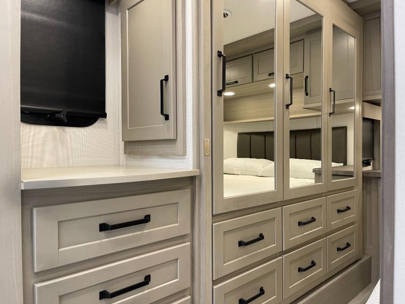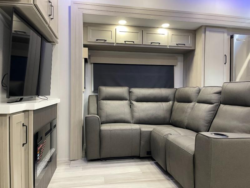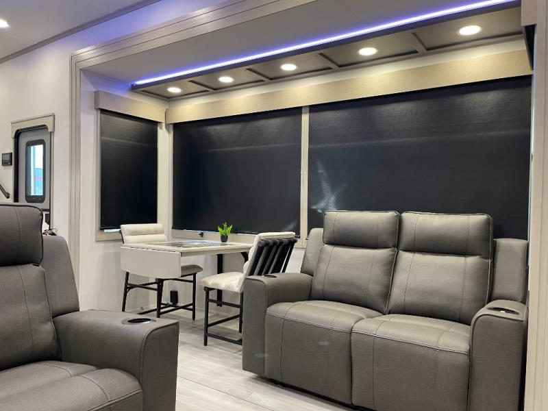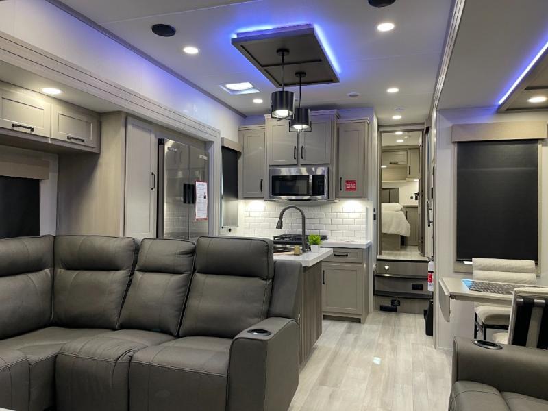 With any Momentum M-Class toy hauler by Grand Design, you will enjoy luxury at every turn! They have been constructed to a superior standard with a thermal roof design, triple insulated main floor and garage floor, and a Rail-Tite underbelly seal that will allow you to camp in all elements. Each model also features an 8' 5" wide body chassis with a wide rail design, no wheel wheels, and a dovetail entry for easier loading. The Stealth A/C system provides maximum cooling power, and the CRE3000 suspension system means you can enjoy a smooth tow each time. You will love the luxurious interior with a professional grade stainless steel cooktop, interior color changing LED accent lighting, a fiberglass shower with a glass door, and solid surface countertops.