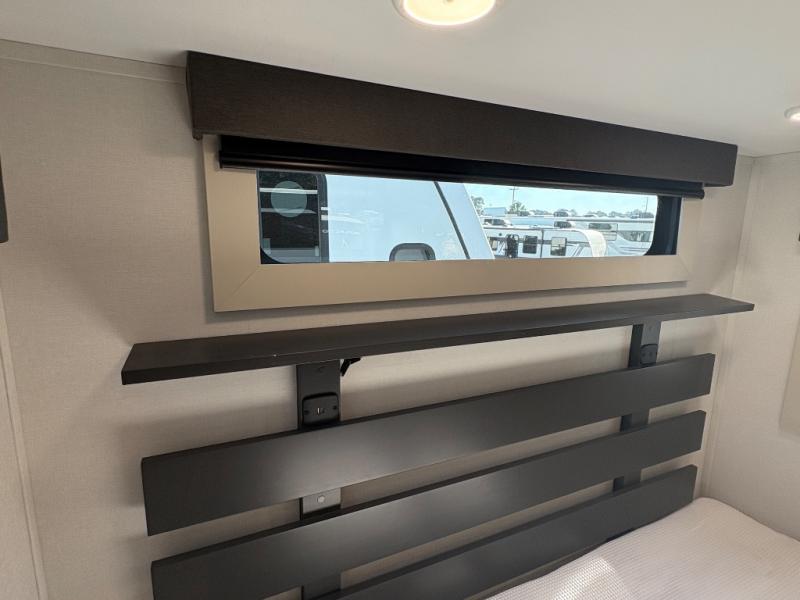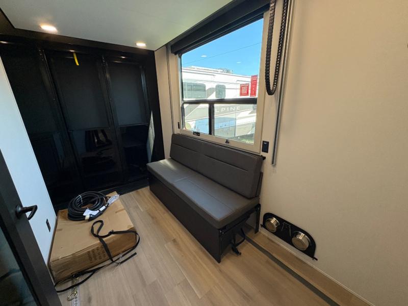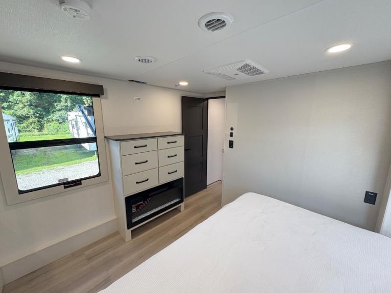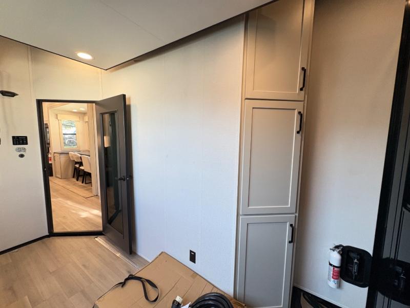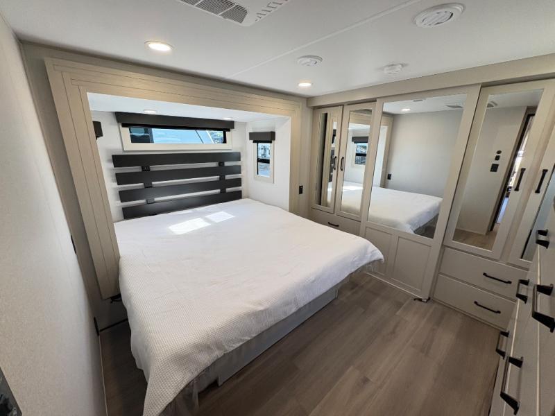 - Front private bedroom with king bed slide out, large closet with washer/dryer prep, and dresser with TV prep