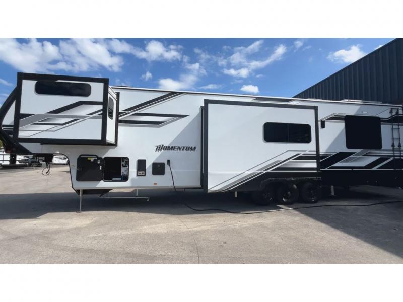 The Momentum fifth wheel toy haulers by Grand Design are built for four seasons of travel with your off-road toys and include luxurious accommodations throughout for extreme living! Each is constructed to a superior standard with the fully enclosed and heated underbelly and storage area, the 5-sided aluminum cage, and the triple insulated garage floor. The MORryde CRE3000 suspension system and rubber pin box, plus the upgraded axle hangers provide the performance and smooth towing you desire, while the interior offers luxury such as color changing LED accent lighting, hardwood cabinet doors with hidden hinges, and a central vacuum system. Each toy hauler also includes four packages, including the Garage Package with Tuff-Ply gas and oil-resistant flooring, the Weather-Tek Package with a Stealth AC System, and the Interior Luxury Package with solid surface countertops!