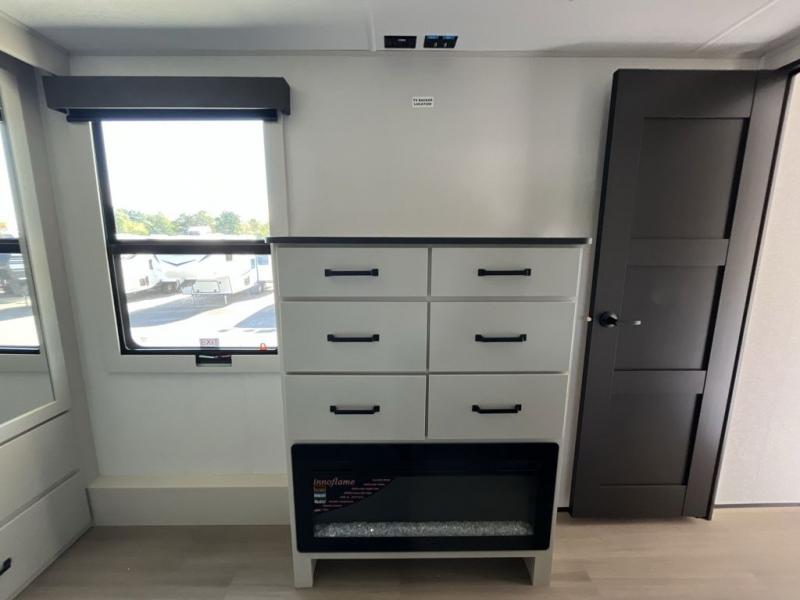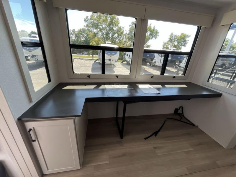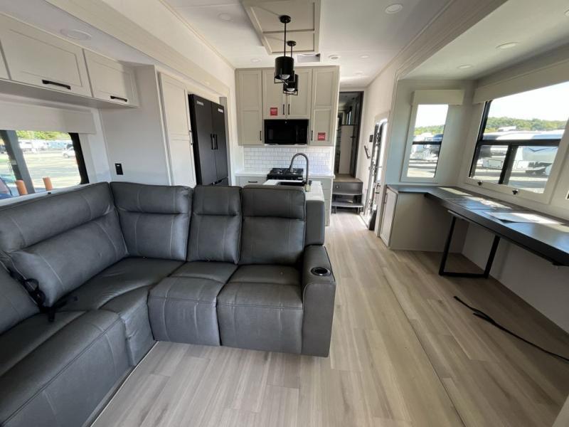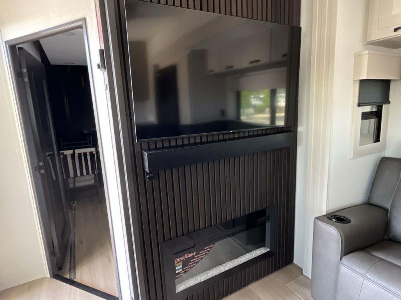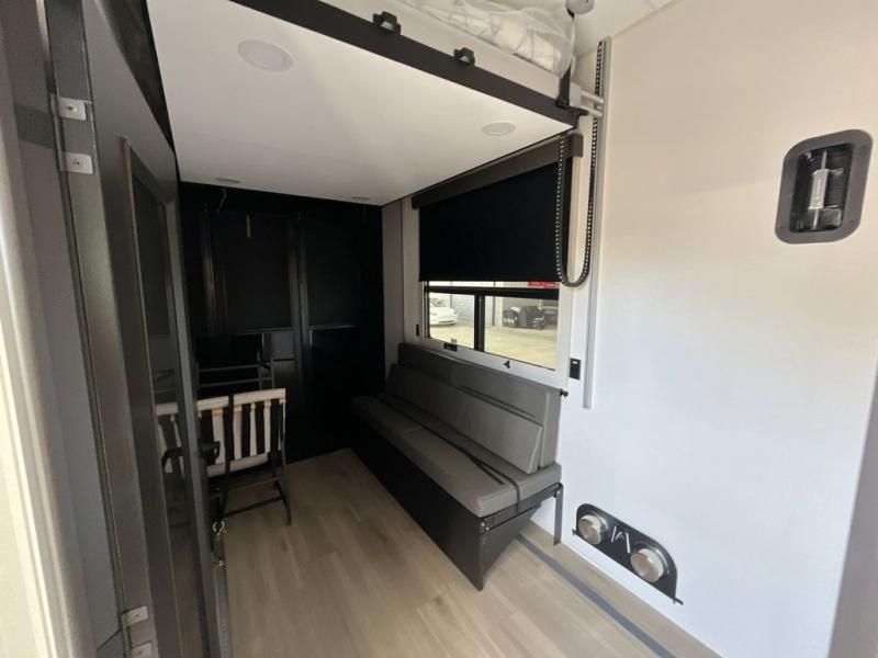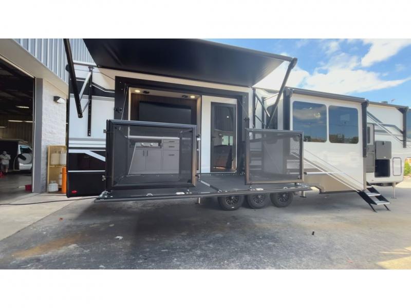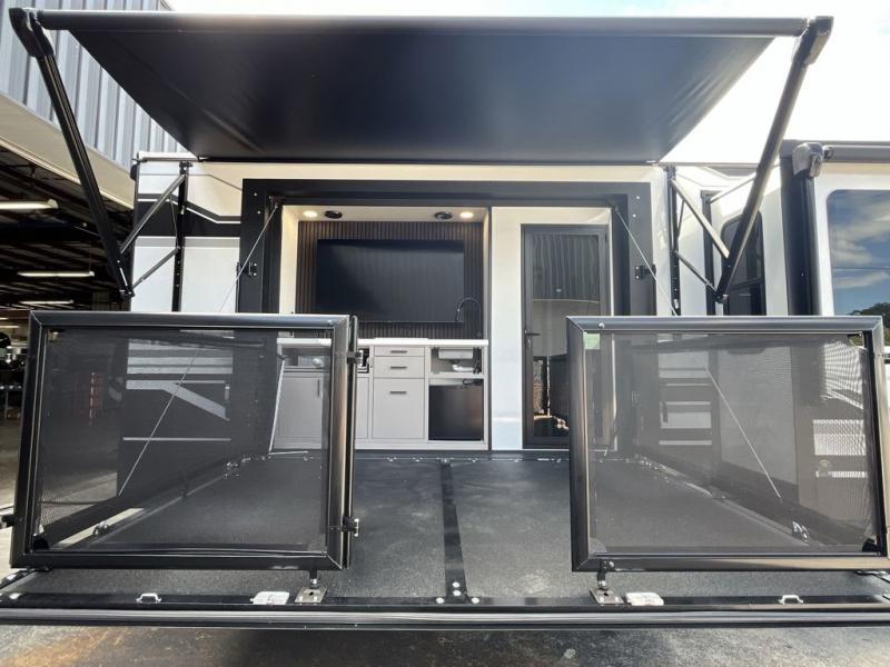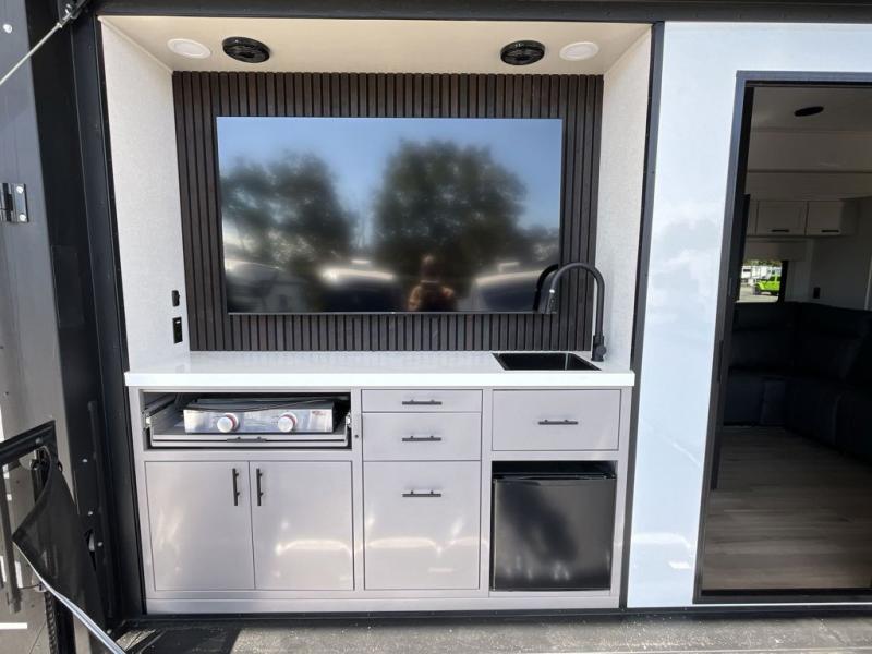 This toy hauler has all the comfort and convenience you could ask for! Once you have unloaded your toys from the 12' 6" separate garage, you can start lunch on the exterior griddle located by the side patio. There is also a 65" TV here and a 1.7 cu. ft. refrigerator to entertain guests! And if you have guests staying over, you can choose to add the optional Liftsuite system with underside can lights in the garage. If the weather isn't cooperating, you can make meals in the fully equipped interior kitchen, complete with an island, pantry, pull-out countertop extension and more. An L-shaped sofa with recliners is in perfect view of the 50" TV and fireplace, and there is even a hybrid desk/dinette with windows where you can get some work done if needed. Head towards the front to freshen up in the full bath before heading to bed in the private bedroom. Here, you'll find a queen bed slide out with an optional king bed, a large closet with washer and dryer prep, plus a dresser with TV prep if you want the option to watch movies in bed!