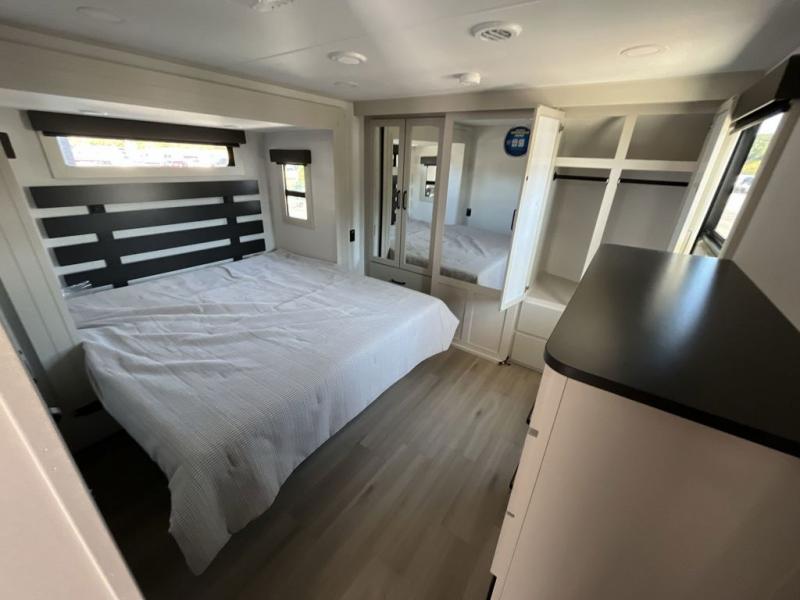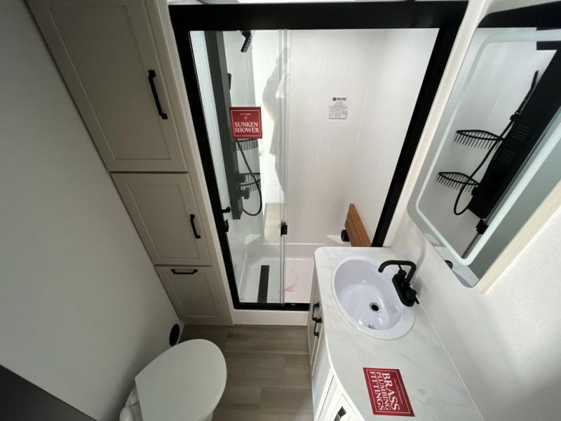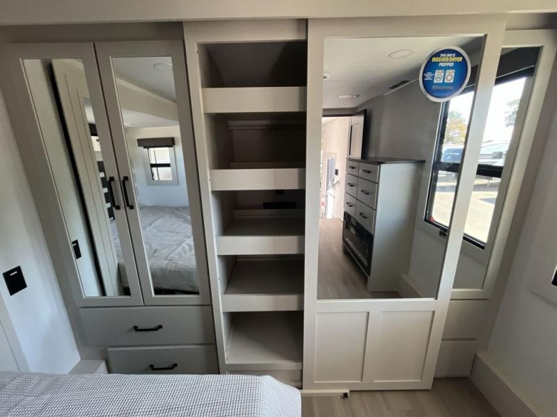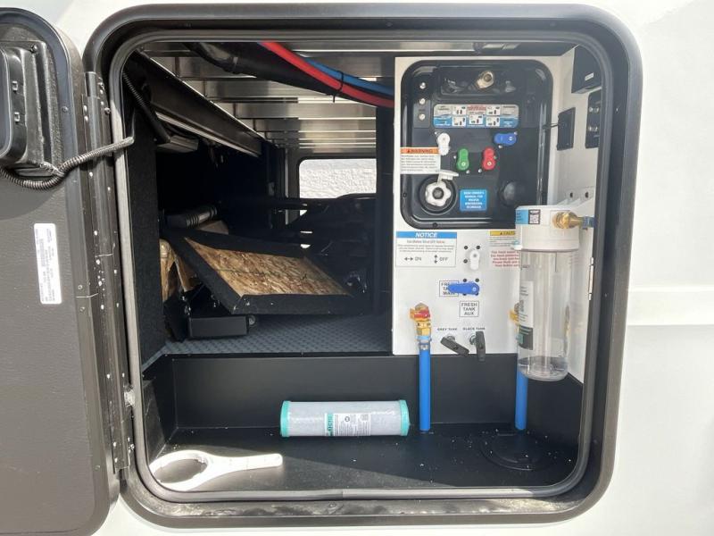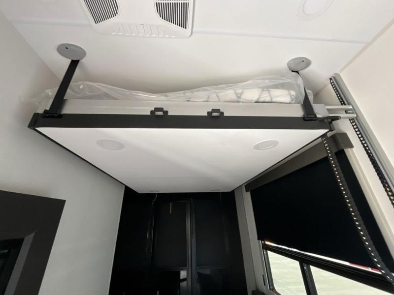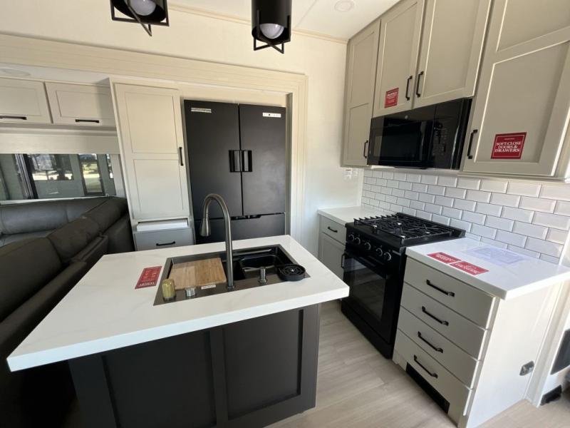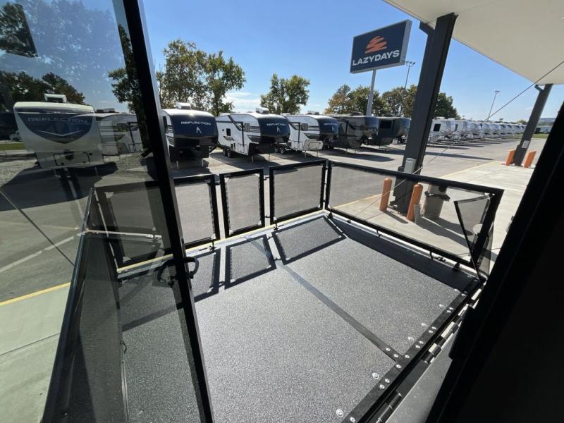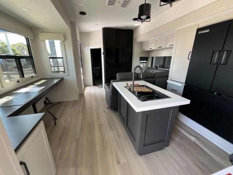 This toy hauler has all the comfort and convenience you could ask for! Once you have unloaded your toys from the 12' 6" separate garage, you can start lunch on the exterior griddle located by the side patio. There is also a 65" TV here and a 1.7 cu. ft. refrigerator to entertain guests! And if you have guests staying over, you can choose to add the optional Liftsuite system with underside can lights in the garage. If the weather isn't cooperating, you can make meals in the fully equipped interior kitchen, complete with an island, pantry, pull-out countertop extension and more. An L-shaped sofa with recliners is in perfect view of the 50" TV and fireplace, and there is even a hybrid desk/dinette with windows where you can get some work done if needed. Head towards the front to freshen up in the full bath before heading to bed in the private bedroom. Here, you'll find a queen bed slide out with an optional king bed, a large closet with washer and dryer prep, plus a dresser with TV prep if you want the option to watch movies in bed!