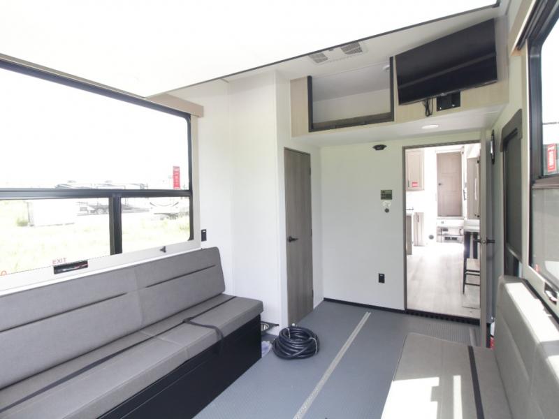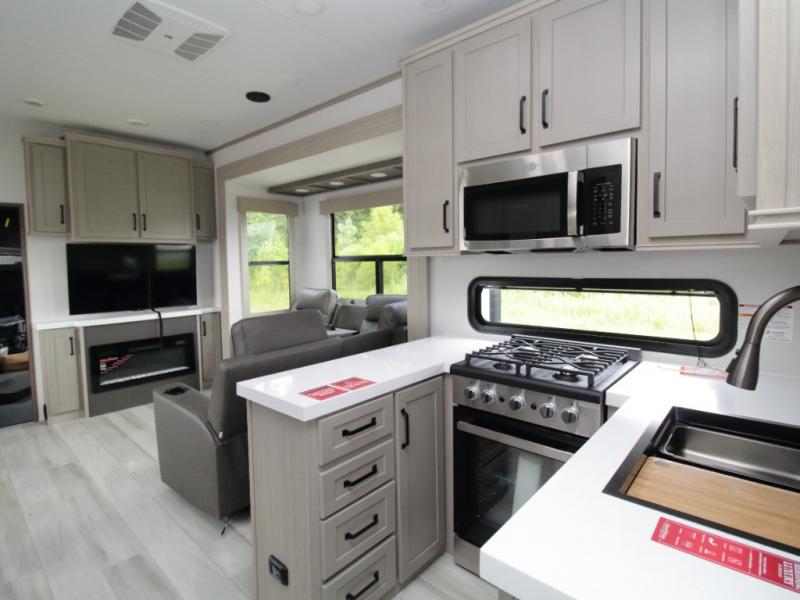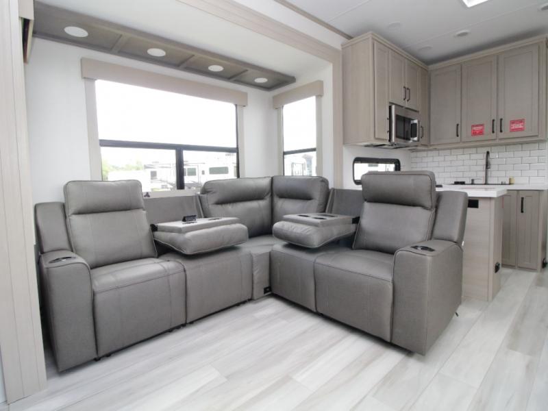 With the 2026 Grand Design Momentum 414M, your adventures are about to go beyond the ordinary! 14 ft garage, spacious kitchen pantry, and queen bed slide out!