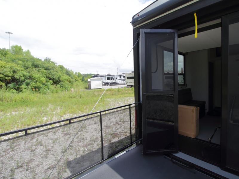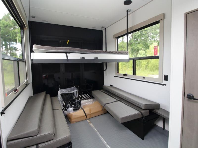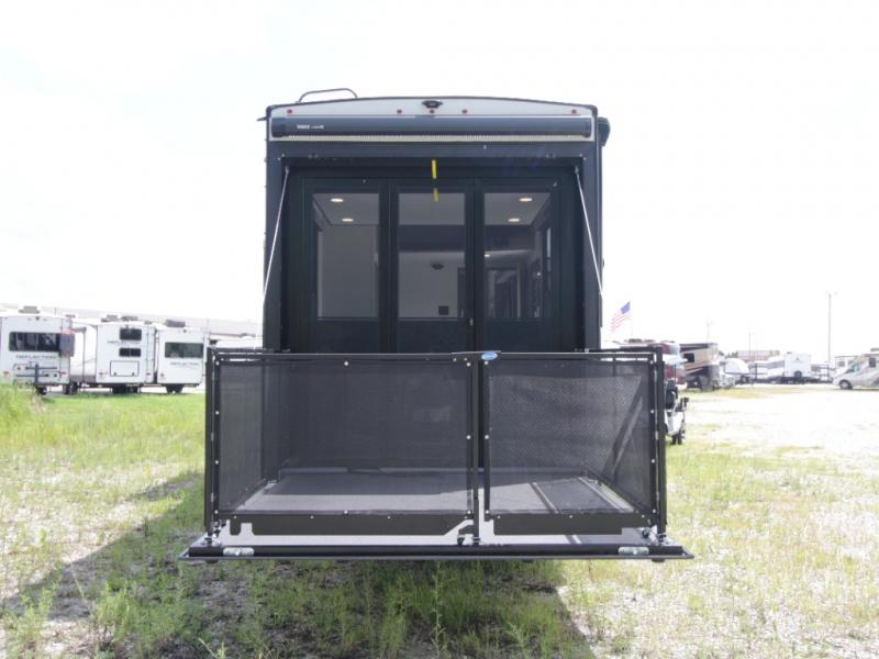 The 14-foot garage offers a flexible space to haul ATVs, motorcycles, kayaks, and more. It also features an overhead loft bed, a convenient flip-up pet dish, and the option to add a Liftsuite System and a half bath, making it ideal for guests or extended stays.