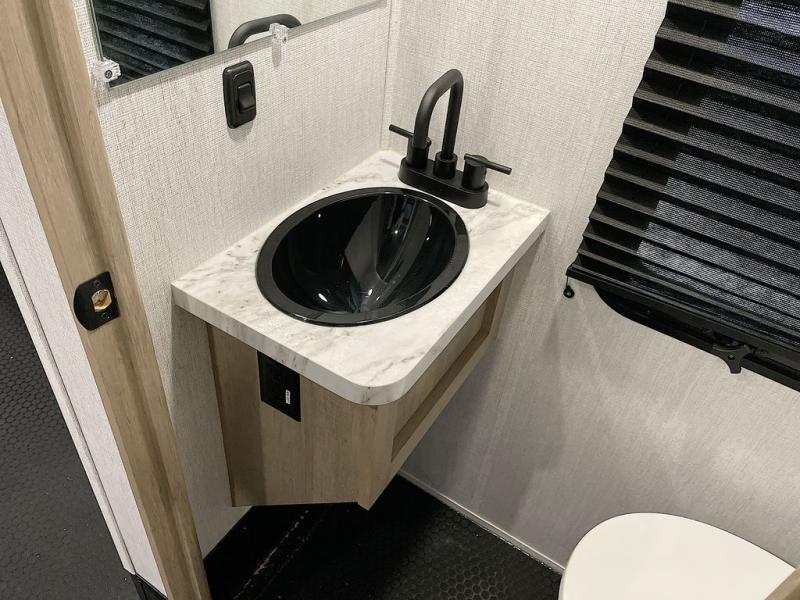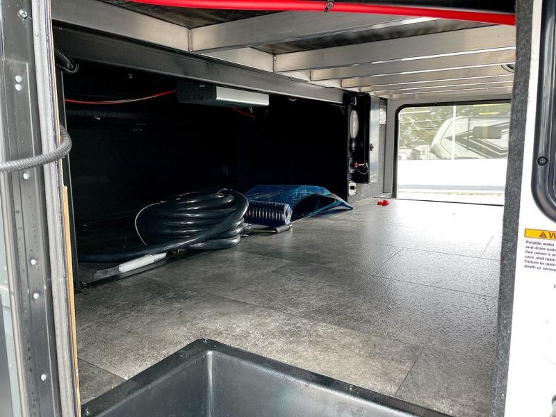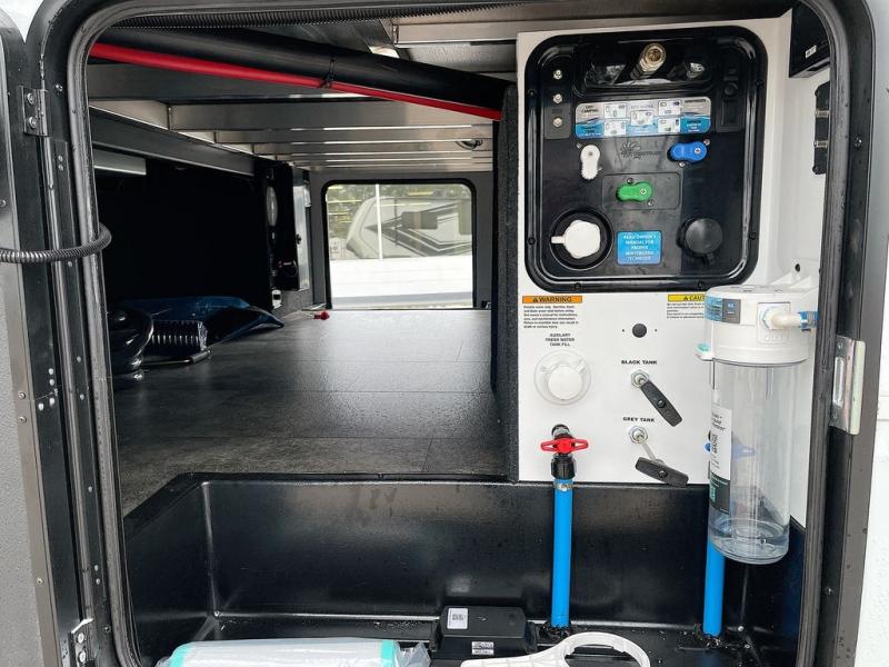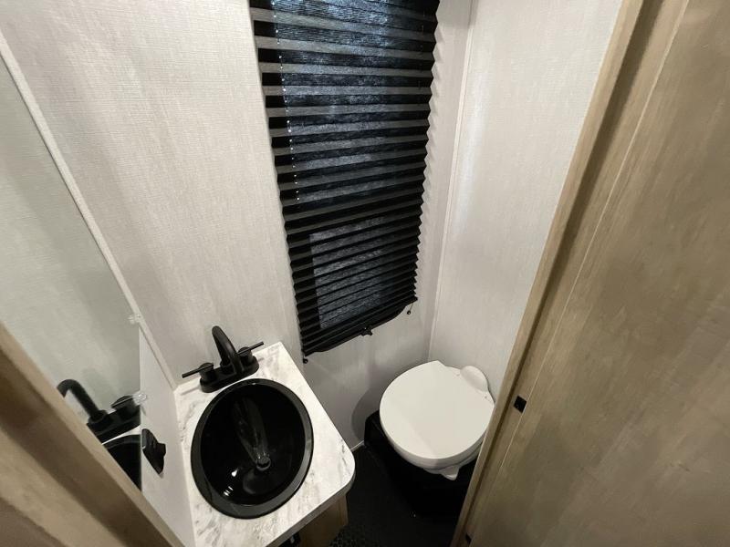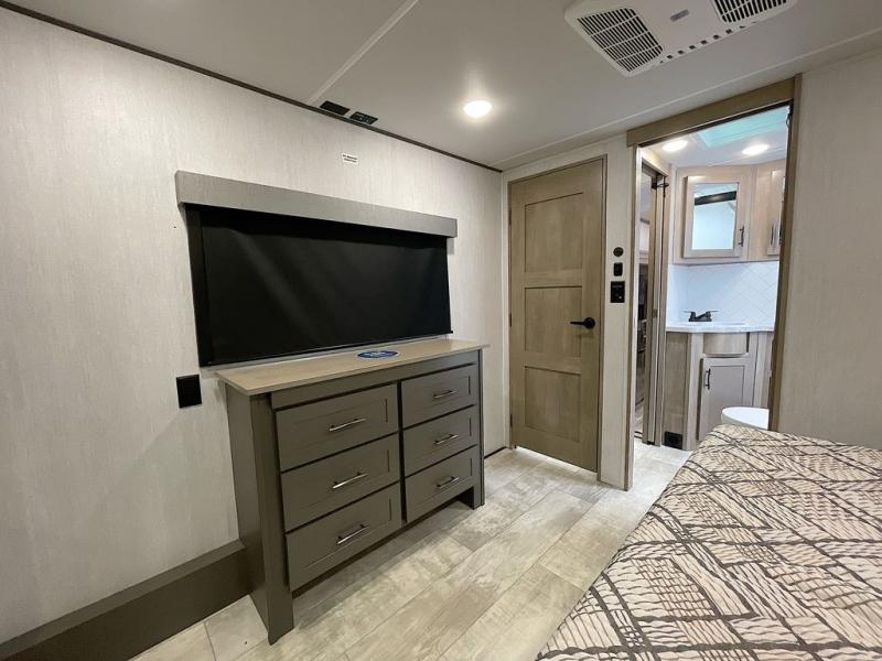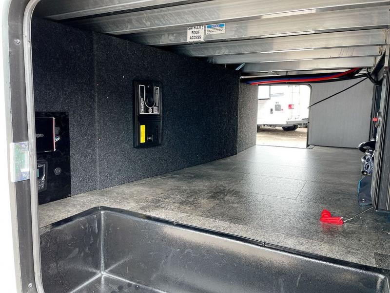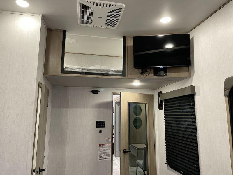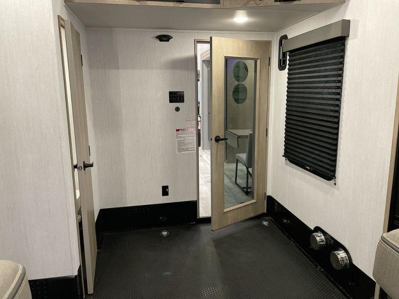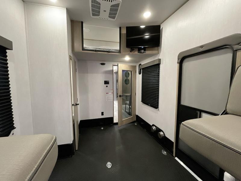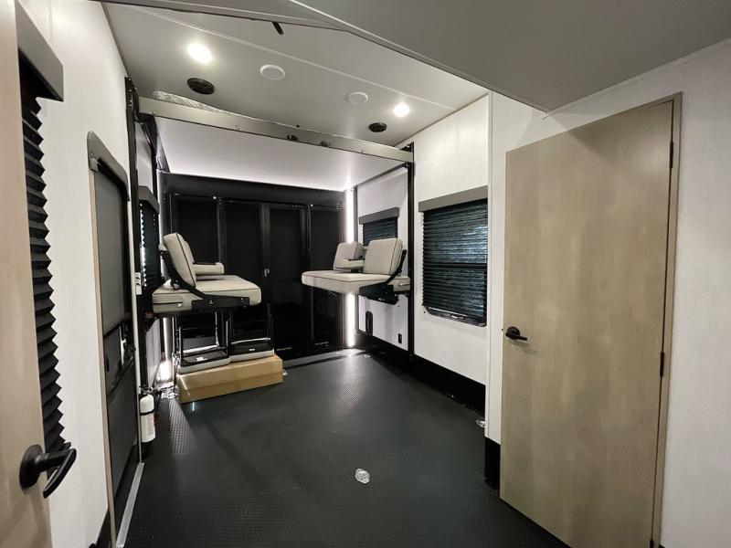Any time spent in this spacious toy hauler will be time well spent! The 14' garage includes an overhead loft bed and a flip-up pet dish for your furry friends. If you're needing more sleeping space, you might want to choose the optional Liftsuite System and optional half bath. Once you enter in the main living area, you can relax on the L-shaped sofa with recline across from the fireplace, and there is a free-standing dinette if you want to play a game or two. The chef of your group will love the generous counter space in the kitchen, and the dual entry bath will let everyone stay clean throughout your trip! Head to the front master bedroom to enjoy the queen bed slide out with an optional king bed, a slide top dresser with TV prep, plus a large front closet, complete with washer and dryer prep!