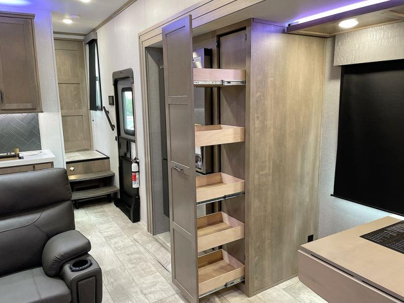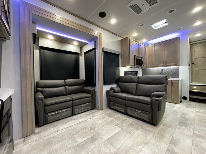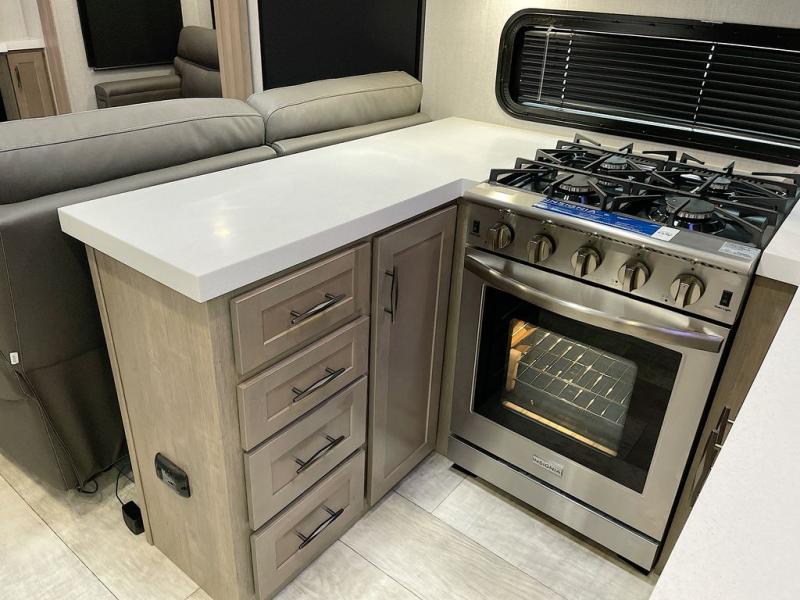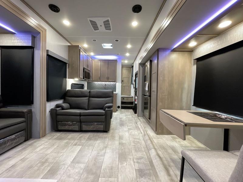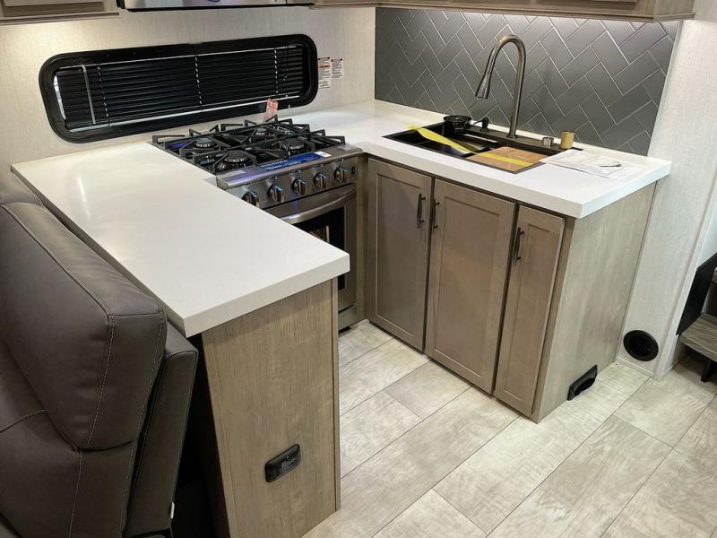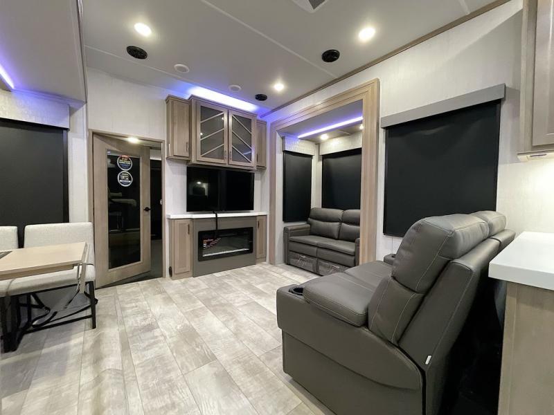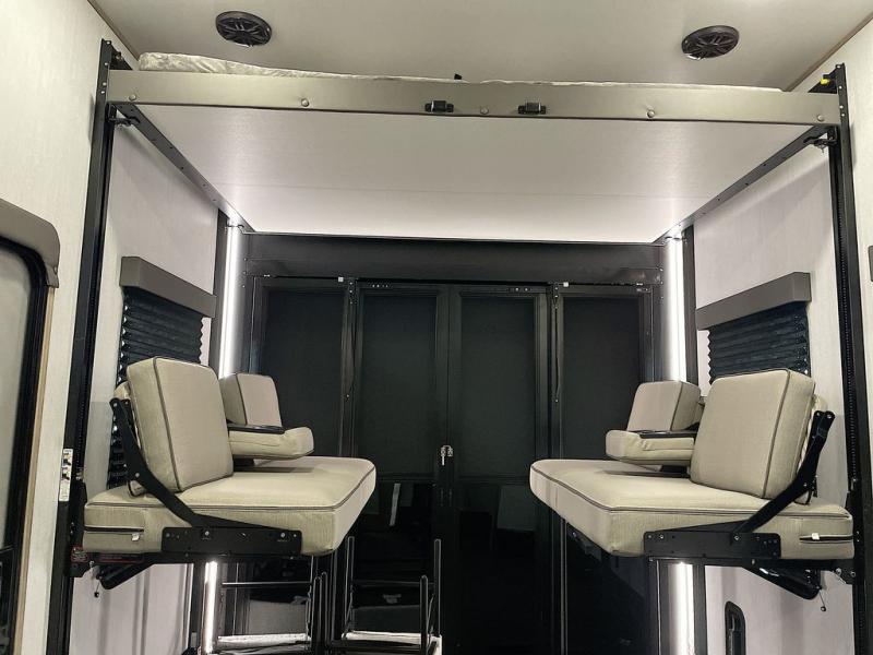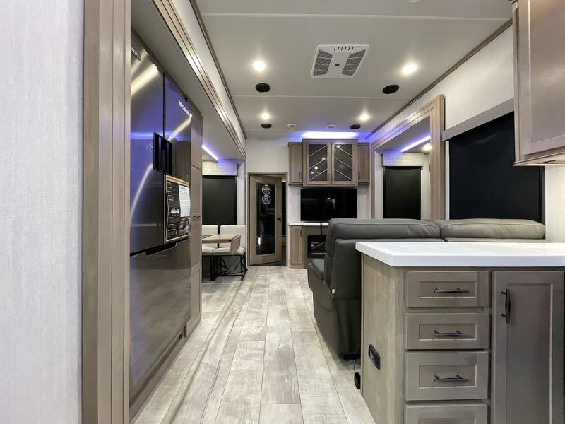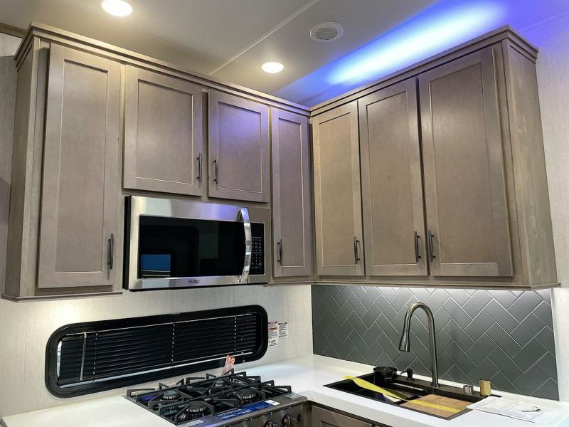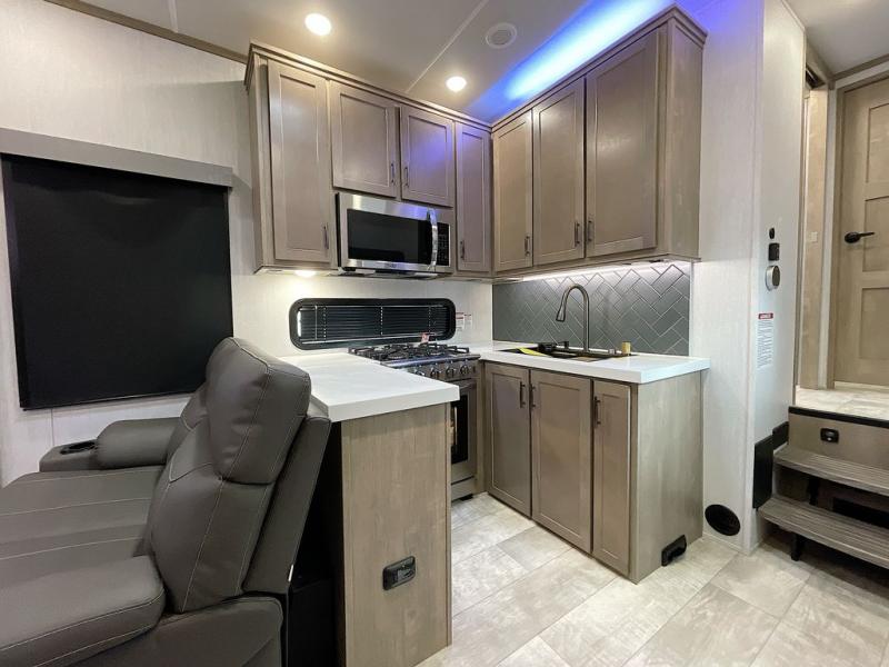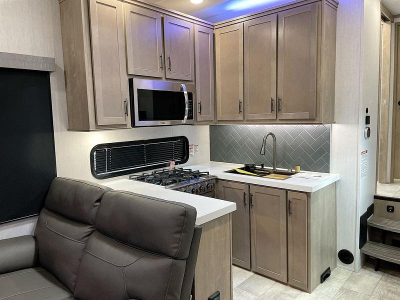 With any Momentum M-Class toy hauler by Grand Design, you will enjoy luxury at every turn! They have been constructed to a superior standard with a thermal roof design, triple insulated main floor and garage floor, and a Rail-Tite underbelly seal that will allow you to camp in all elements. Each model also features a, 8' 5" wide body chassis with a wide rail design, no wheel wheels, and a dovetail entry for easier loading. The Stealth A/C system provides maximum cooling power, and the CRE3000 suspension system means you can enjoy a smooth tow each time. You will love the luxurious interior with a professional grade stainless steel cooktop, interior color changing LED accent lighting, a fiberglass shower with a glass door, and solid surface countertops.