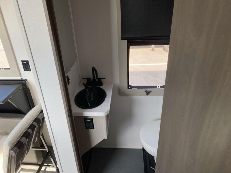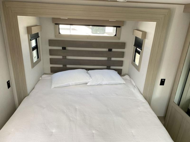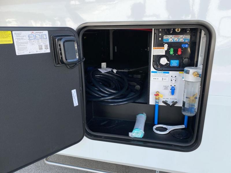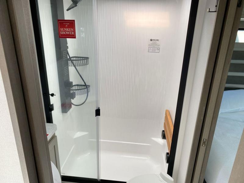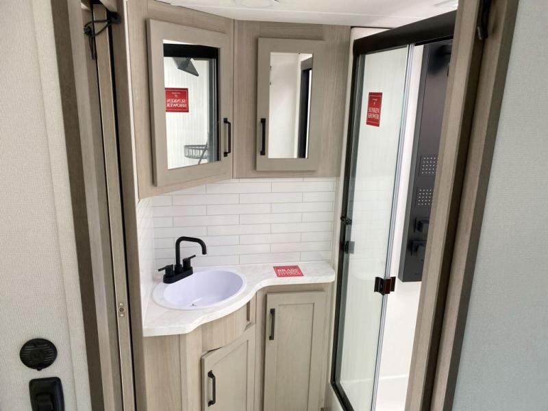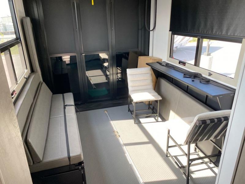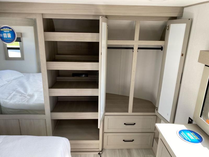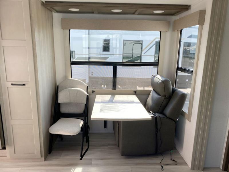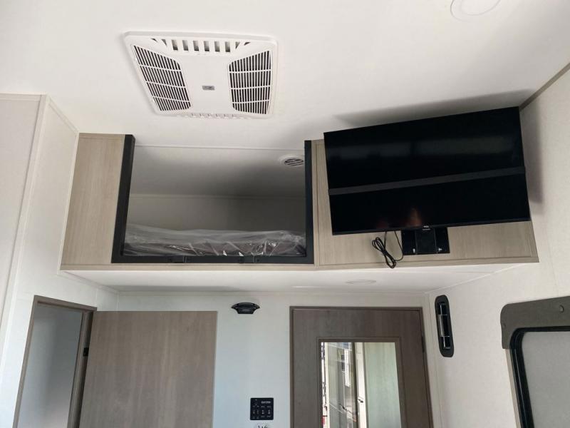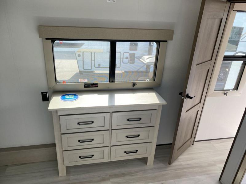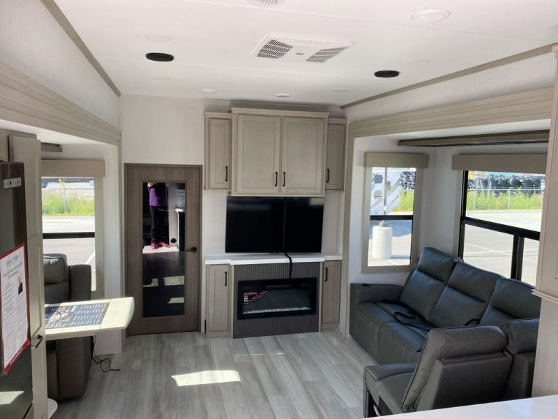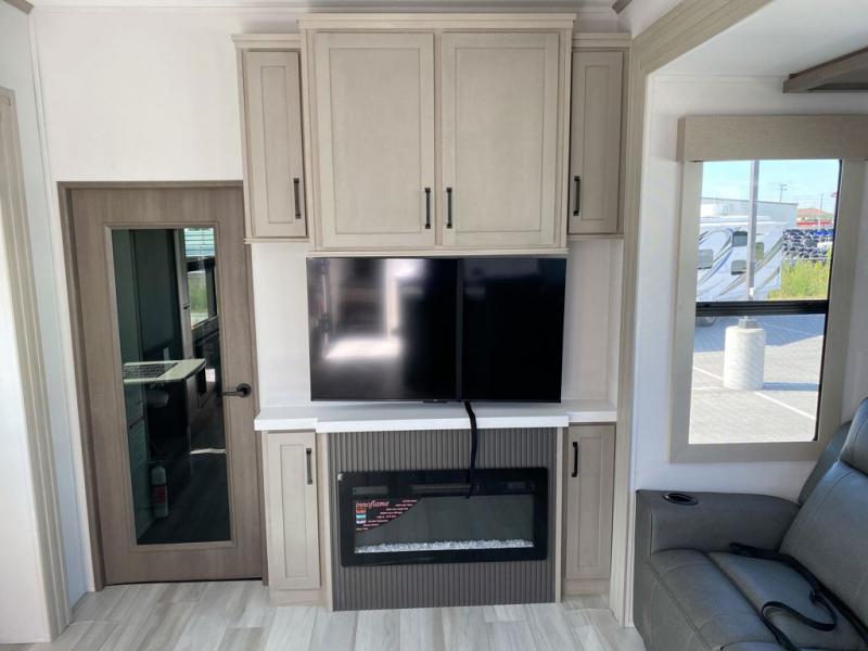 Any time spent in this spacious toy hauler will be time well spent! The 14' garage includes a Liftsuite system, an overhead loft bed and a flip-up pet dish for your furry friends. Once you enter in the main living area, you can relax on the L-shaped sofa with recline across from the fireplace, and there is a free-standing dinette if you want to play a game or two. The chef of your group will love the generous counter space in the kitchen, and the dual entry bath will let everyone stay clean throughout your trip! Head to the front master bedroom to enjoy the queen bed slide out with an optional king bed, a slide top dresser with TV prep, plus a large front closet, complete with washer and dryer prep!