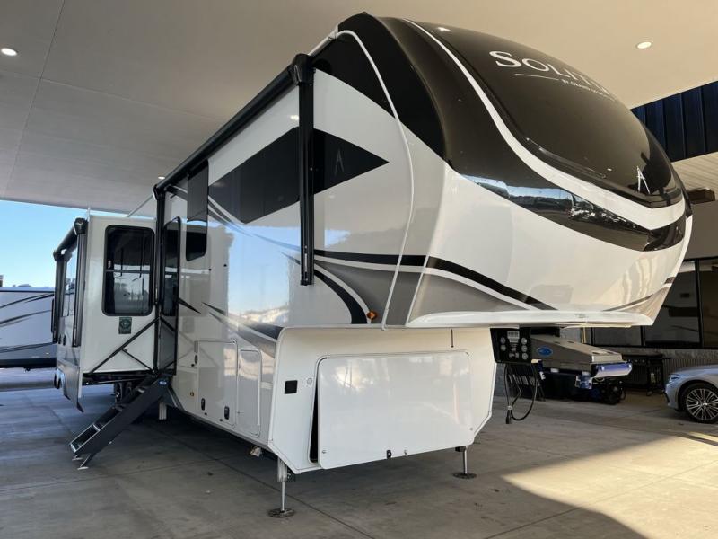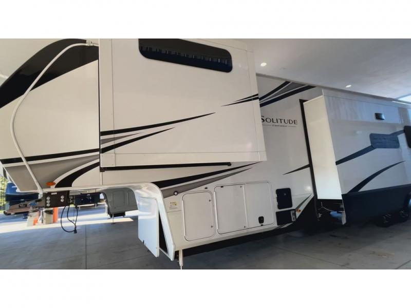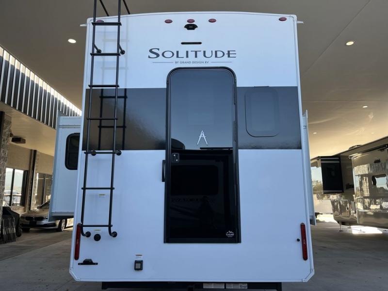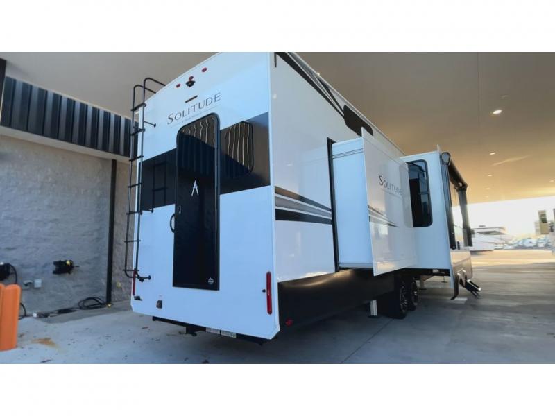 Each Solitude fifth wheel by Grand Design features a 101" wide-body construction, heavy duty 8,000 lb. axles, frameless tinted windows, and high-gloss gel coat sidewalls. You can camp year around thanks to the Weather-Tek Package that includes a 35K BTU high-capacity furnace, an all-in-one enclosed and heated utility center, and a fully enclosed underbelly with heated tanks and storage. Inside, you'll love the premium roller shades, hardwood cabinet doors, solid surface countertops, plus residential finishes throughout to make you truly feel at home. Each model also includes a MORryde CRE3000 suspension system, self adjusting brakes, and a MORryde pin box that will provide smooth towing from home to campground. Affordable luxury is possible with the Solitude fifth wheels; choose yours today!