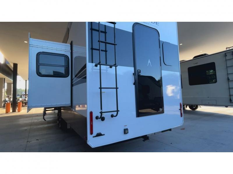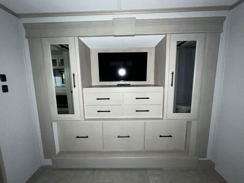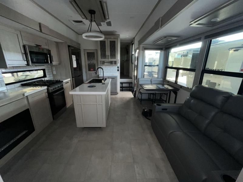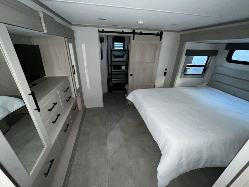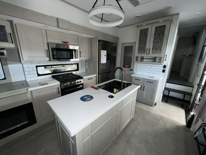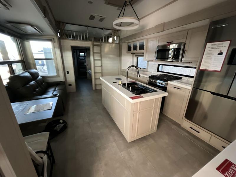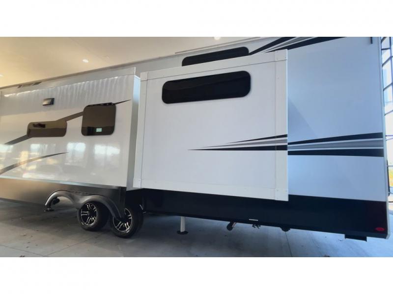 For an affordable luxury extended stay for your family, this Solitude is it! Two private bedrooms plus an overhead Sky Suite loft above the rear bedroom which also has it's own private rear entry/exit door is just the beginning of what is in store for your camping convenience. The upscale kitchen features an island with dishwasher prep, a smart sink, a 12V 20 cu. ft. refrigerator for your perishables, and a built-in oven. There is also a microwave, pantry, and hutch for your dishes, plus a free standing dinette! You can easily take along extra family and friends with the second private bedroom featuring it's own private bath and entry which is great for another couple, and there is even loft space above this rear private bedroom for added storage or sleeping for children. And, you will find ample storage for clothing and belongings throughout with nice size closets, overhead cabinets, plus loads of outside storage.