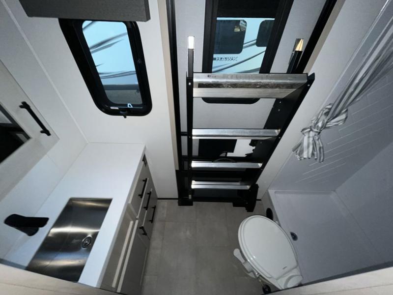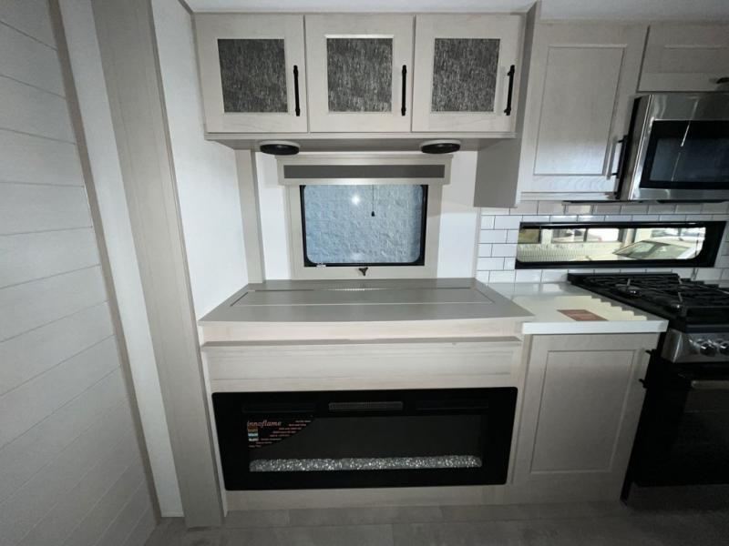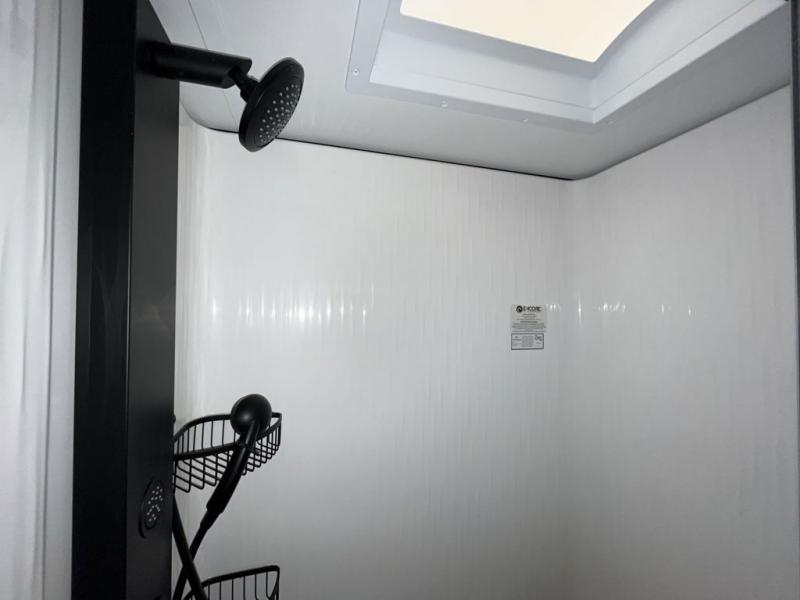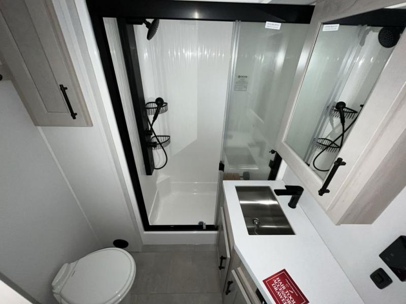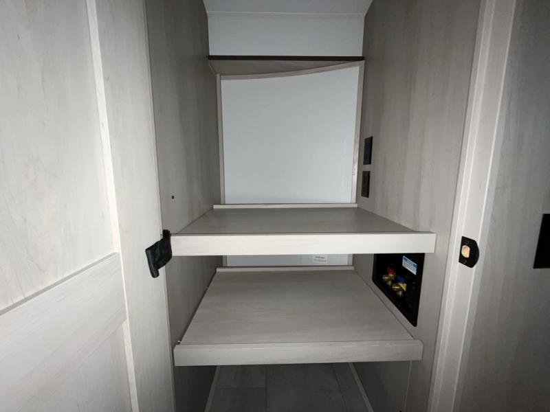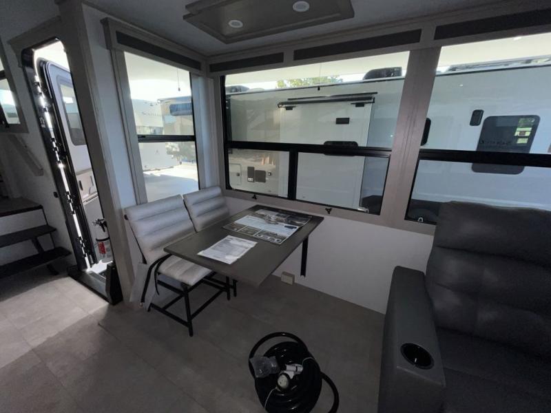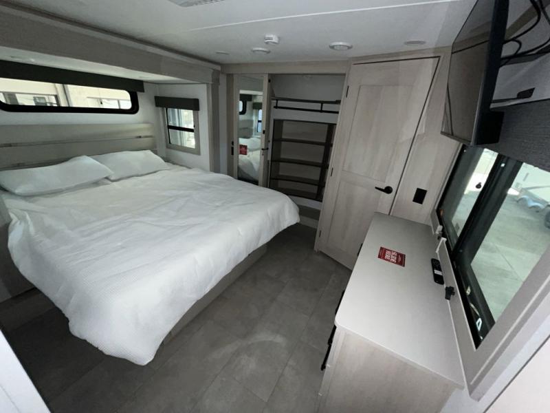 For an affordable luxury extended stay for your family, this Solitude is it! Two private bedrooms plus an overhead Sky Suite loft above the rear bedroom which also has it's own private rear entry/exit door is just the beginning of what is in store for your camping convenience. The upscale kitchen features an island with dishwasher prep, a smart sink, a 12V 20 cu. ft. refrigerator for your perishables, and a built-in oven. There is also a microwave, pantry, and hutch for your dishes, plus a free standing dinette! You can easily take along extra family and friends with the second private bedroom featuring it's own private bath and entry which is great for another couple, and there is even loft space above this rear private bedroom for added storage or sleeping for children. And, you will find ample storage for clothing and belongings throughout with nice size closets, overhead cabinets, plus loads of outside storage.