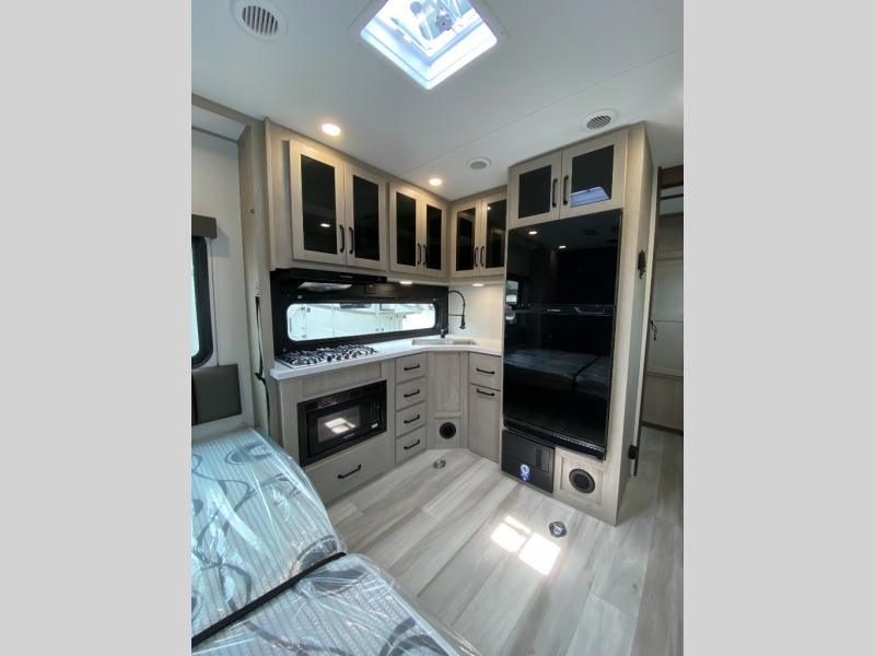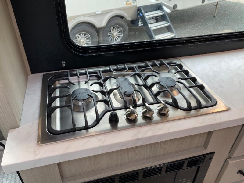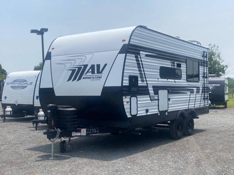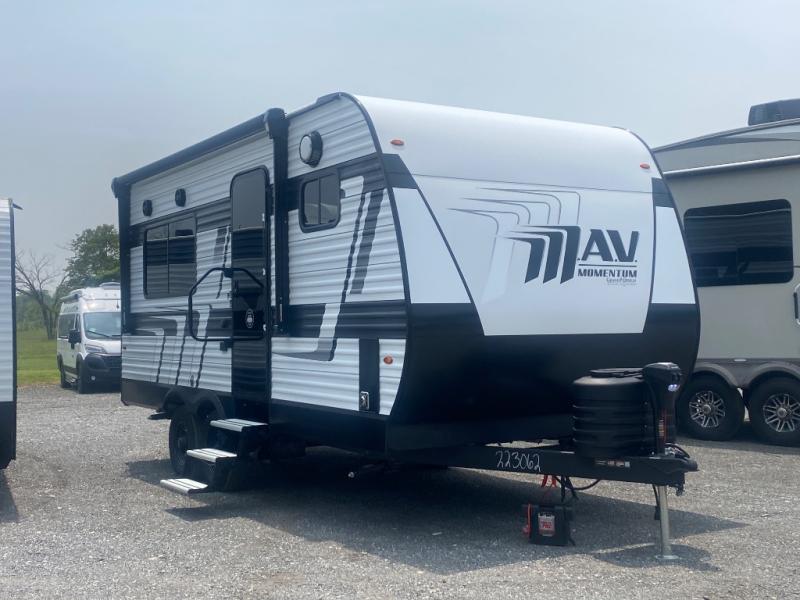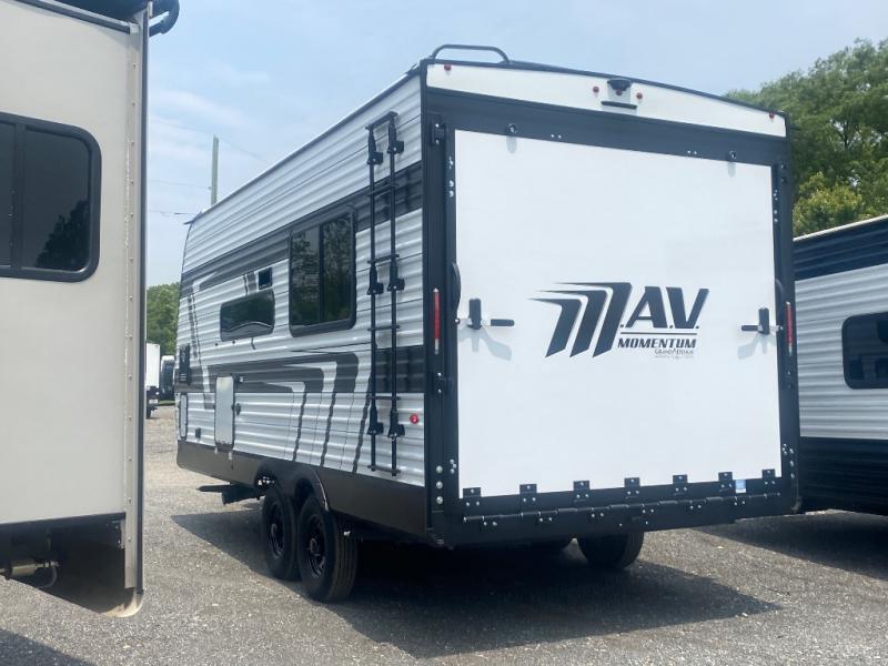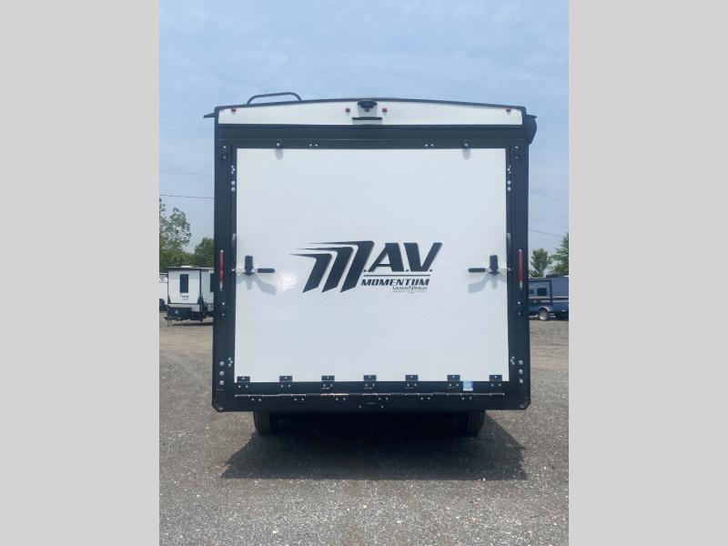 The Momentum MAV toy hauler travel trailers by Grand Design are designed to provide exactly what you need. The spacious garage provides tons of cargo space, with no wheel wells to get in the way. Additional storage includes magnetic storage door catches, and overhead consoles throughout. Conveniences like motion sensor lights and USB outlets will make your life easier, and you will be comfortable in all seasons with the 30K BTU furnace plus 15K BTU ducted air conditioning. The standard Solar Package comes with a 180W solar panel, a 40 Amp charge controller with Bluetooth, and a 12V refrigerator so you can go off-grid when the adventure calls for it.