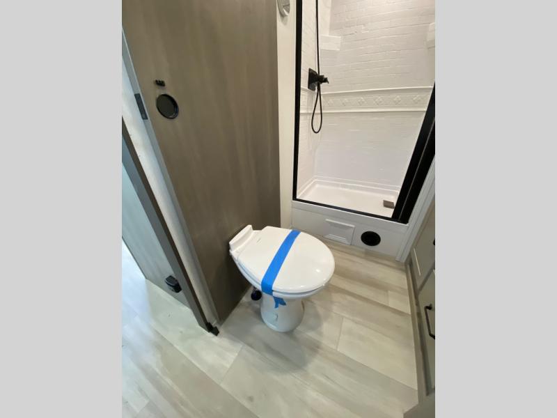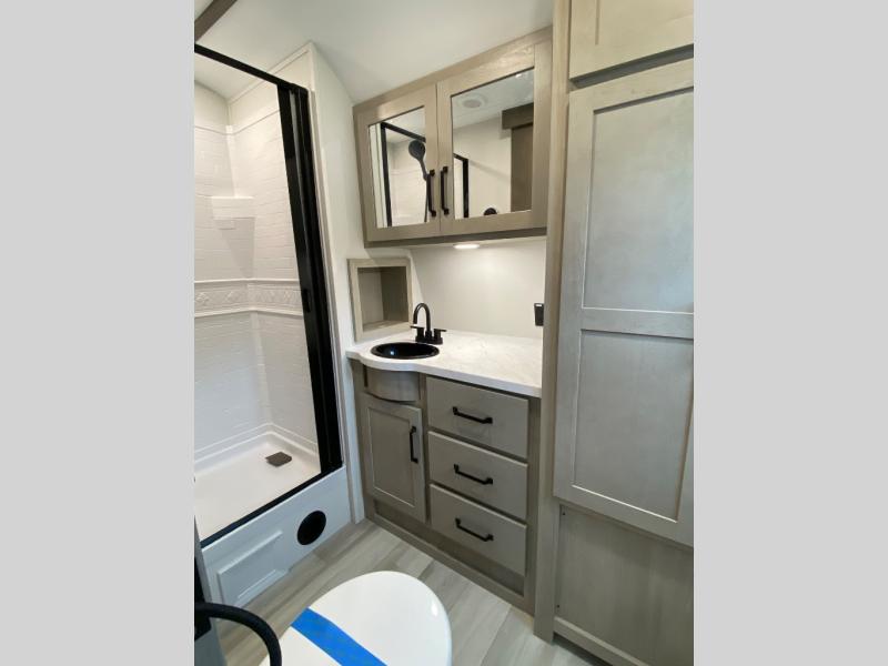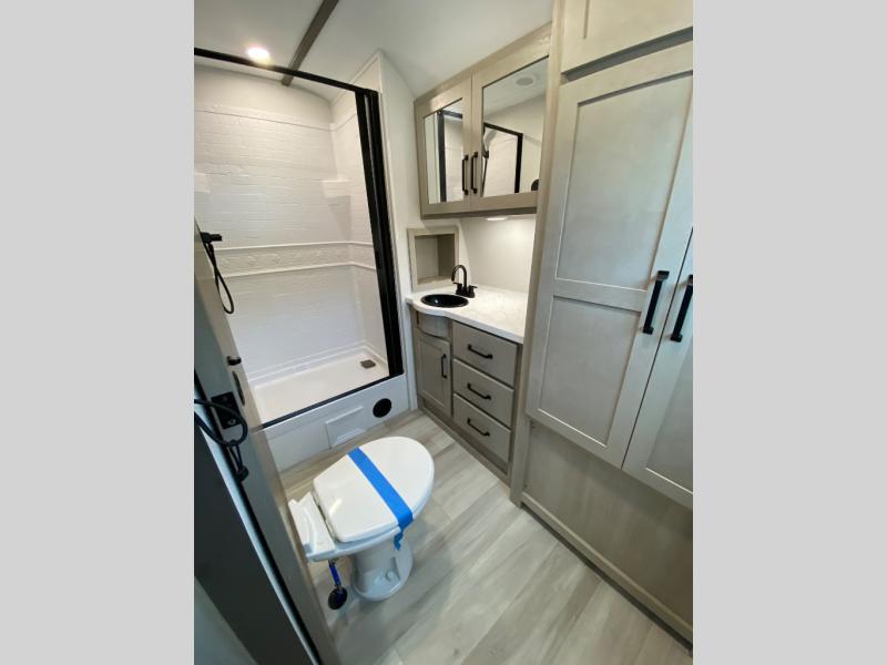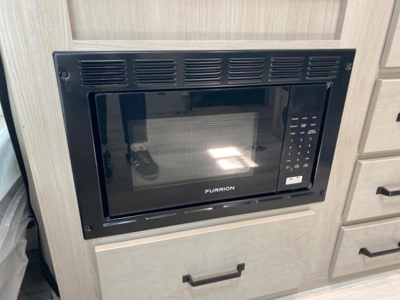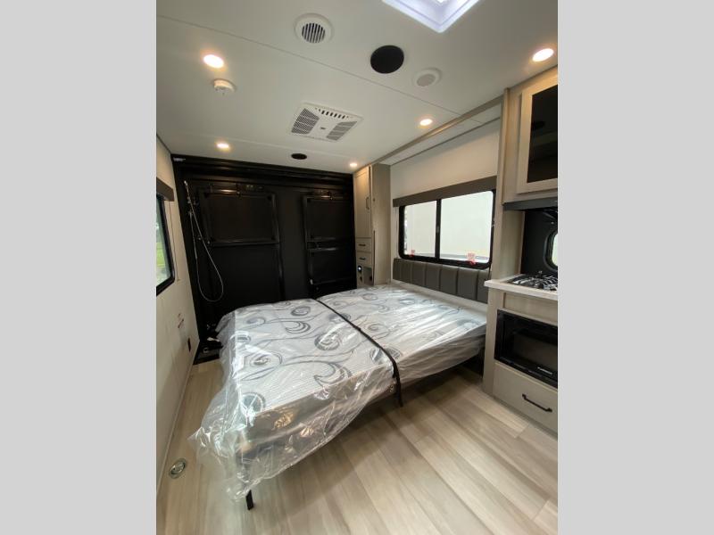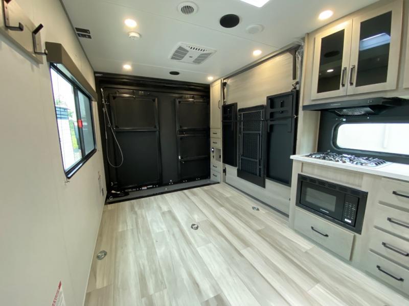 Get ready to take your adventures to the next level with this amazing toy Hauler. A spacious interior features a queen-sized murphy bed, perfect for relaxing after a long day of exploring. A convenient microwave and three-burner cooktop offer endless culinary possibilities, while a 12V 8cu. refrigerator keeps your essentials at the perfect temperature. Ample overhead cabinets provide additional storage for gear, cookware, and more. At the front of this toy hauler, a full bathroom with a closet provides a private retreat, and the ramp door/patio offers easy access to your toys and outdoor living space. Plus, a 13' awning offers shade and protection from the elements.
