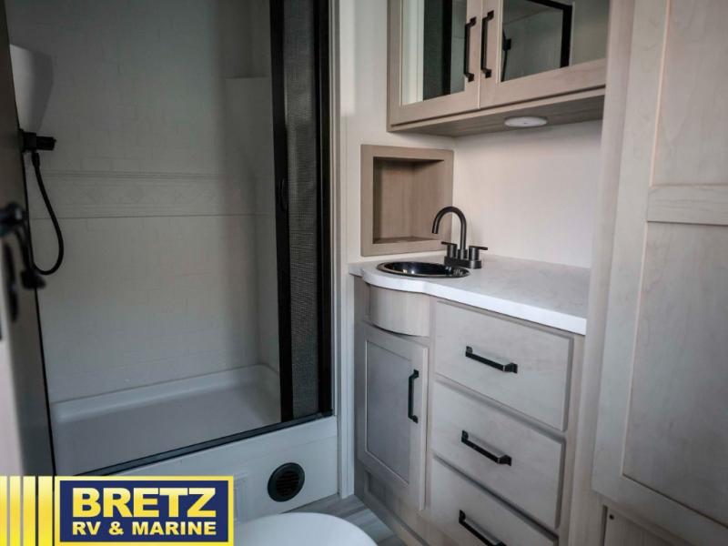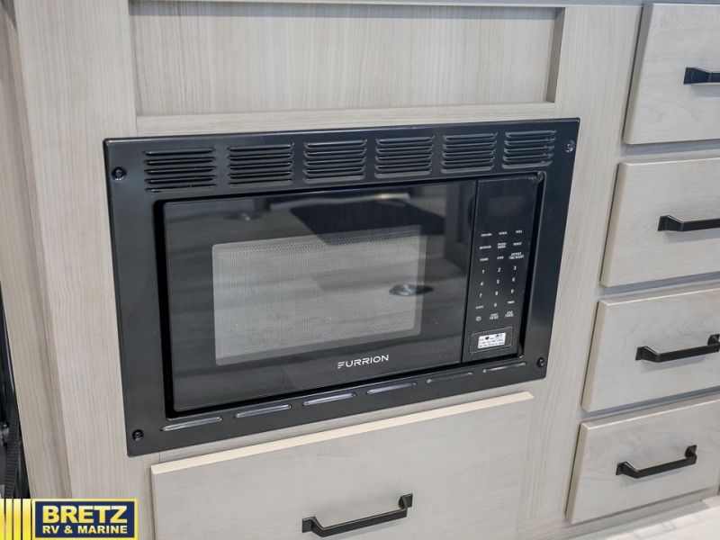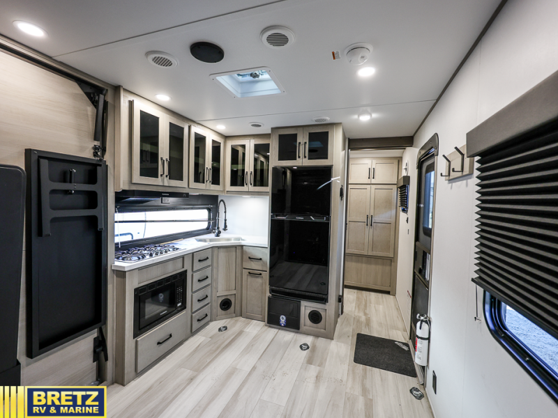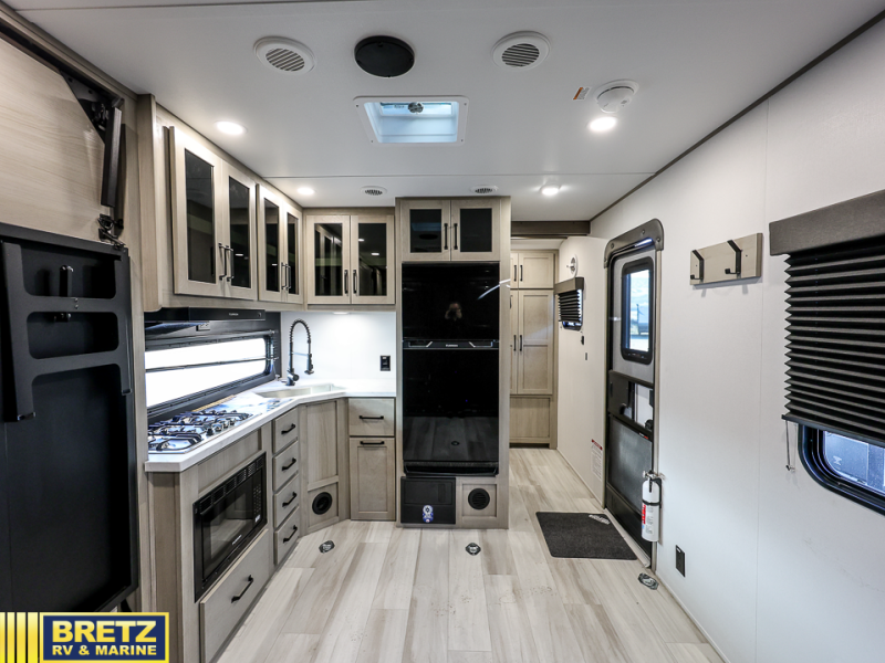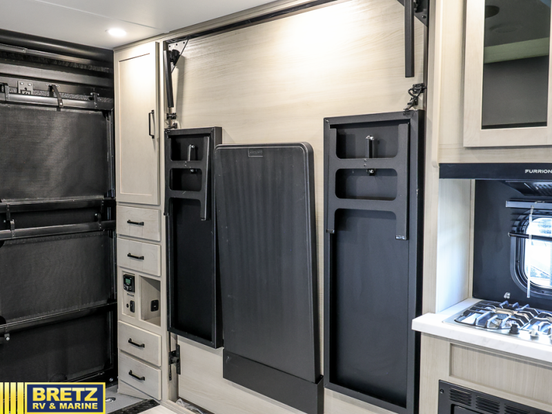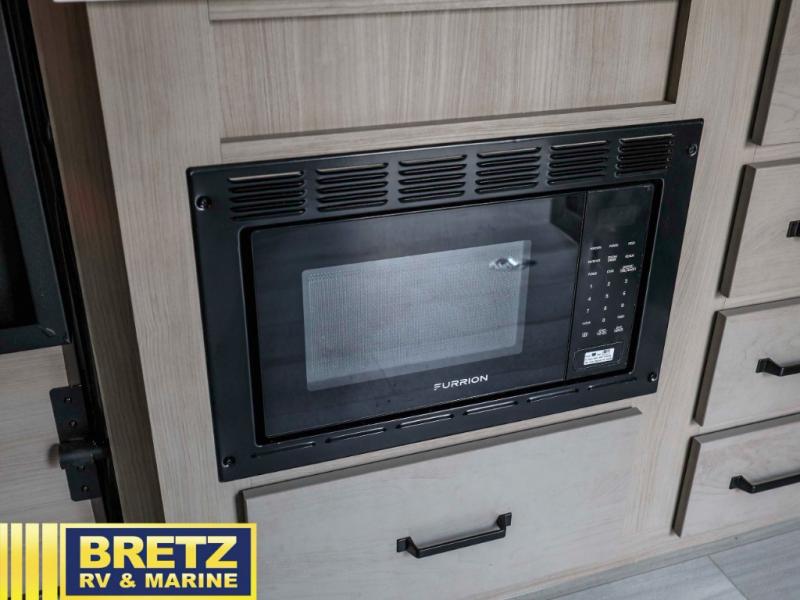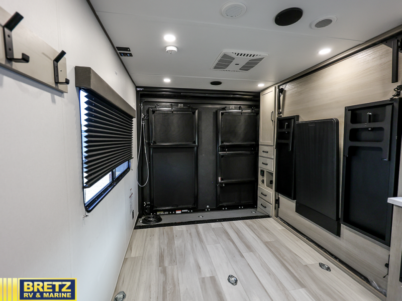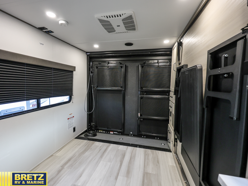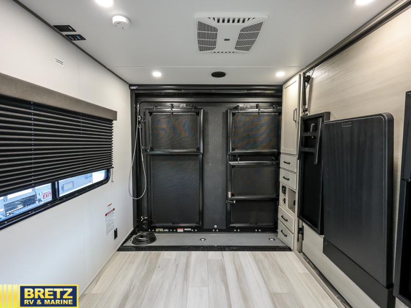 Get ready to take your adventures to the next level with this amazing toy Hauler. A spacious interior features a queen-sized murphy bed, perfect for relaxing after a long day of exploring. A convenient microwave and three-burner cooktop offer endless culinary possibilities, while a 12V 8cu. refrigerator keeps your essentials at the perfect temperature. Ample overhead cabinets provide additional storage for gear, cookware, and more. At the front of this toy hauler, a full bathroom with a closet provides a private retreat, and the ramp door/patio offers easy access to your toys and outdoor living space. Plus, a 13' awning offers shade and protection from the elements.