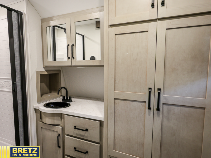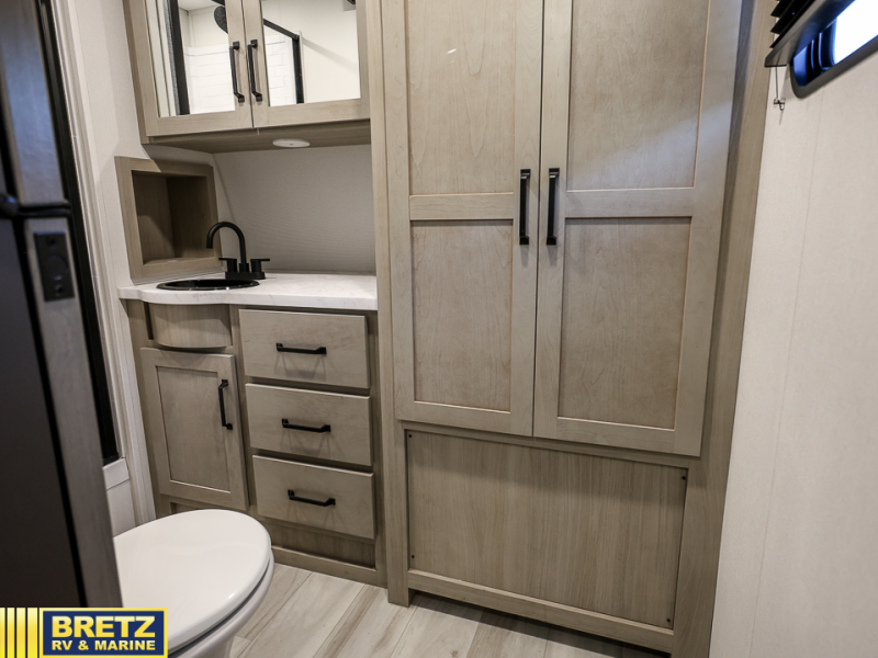 FRONT BATHROOM, THREE BURNER RANGE, & MURPHY BED