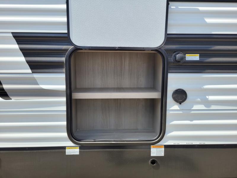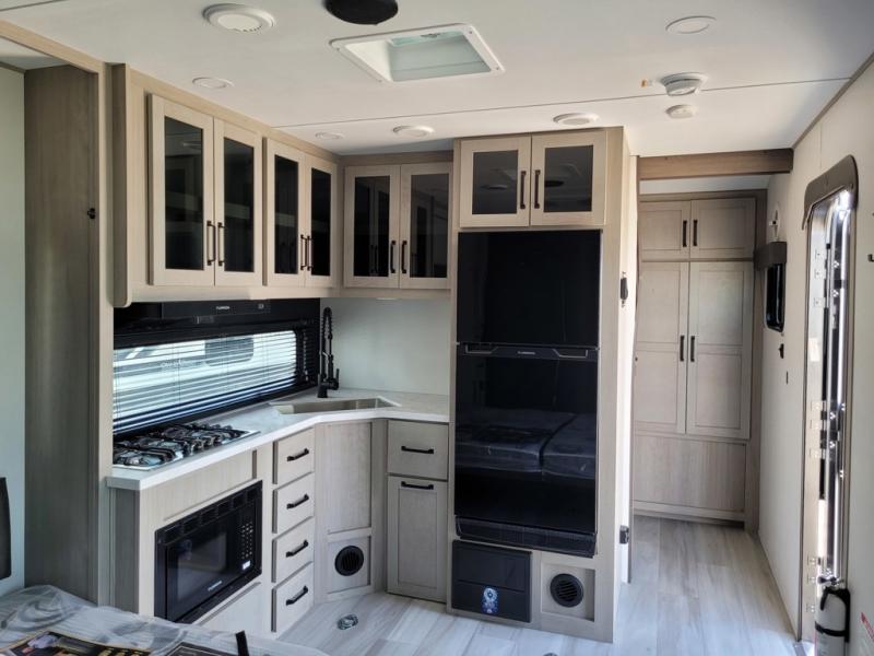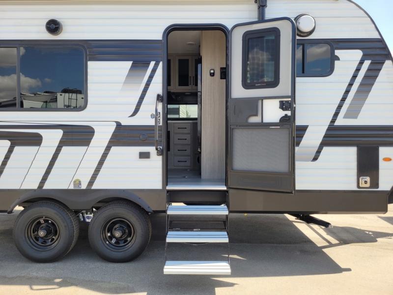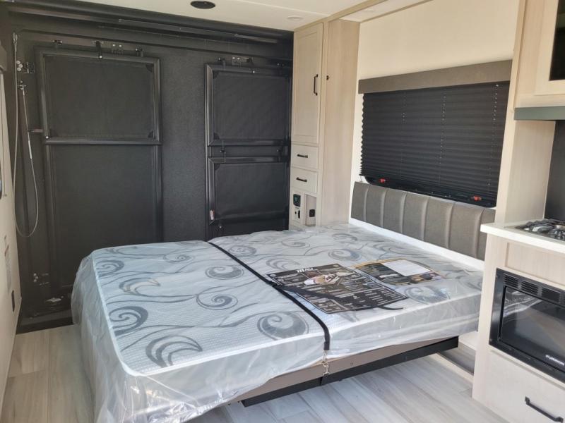 Get ready to take your adventures to the next level with this amazing toy Hauler. A spacious interior features a queen-sized murphy bed, perfect for relaxing after a long day of exploring. A convenient microwave and three-burner cooktop offer endless culinary possibilities, while a 12V 8cu. refrigerator keeps your essentials at the perfect temperature. Ample overhead cabinets provide additional storage for gear, cookware, and more. At the front of this toy hauler, a full bathroom with a closet provides a private retreat, and the ramp door/patio offers easy access to your toys and outdoor living space. Plus, a 13' awning offers shade and protection from the elements.