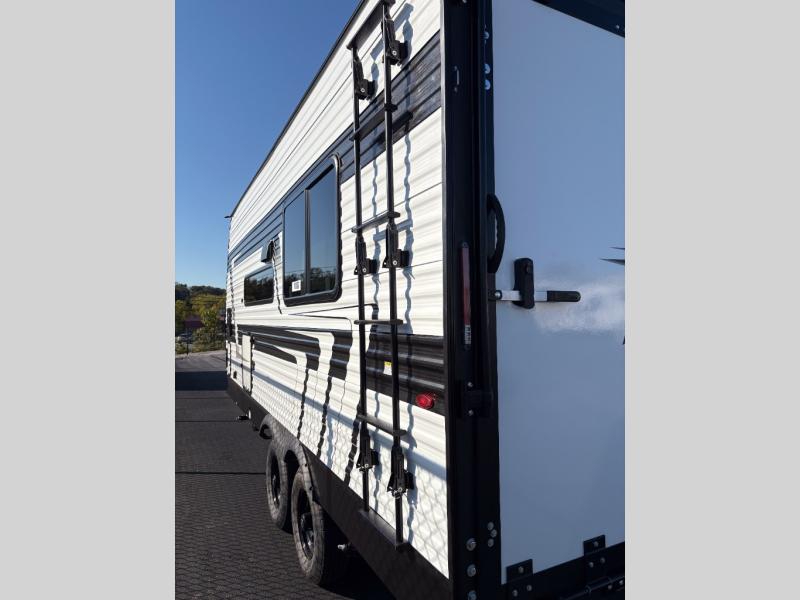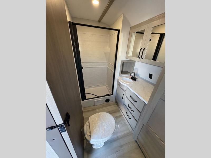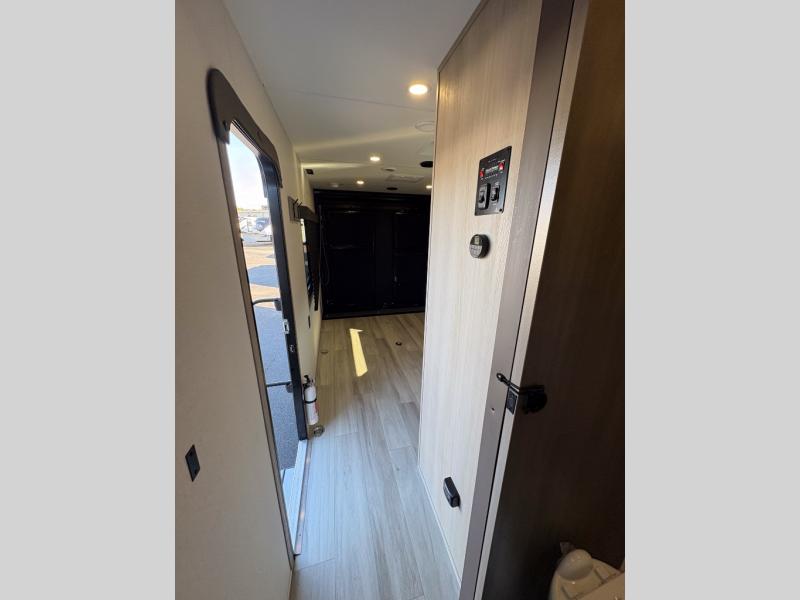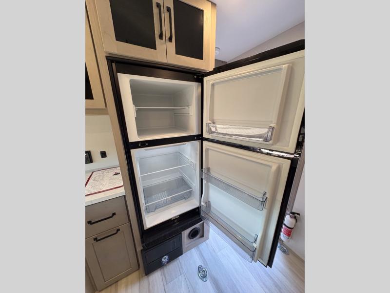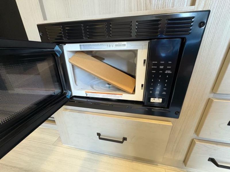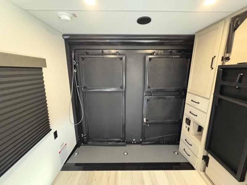 Get ready to take your adventures to the next level with this amazing toy Hauler. A spacious interior features a queen-sized murphy bed, perfect for relaxing after a long day of exploring. A convenient microwave and three-burner cooktop offer endless culinary possibilities, while a 12V 8cu. refrigerator keeps your essentials at the perfect temperature. Ample overhead cabinets provide additional storage for gear, cookware, and more. At the front of this toy hauler, a full bathroom with a closet provides a private retreat, and the ramp door/patio offers easy access to your toys and outdoor living space. Plus, a 13' awning offers shade and protection from the elements.