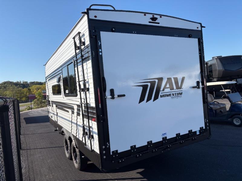 The Momentum MAV toy hauler travel trailers by Grand Design are designed to provide exactly what you need. The spacious garage provides tons of cargo space, with no wheel wells to get in the way. Additional storage includes magnetic storage door catches, and overhead consoles throughout. Conveniences like motion sensor lights and USB outlets will make your life easier, and you will be comfortable in all seasons with the 30K BTU furnace plus 15K BTU ducted air conditioning. The standard Solar Package comes with a 180W solar panel, a 40 Amp charge controller with Bluetooth, and a 12V refrigerator so you can go off-grid when the adventure calls for it.