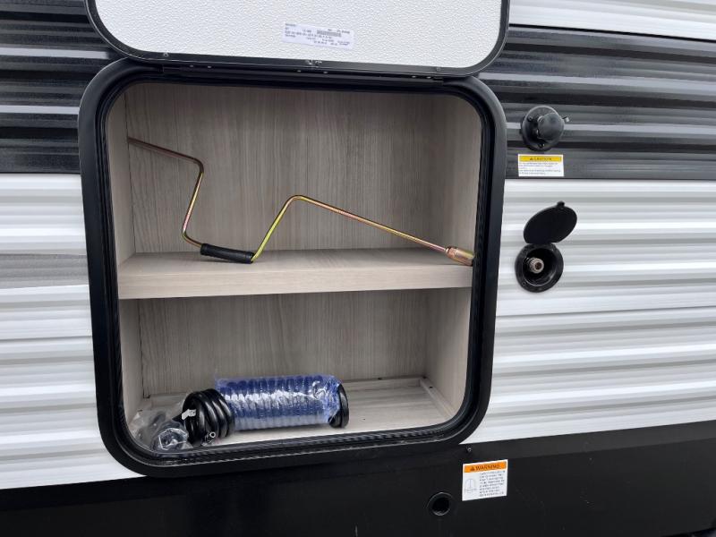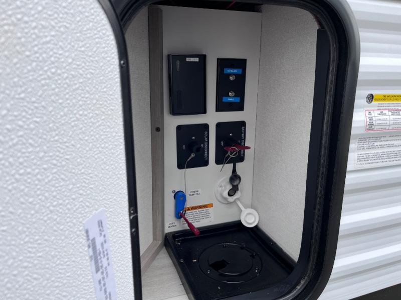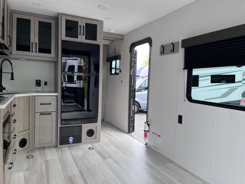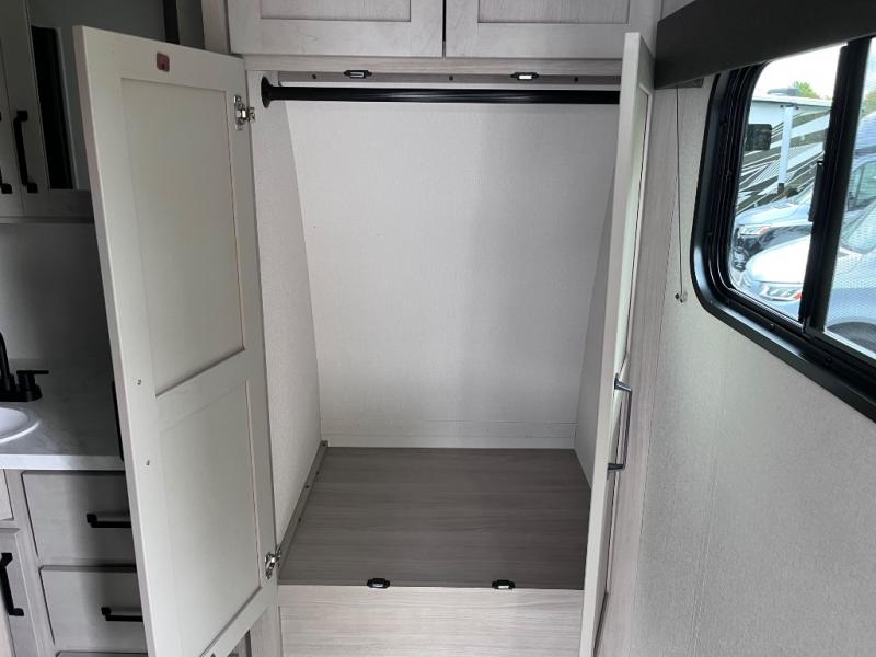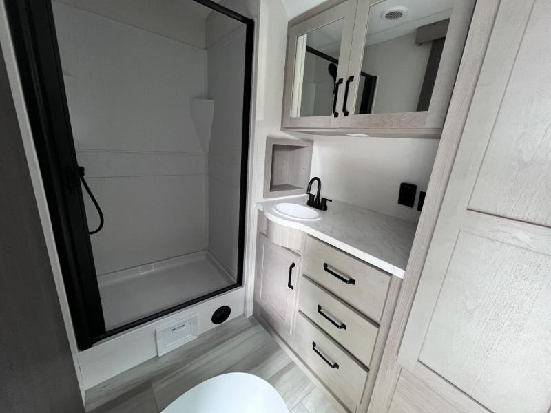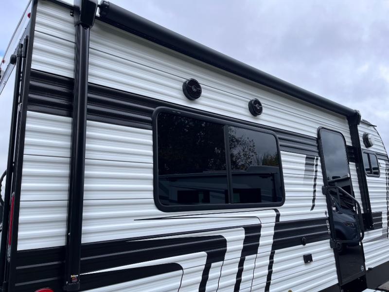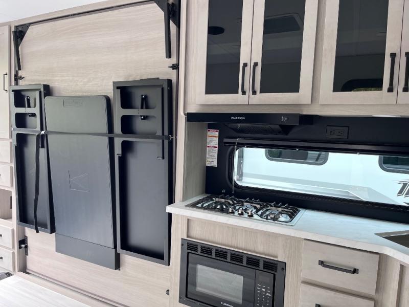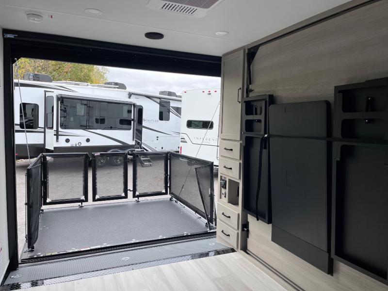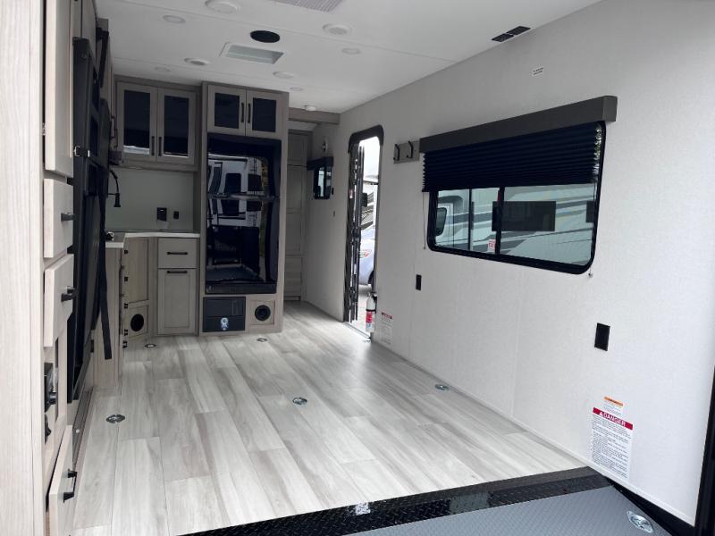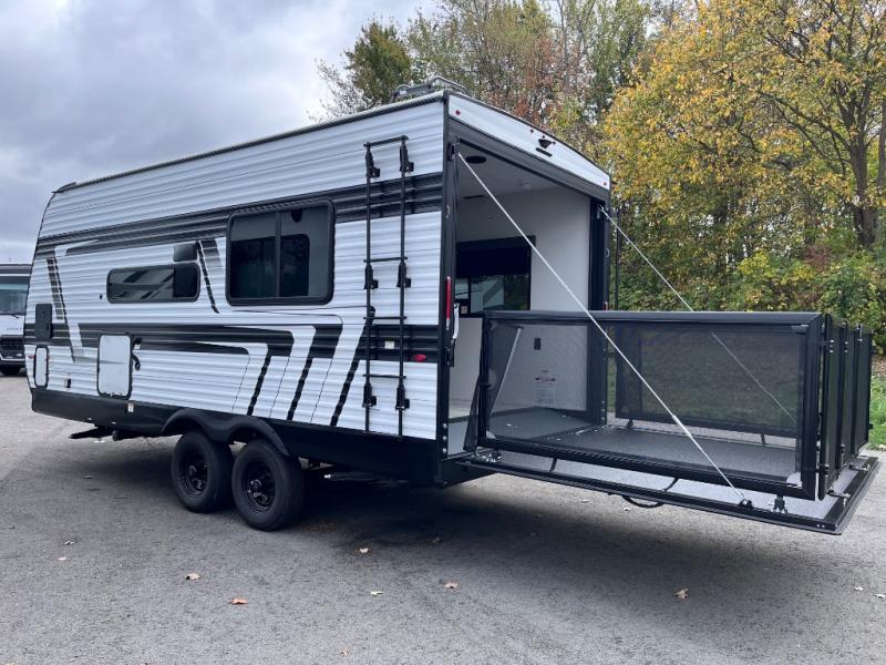 Get ready to take your adventures to the next level with this amazing toy Hauler. A spacious interior features a queen-sized murphy bed, perfect for relaxing after a long day of exploring. A convenient microwave and three-burner cooktop offer endless culinary possibilities, while a 12V 8cu. refrigerator keeps your essentials at the perfect temperature. Ample overhead cabinets provide additional storage for gear, cookware, and more. At the front of this toy hauler, a full bathroom with a closet provides a private retreat, and the ramp door/patio offers easy access to your toys and outdoor living space. Plus, a 13' awning offers shade and protection from the elements.