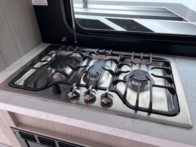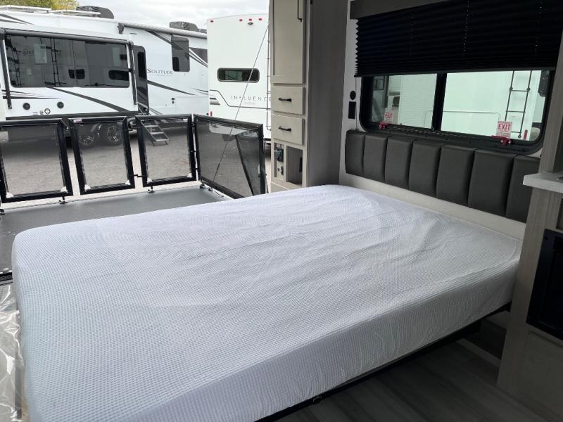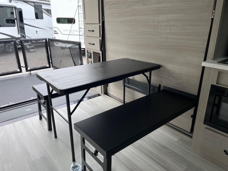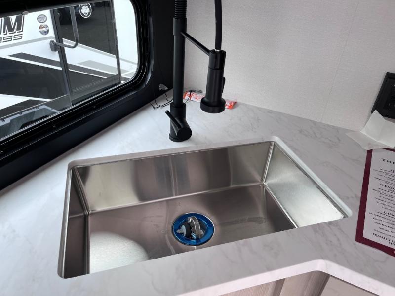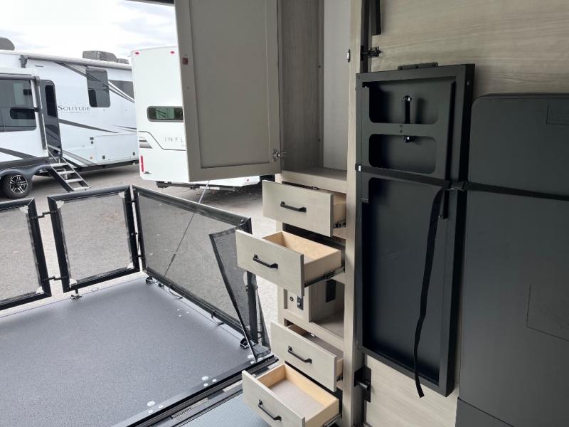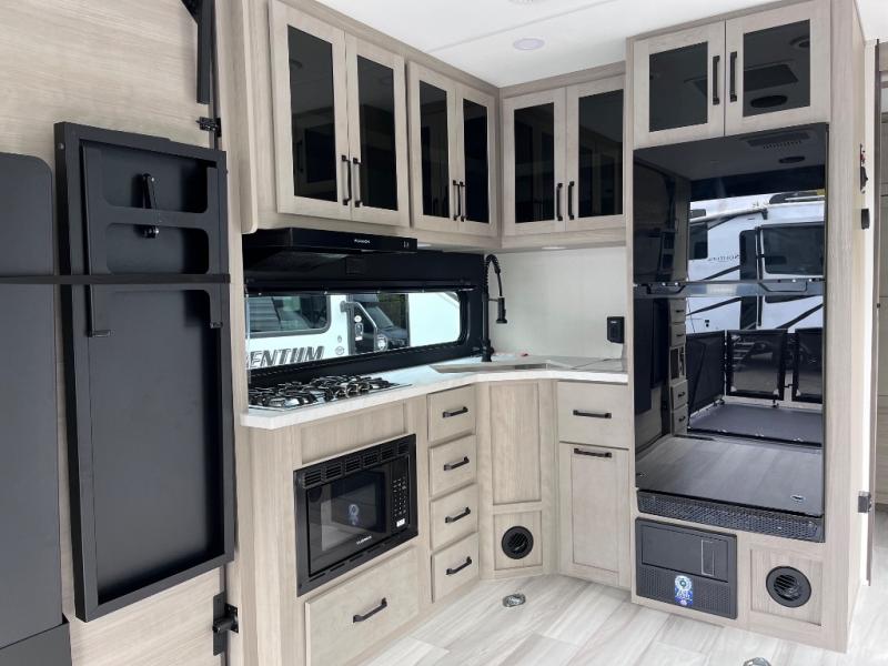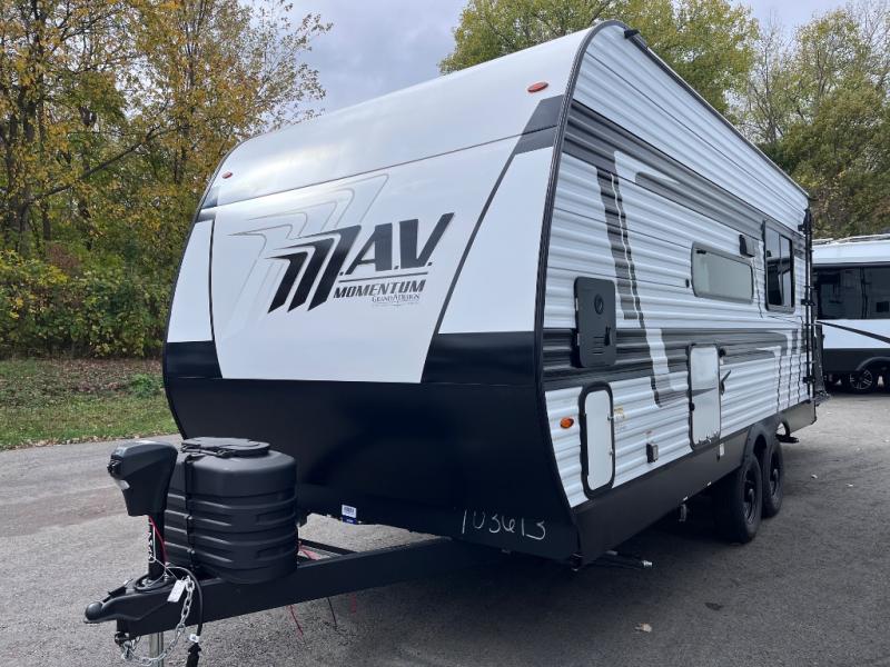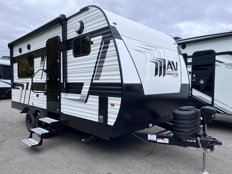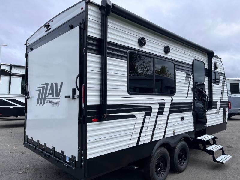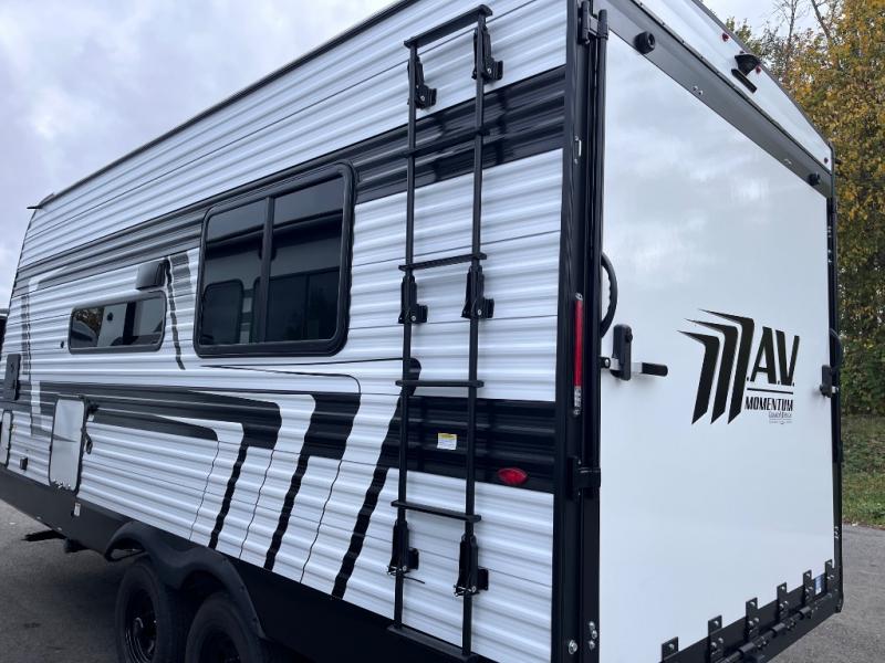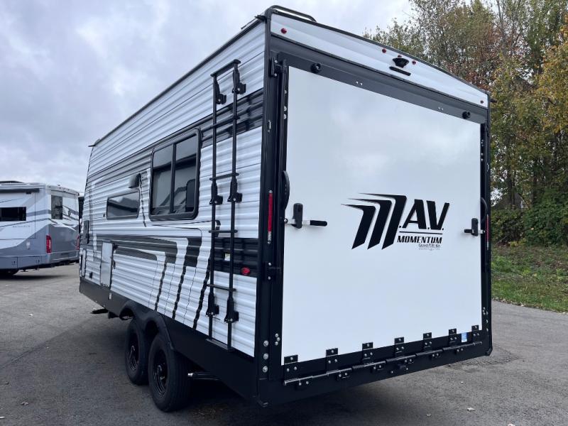 The Momentum MAV toy hauler travel trailers by Grand Design are designed to provide exactly what you need. The spacious garage provides tons of cargo space, with no wheel wells to get in the way. Additional storage includes magnetic storage door catches, and overhead consoles throughout. Conveniences like motion sensor lights and USB outlets will make your life easier, and you will be comfortable in all seasons with the 30K BTU furnace plus 15K BTU ducted air conditioning. The standard Solar Package comes with a 180W solar panel, a 40 Amp charge controller with Bluetooth, and a 12V refrigerator so you can go off-grid when the adventure calls for it.