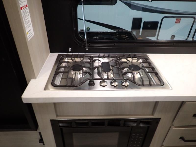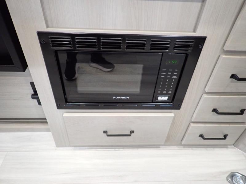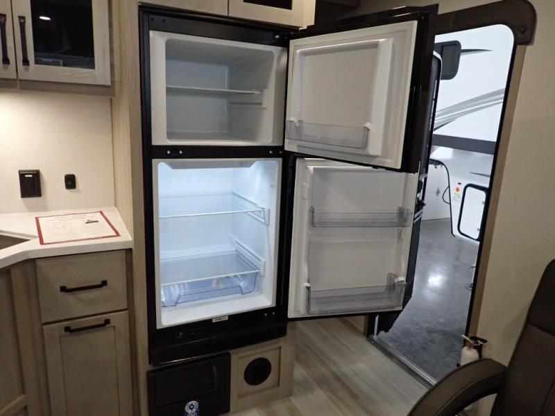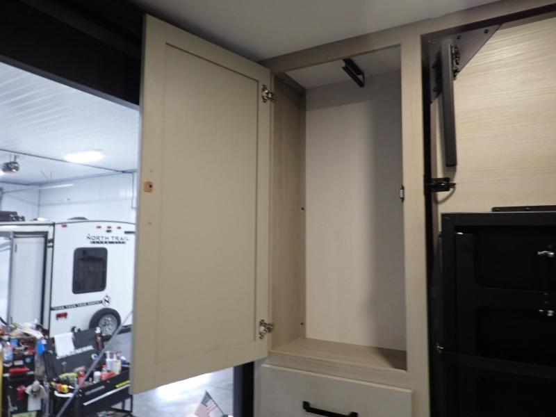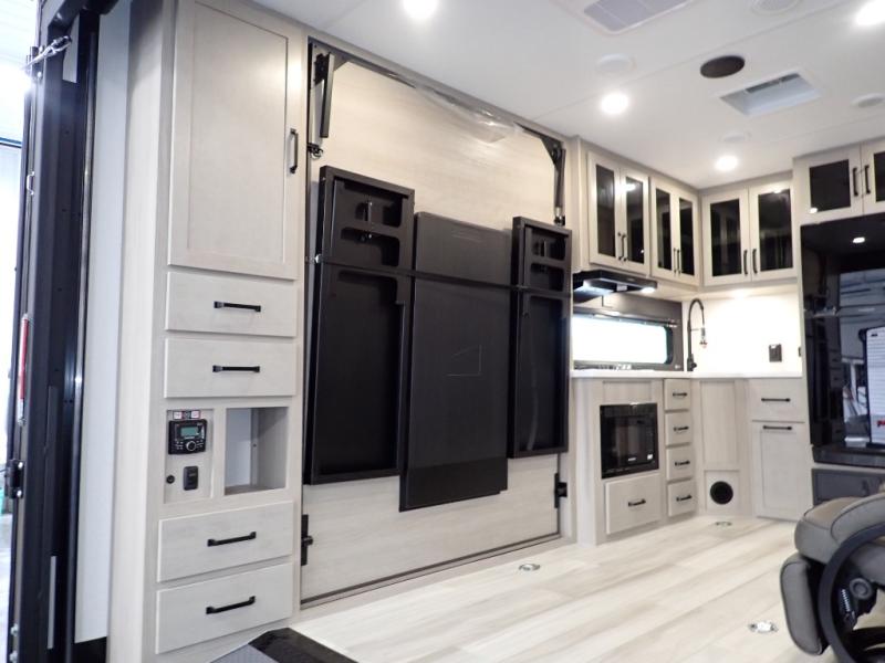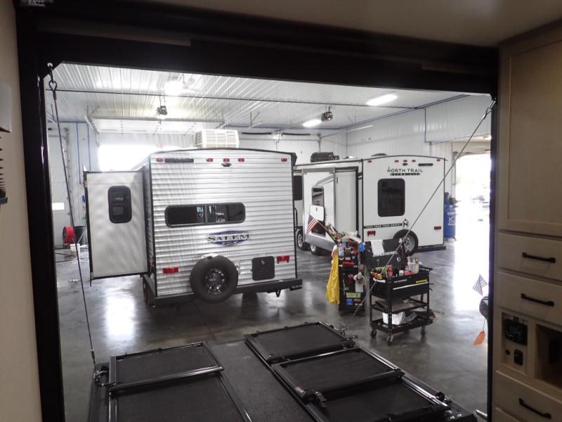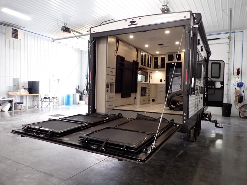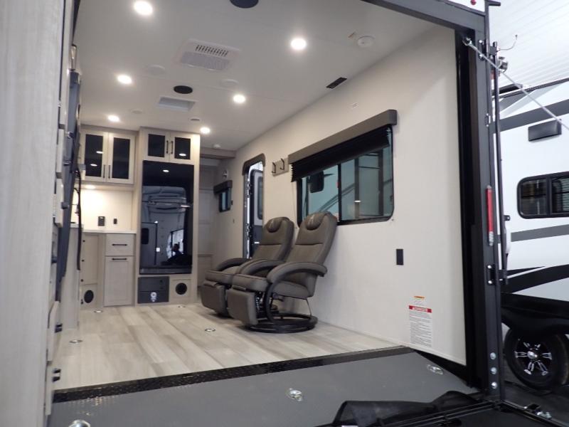 Get ready to take your adventures to the next level with this amazing toy Hauler. A spacious interior features a queen-sized murphy bed, perfect for relaxing after a long day of exploring. A convenient microwave and three-burner cooktop offer endless culinary possibilities, while a 12V 8cu. refrigerator keeps your essentials at the perfect temperature. Ample overhead cabinets provide additional storage for gear, cookware, and more. At the front of this toy hauler, a full bathroom with a closet provides a private retreat, and the ramp door/patio offers easy access to your toys and outdoor living space. Plus, a 13' awning offers shade and protection from the elements.